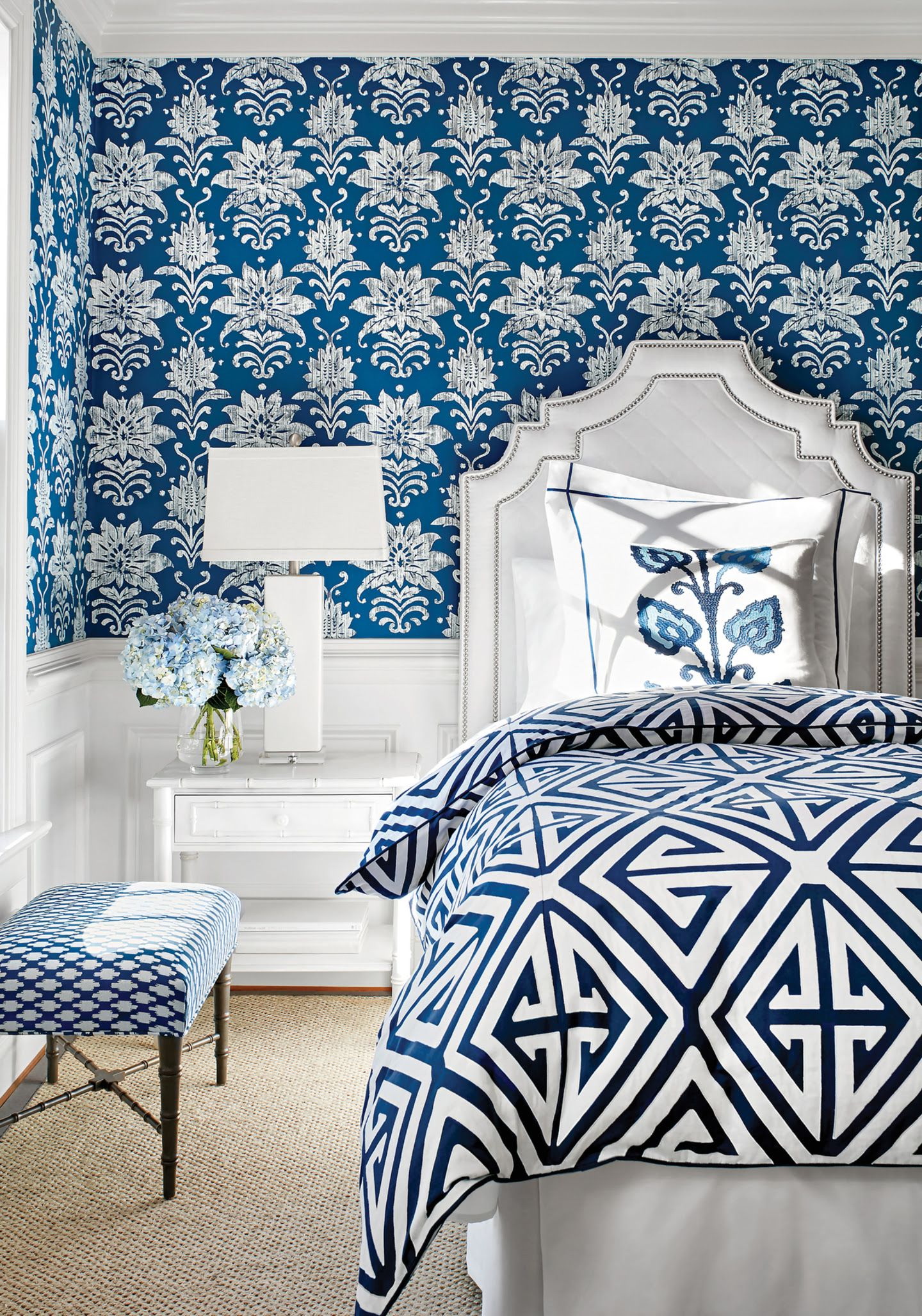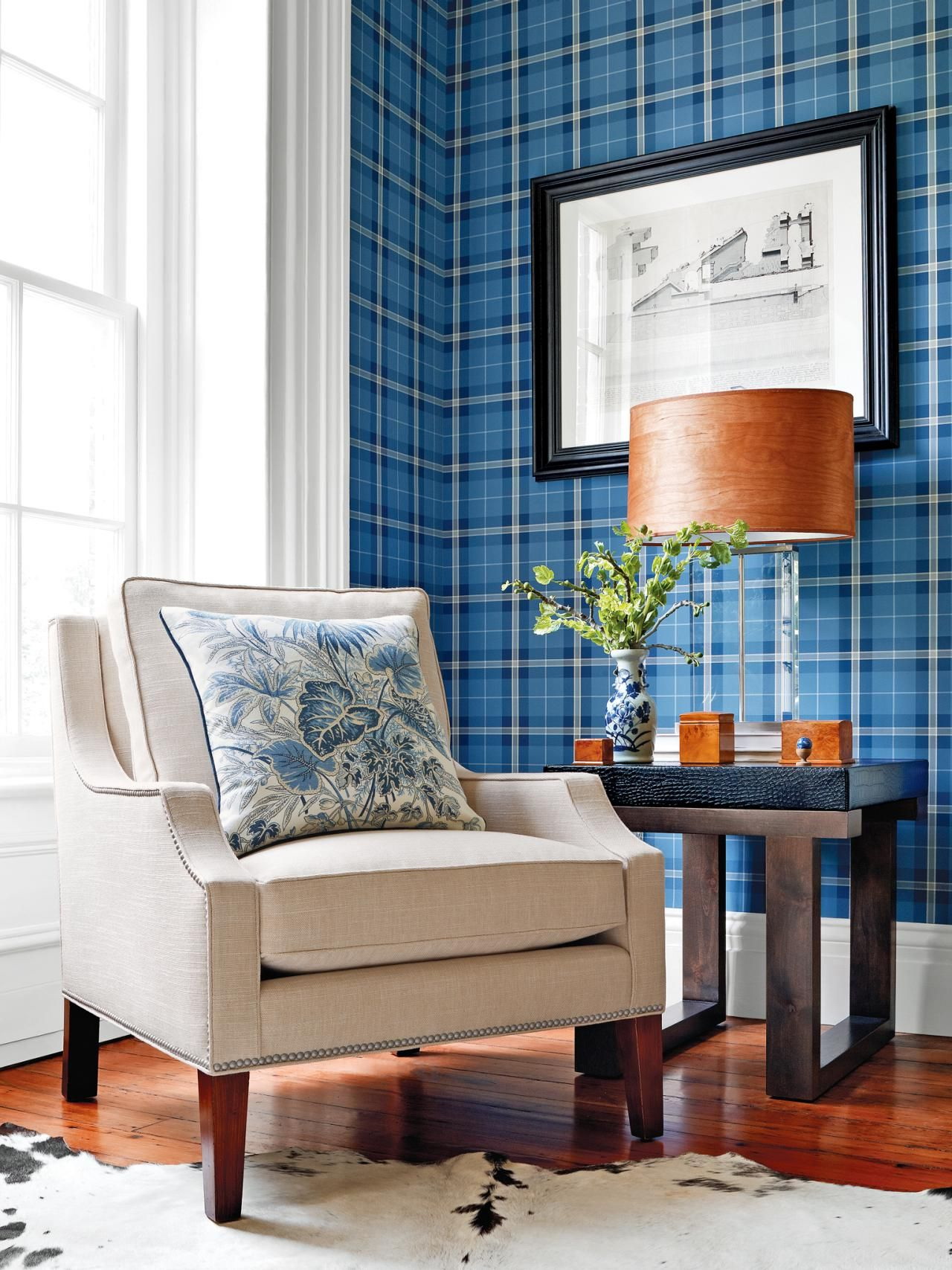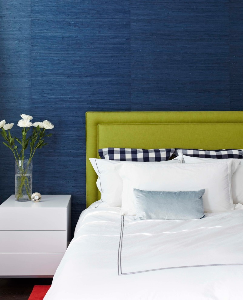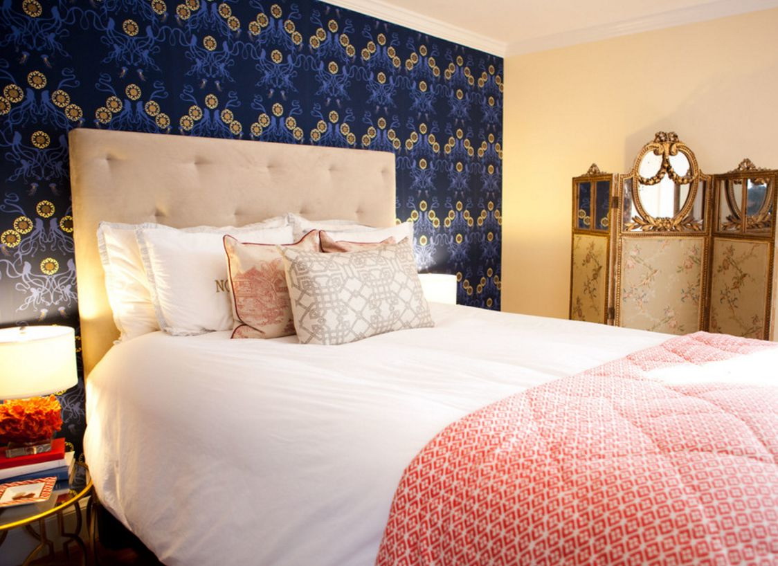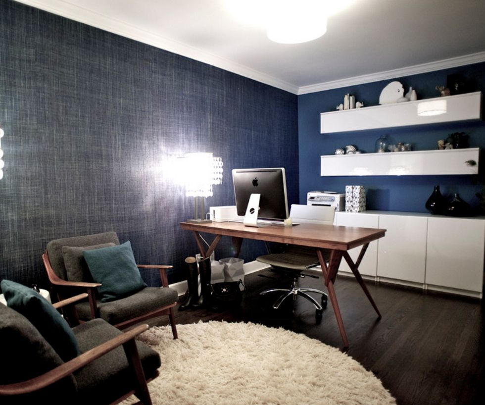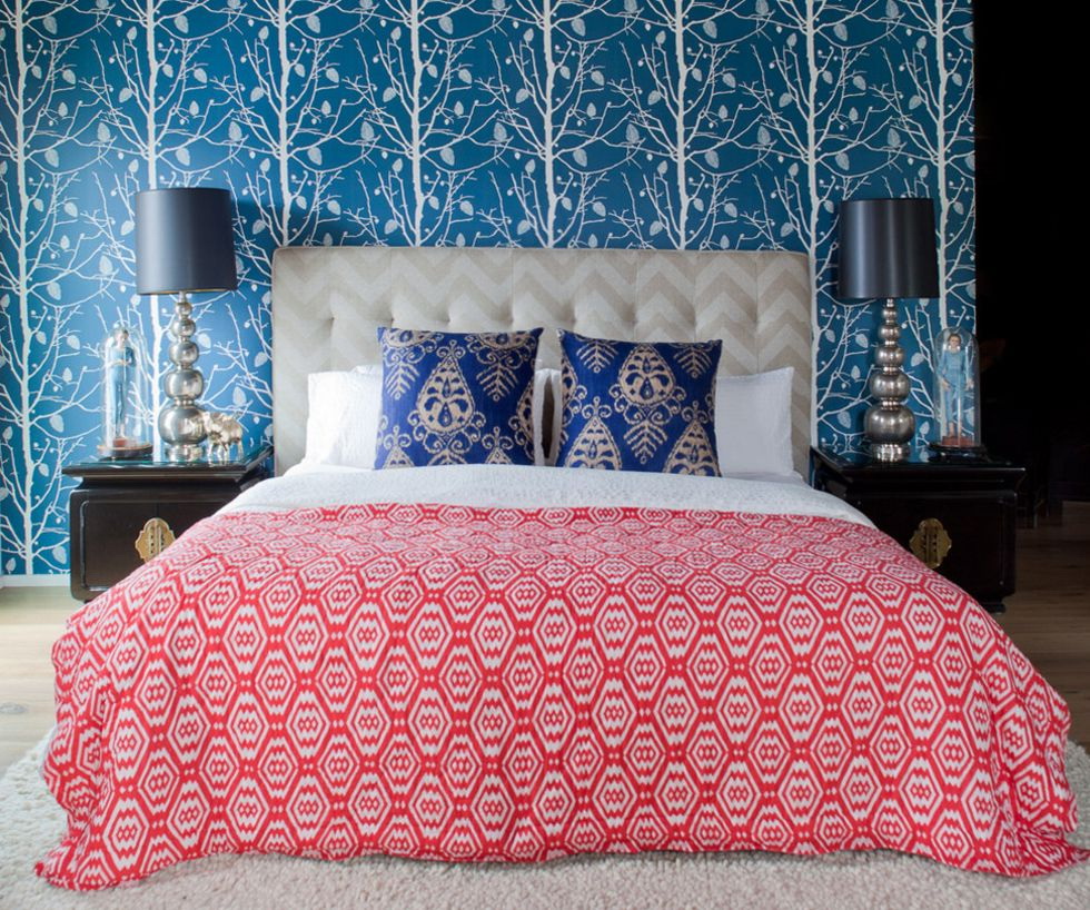 - Estilo moderno denim é usar texturas interessantes de estofos, como denim e papel de parede têxtil.