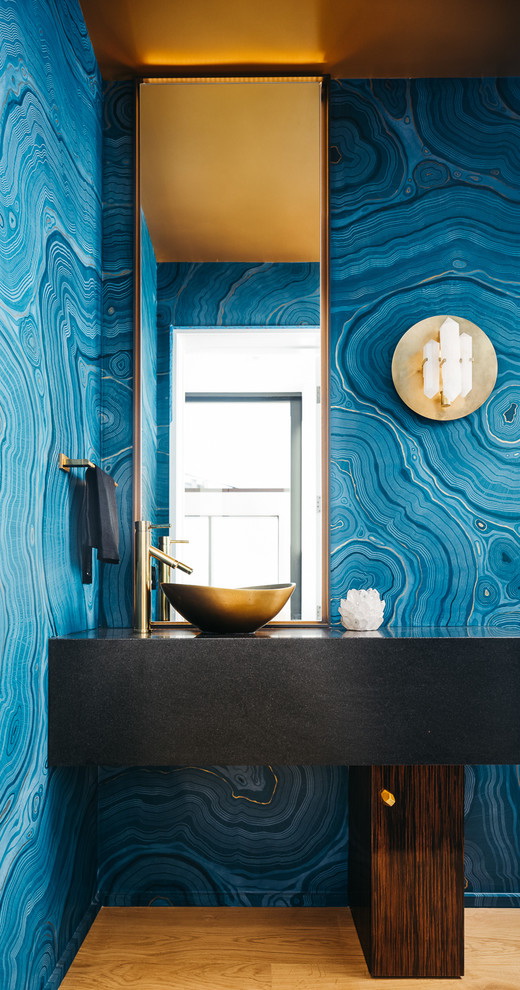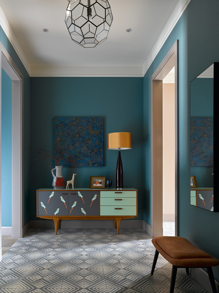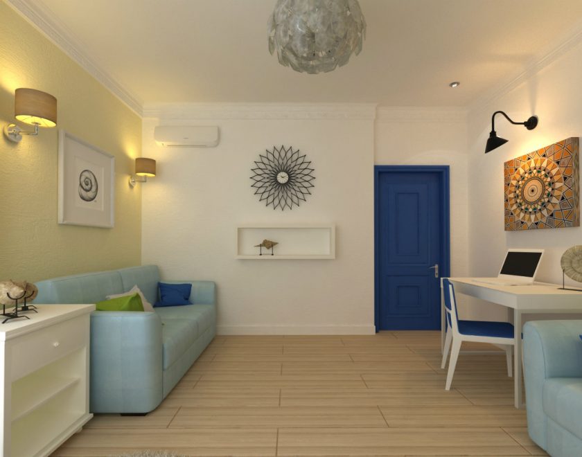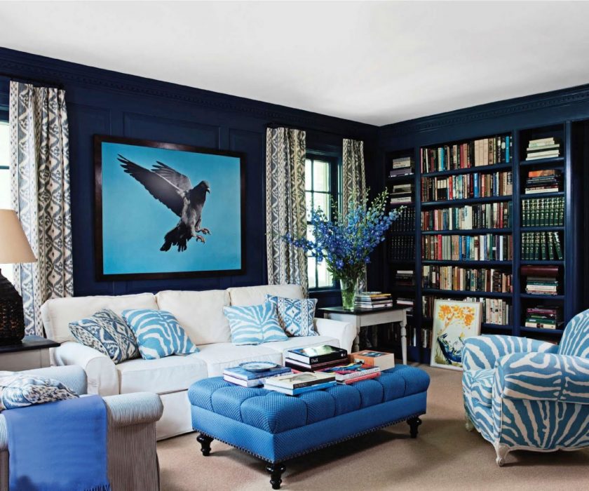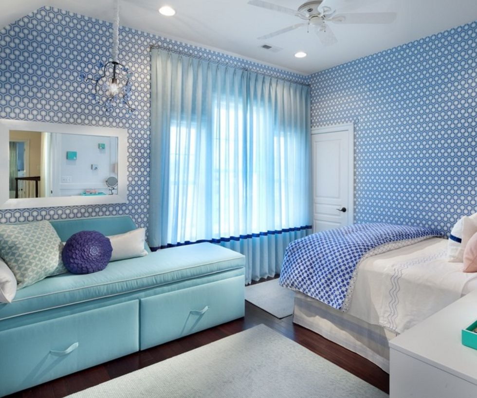 Azul é considerado um tom de relaxamento, satura o interior com frescor, leveza e dá profundidade. Estar em tal sala, uma pessoa se livrar das ansiedades e pensamentos negativos que estão pressionando sobre ele. O interior é envolvido por sua frieza e tranquilidade.