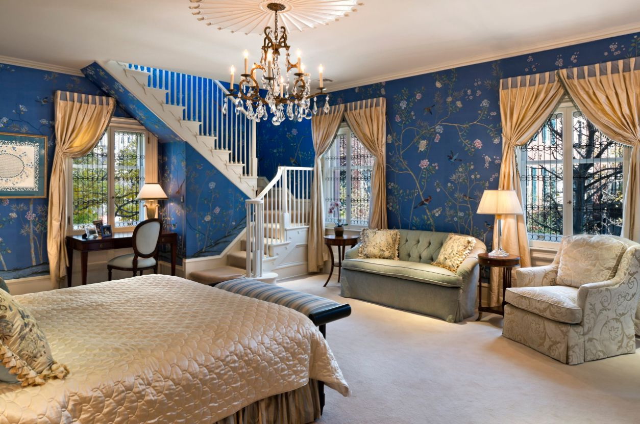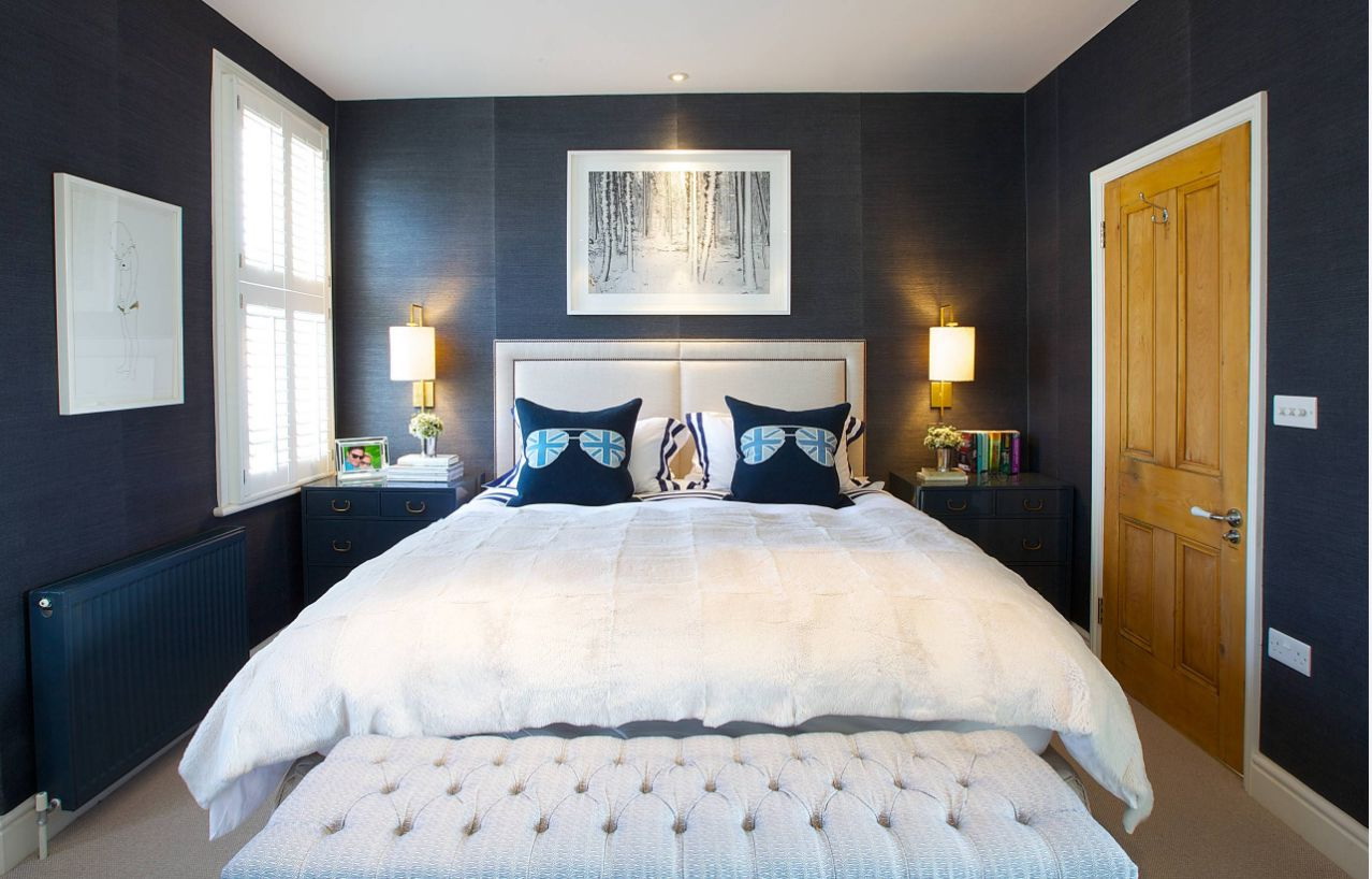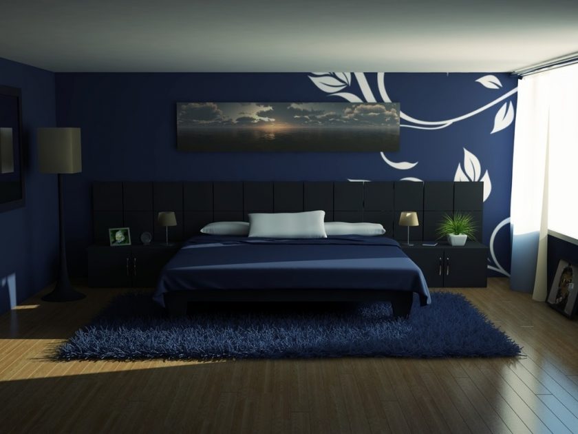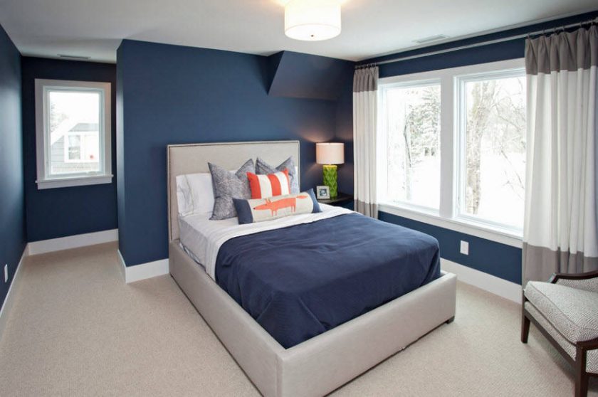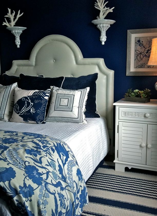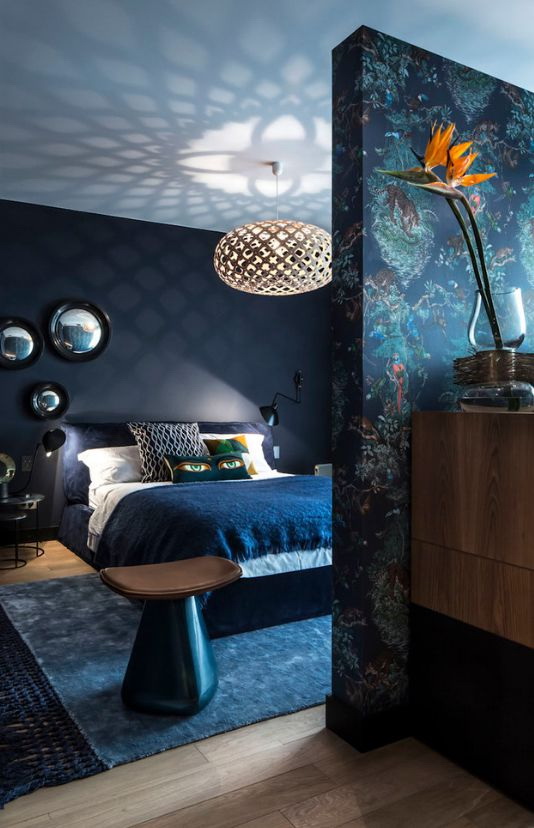 Quem disse que o azul nas paredes do quarto - é escuro? Sombra profunda nas paredes e até mesmo o teto parece contido, aristocrático e elegante. Mas ainda assim, os designers recomendam escolher um tom mais relaxado para que o quarto possa se livrar de pensamentos perturbadores e ter um bom descanso.