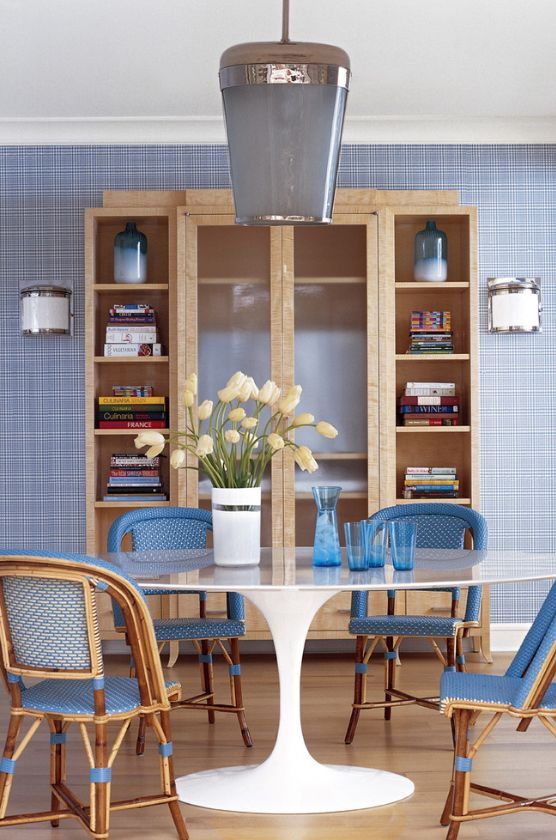 - Você pode usar sombra como um acento para animar e remover a frieza extra. Para isso você pode comprar toalhas de mesa azuis, a mesa, cadeiras, artigos decorativos.