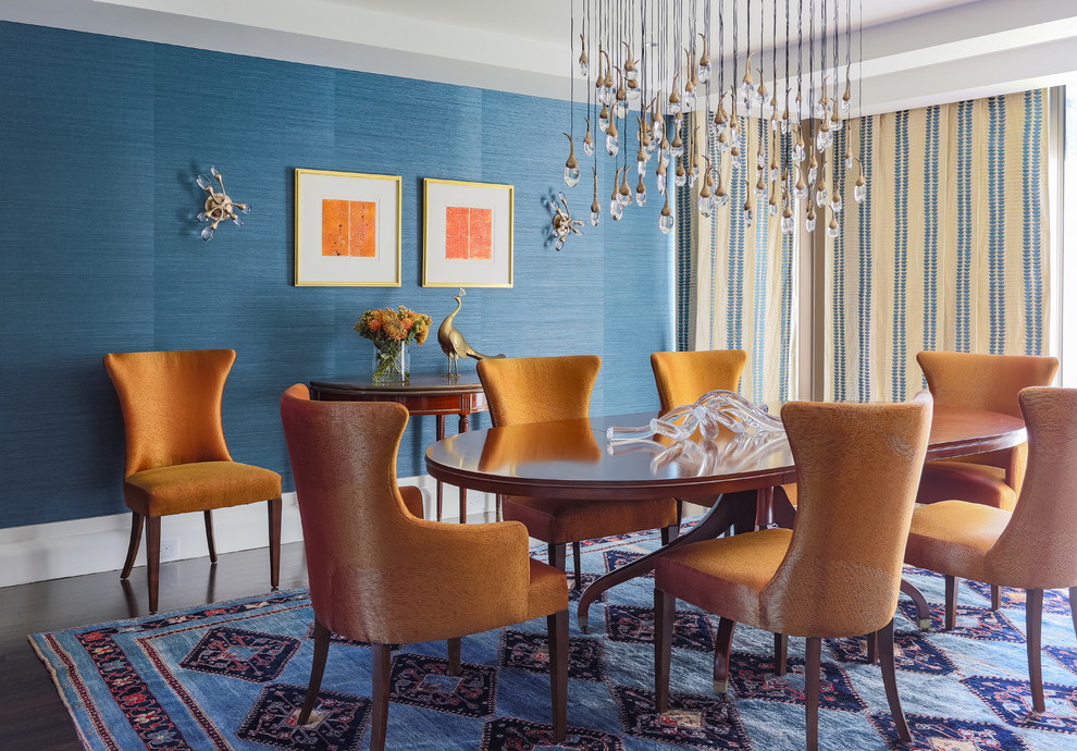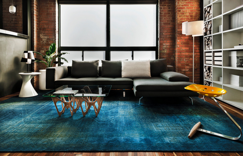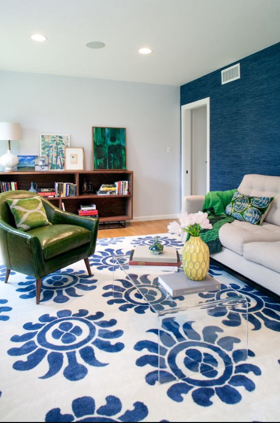 Os tapetes azuis em combinação com a cor básica branca, amarela, marrom e bege harmoniosamente parecem sujeitos à disponibilidade de acessórios da sombra semelhante. Padrões orientais ficam ótimos na cor escolhida. O produto estará em harmonia com o mobiliário de madeira, é adequado para estilos modernos e clássicos.