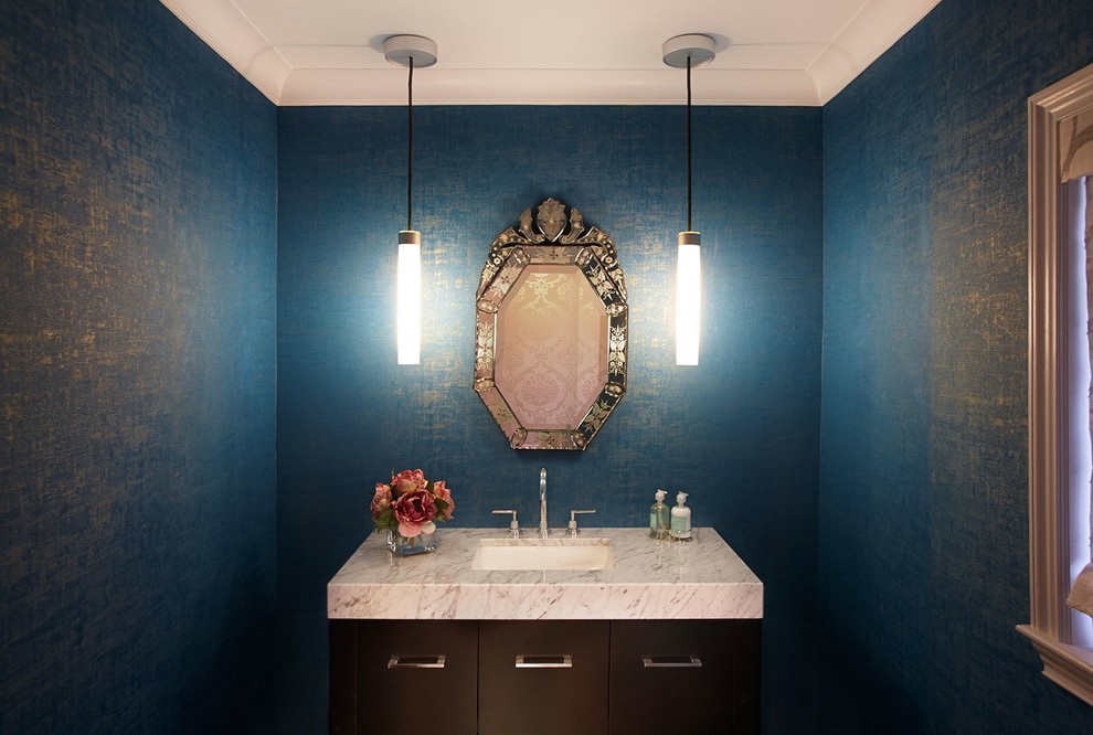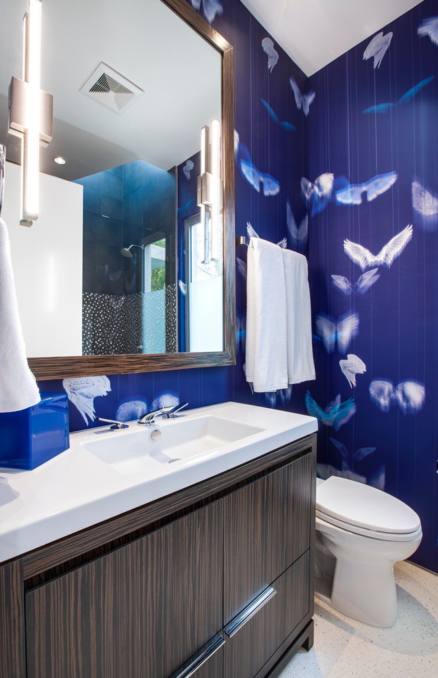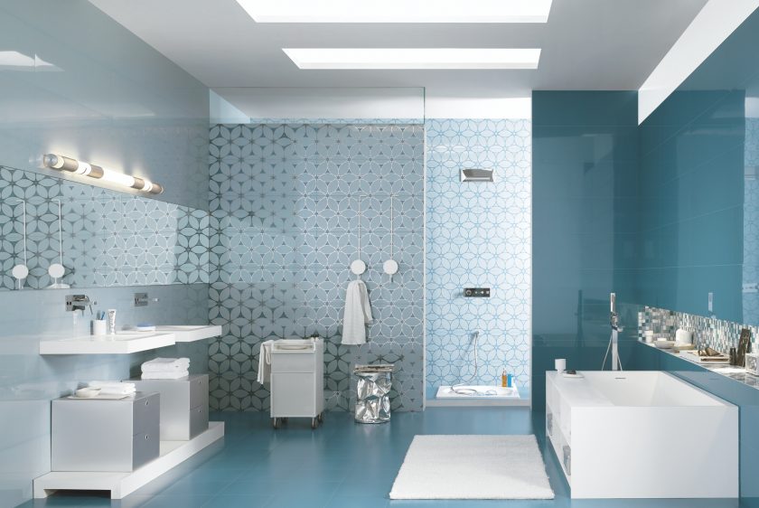 Nesta sala, você pode usar muitas técnicas de combinação de cores, usando diferentes tons do principal. Recepções para decorar o banheiro: