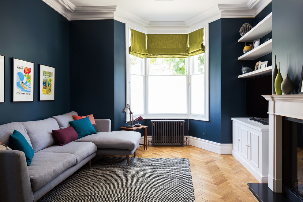 Saturado azul escuro e cinza claro criam um certo contraste, que não estará gritando. É por isso que a combinação será sempre harmoniosa e agradável.
