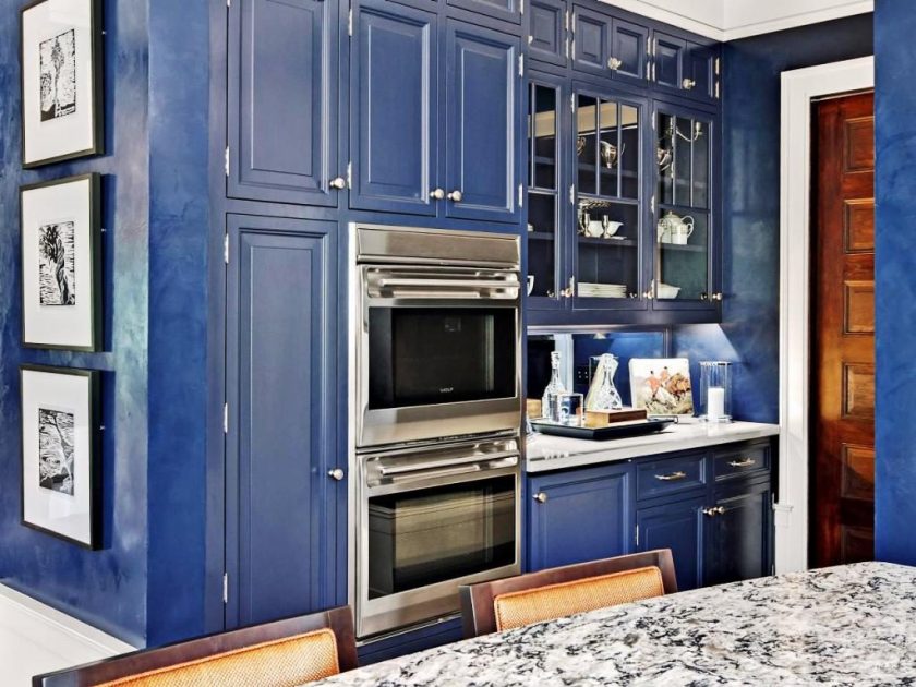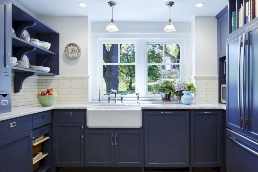 Escolher a cor do céu noturno para a cozinha não é a solução mais padrão. As pessoas tentam não experimentar nesta sala com cores brilhantes, preferindo tons mais práticos. A desvantagem da cozinha é suprimir o apetite.
