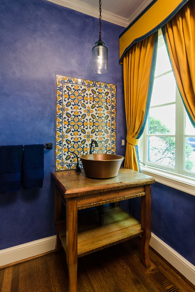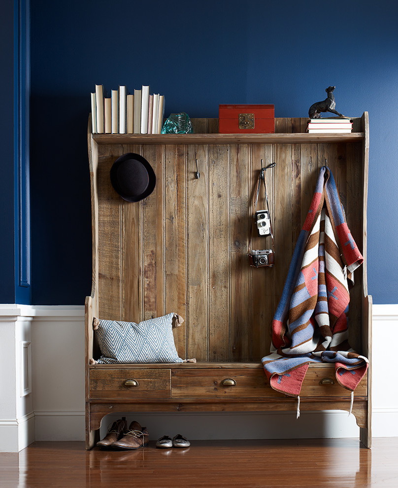 - Estilo country é o uso de tons de amarelo e azul centáurea em objetos e acessórios contra o fundo de paredes azuis.