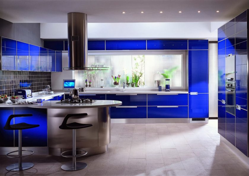 - Um conjunto de cozinha pode ser comprado para a cozinha, onde as cores acompanhantes de azul estão envolvidas na decoração. Deve-se ter cuidado ao escolher móveis com fachadas brilhantes, porque eles aumentam a sensação de frio. Tons clássicos escuros são adequados para o estilo clássico e para outros modernos - qualquer outro, mesmo brilhante.