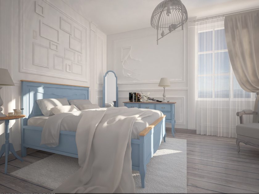 Para o estilo provençal, você pode escolher uma simples cama de madeira, pintada na sombra desejada completamente. No estilo clássico cabe a cama com uma cabeceira chique de veludo azul.