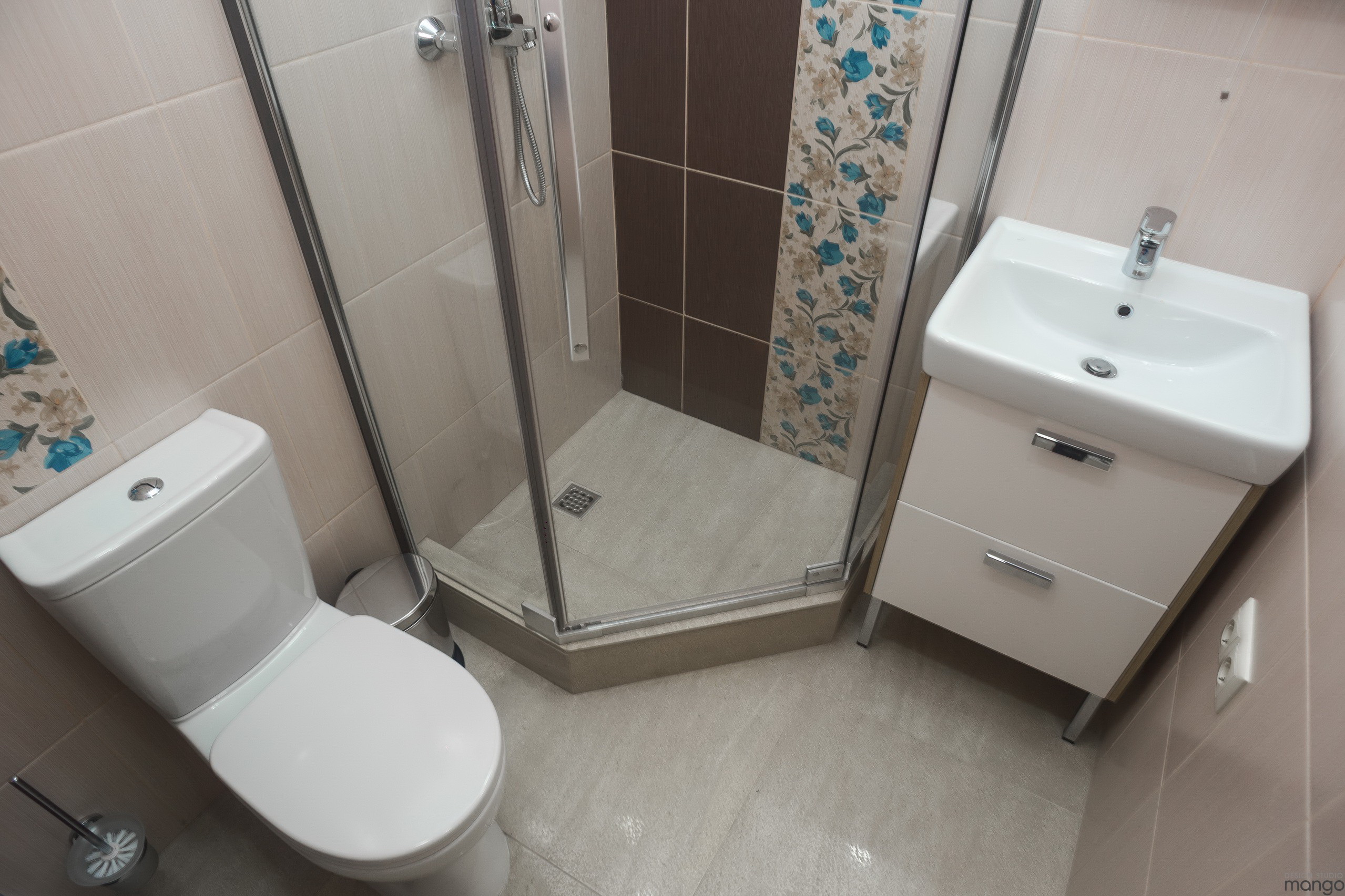 Um pequeno lugar é ocupado por uma cabine de duche com hidromassagem, filtro, rádio e outros dispositivos modernos.
