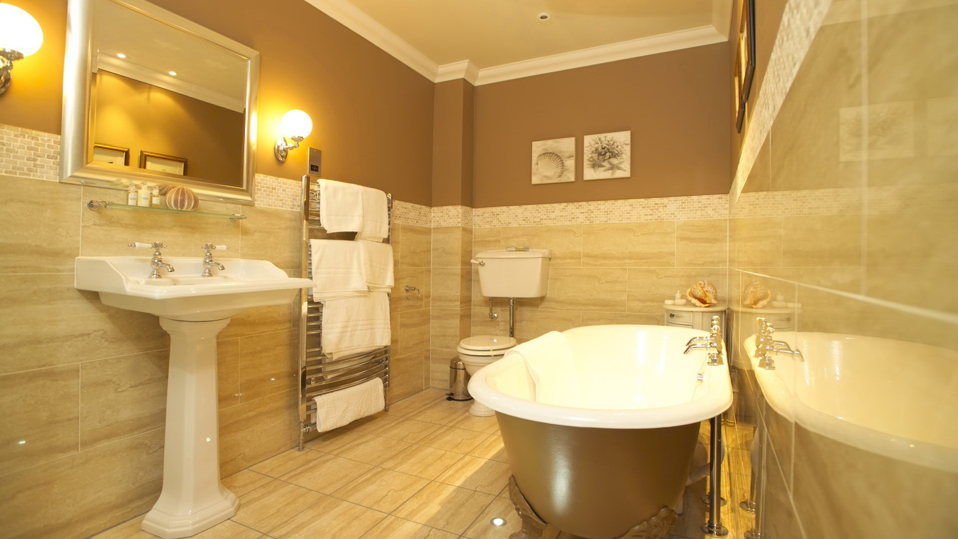 Cor oriental de encanamento e bancada de mármore, misturadores de fantasia, aquecedor de toalhas, bacia em forma de pélvis, chuveiro regador de geometria de cobre estão sublinhados.