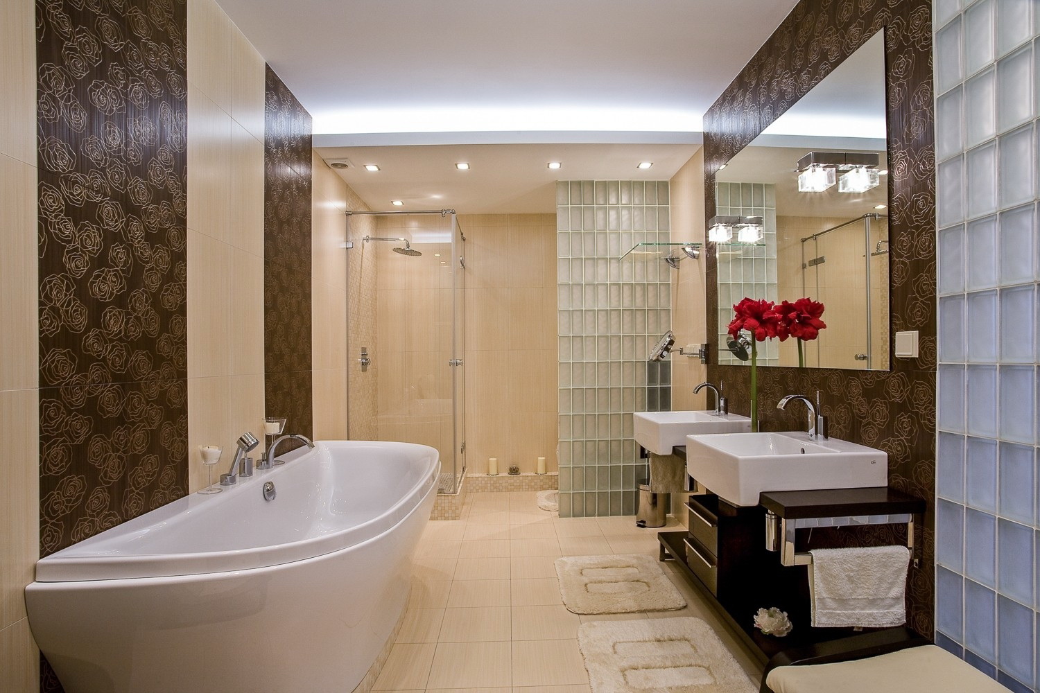 Para iluminar este luxo são utilizadas inúmeras lâmpadas em nichos abertos. Uma nuance importante é a ausência de superfícies espelhadas.