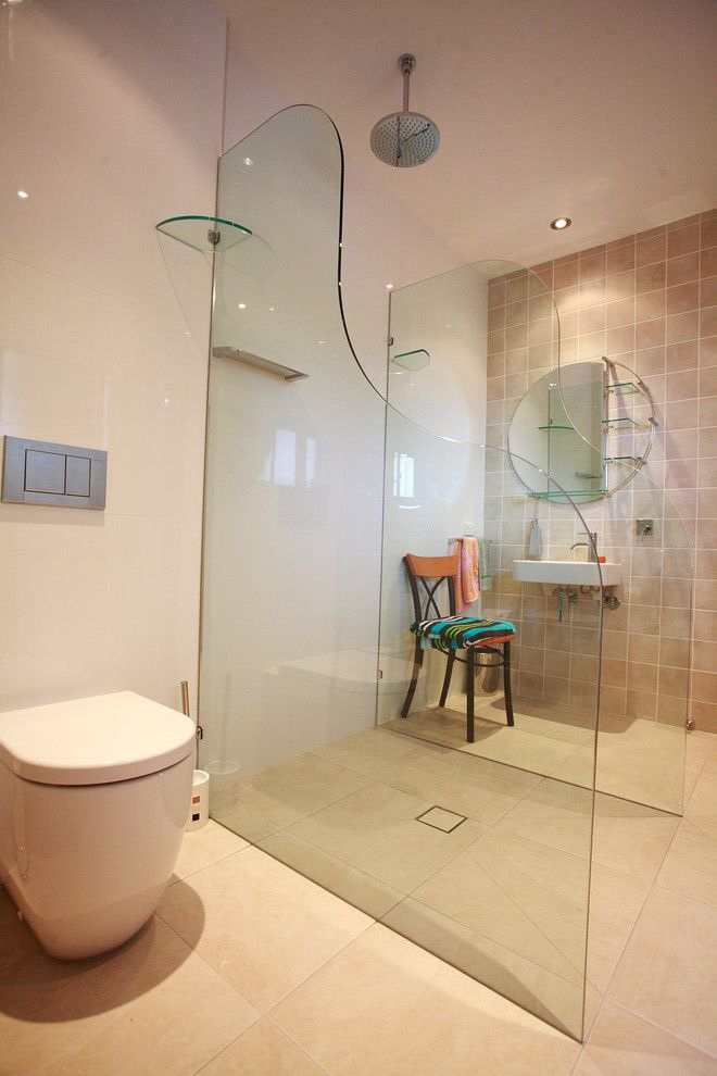 Superfícies transparentes não esmagam o espaço, e o design no mesmo estilo com a superfície das paredes do banheiro ajuda a enfatizar a integridade da composição do espaço.