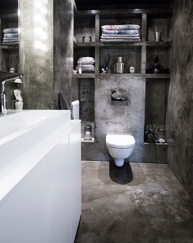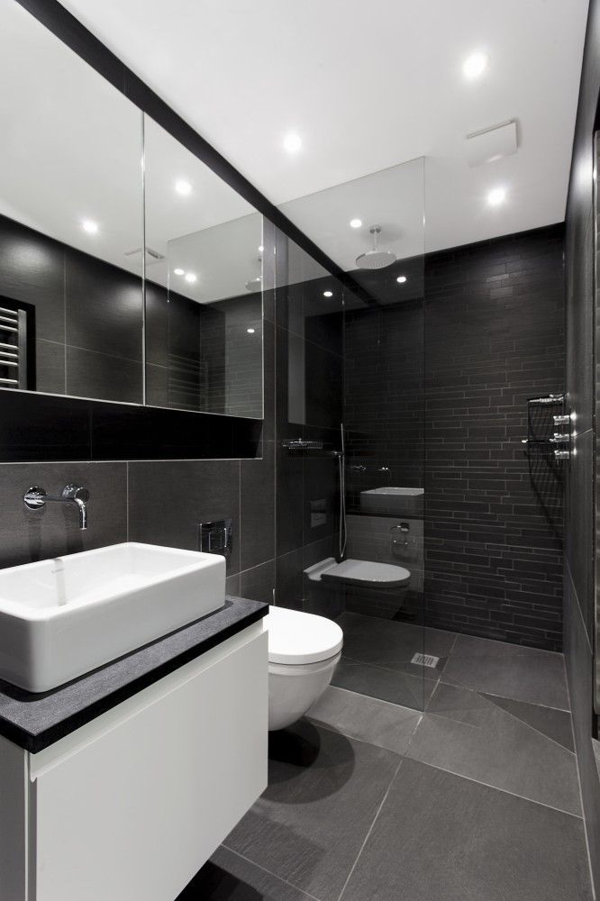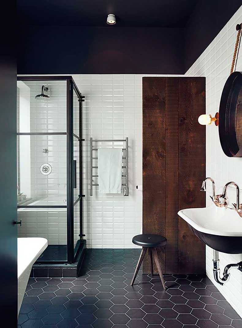 - O contraste incomum de uma escura, outra parede de luz adiciona visualmente centímetros à altura do banheiro.