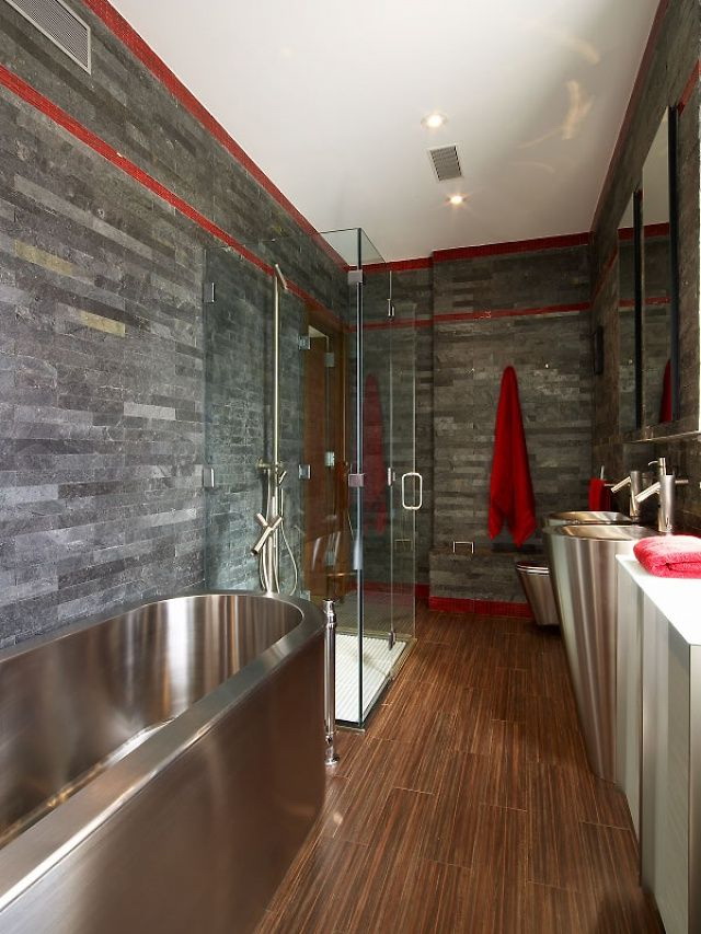 - É melhor construir uma lareira em um banheiro espaçoso na parede.