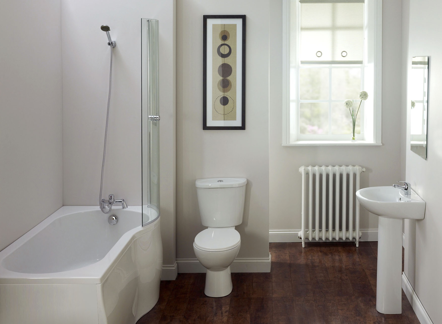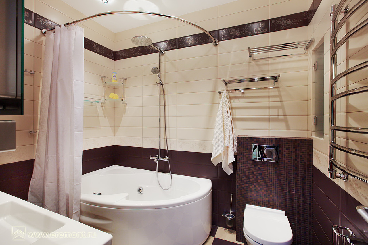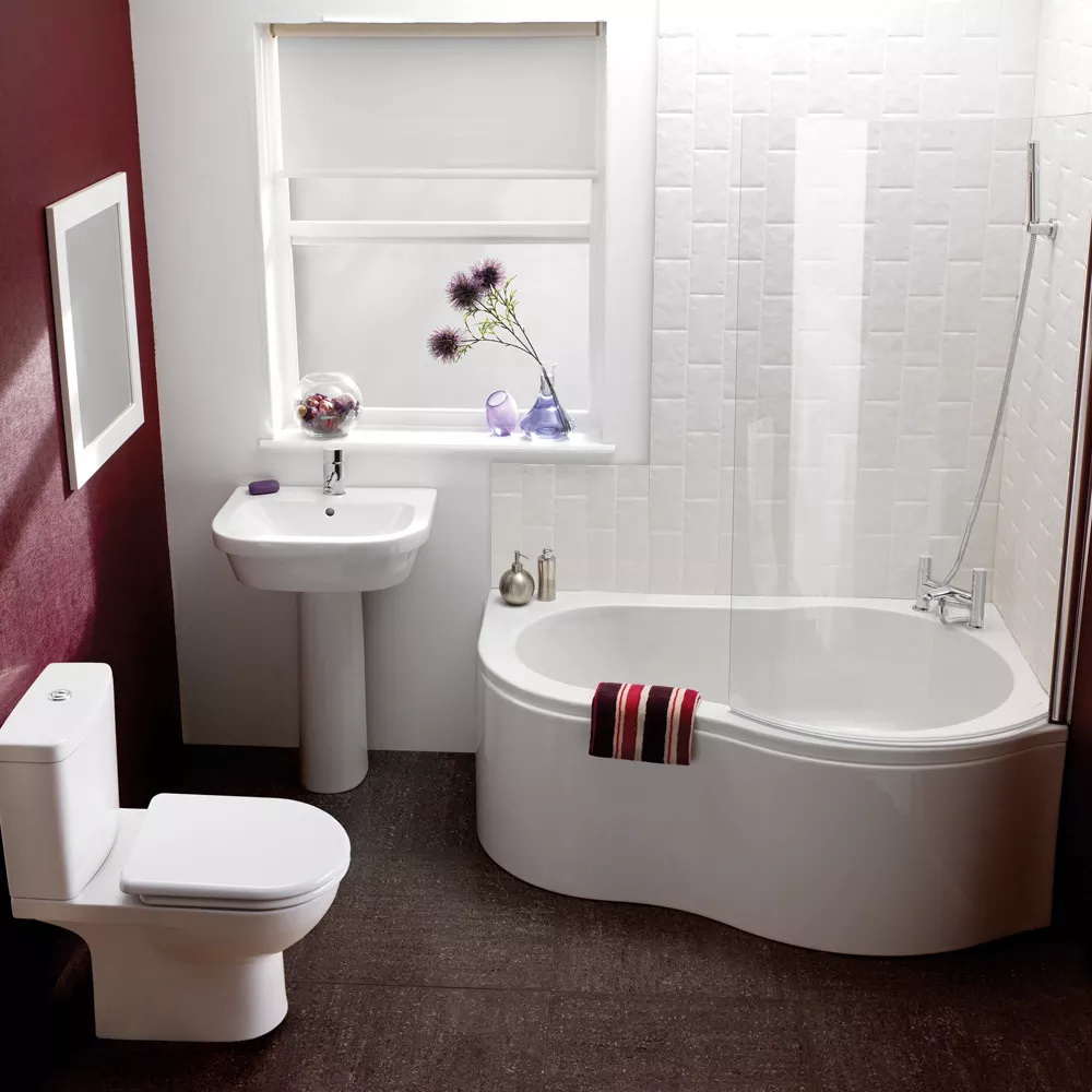 Para um quarto estreito e longo posicionamento ideal de encanamento ao longo das paredes. Nos quartos espaçosos - banho com pernas no centro. O melhor lugar para um chuveiro é um dos cantos da sala.