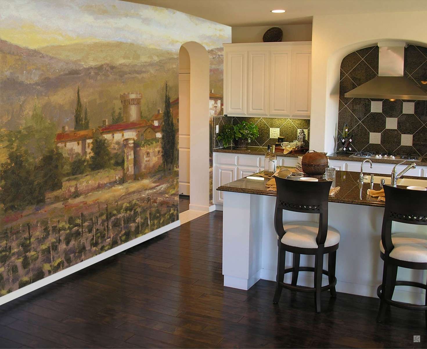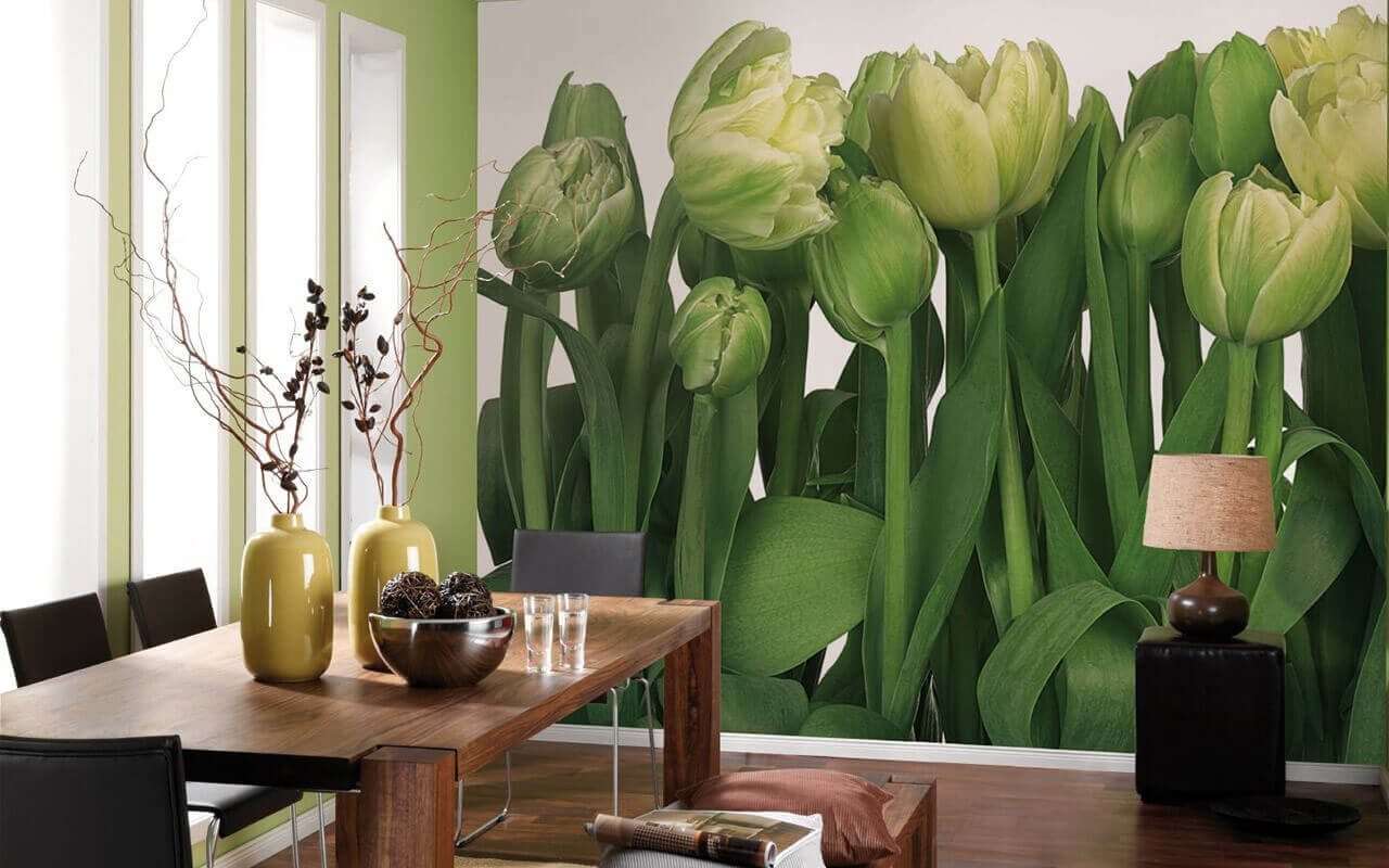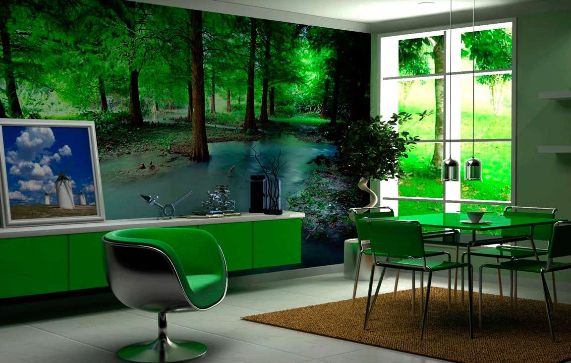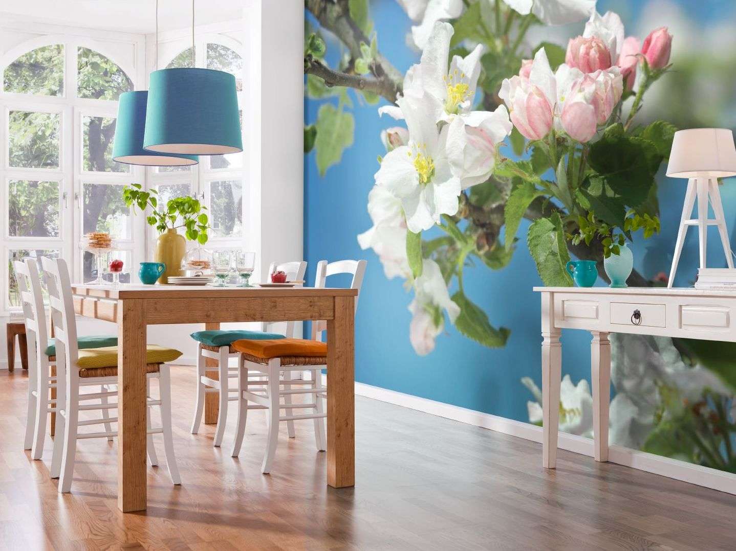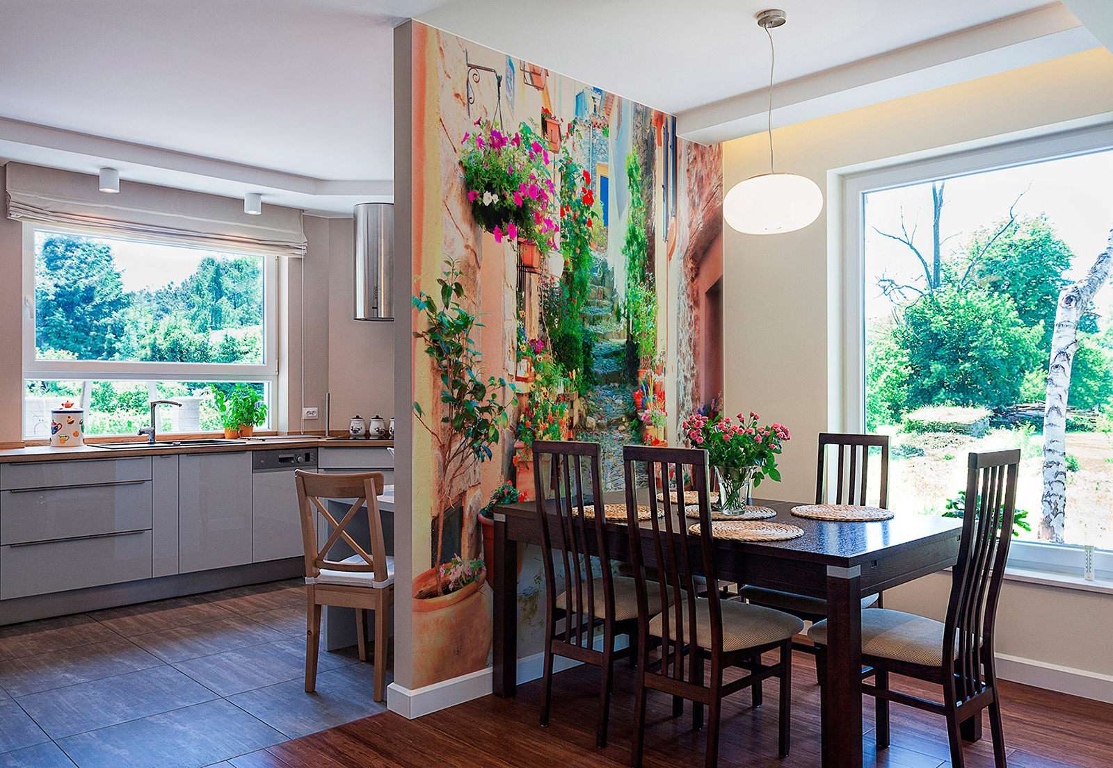 Mural de parede na área de jantar também será válido. O enredo deles deve corresponder ao estilo: