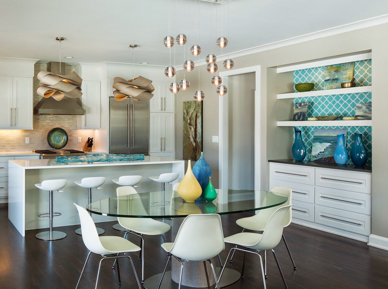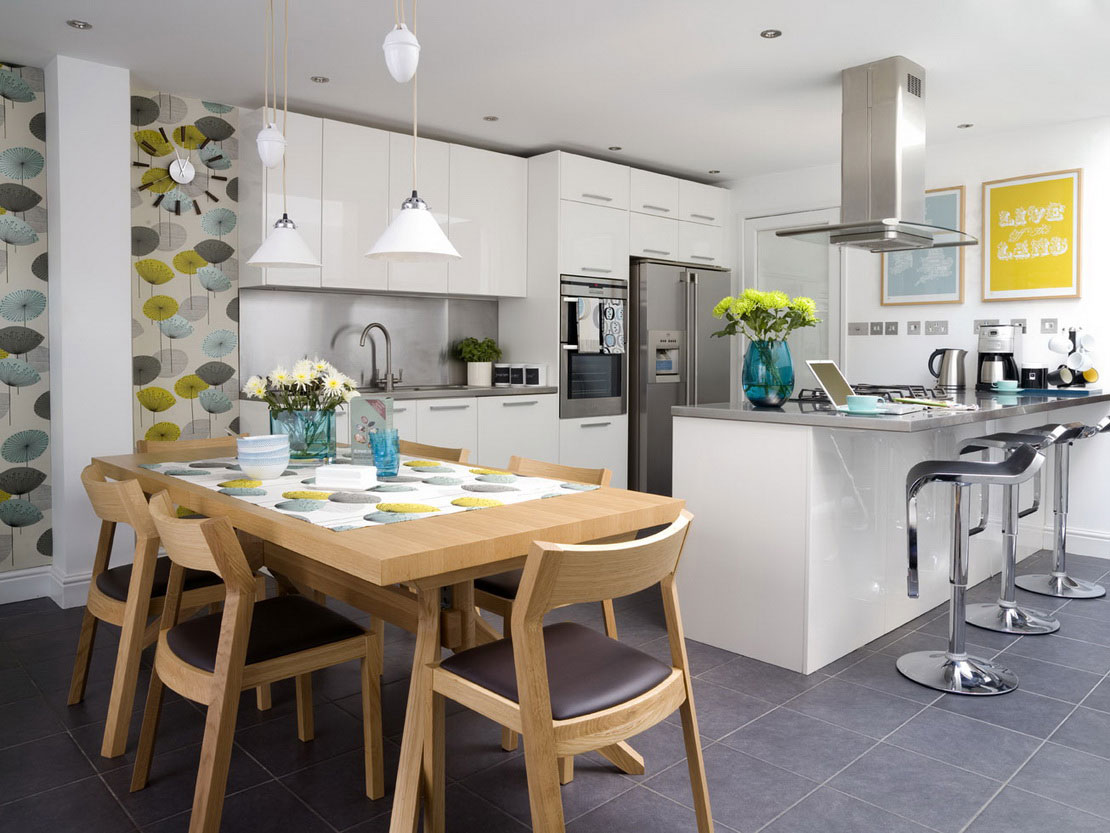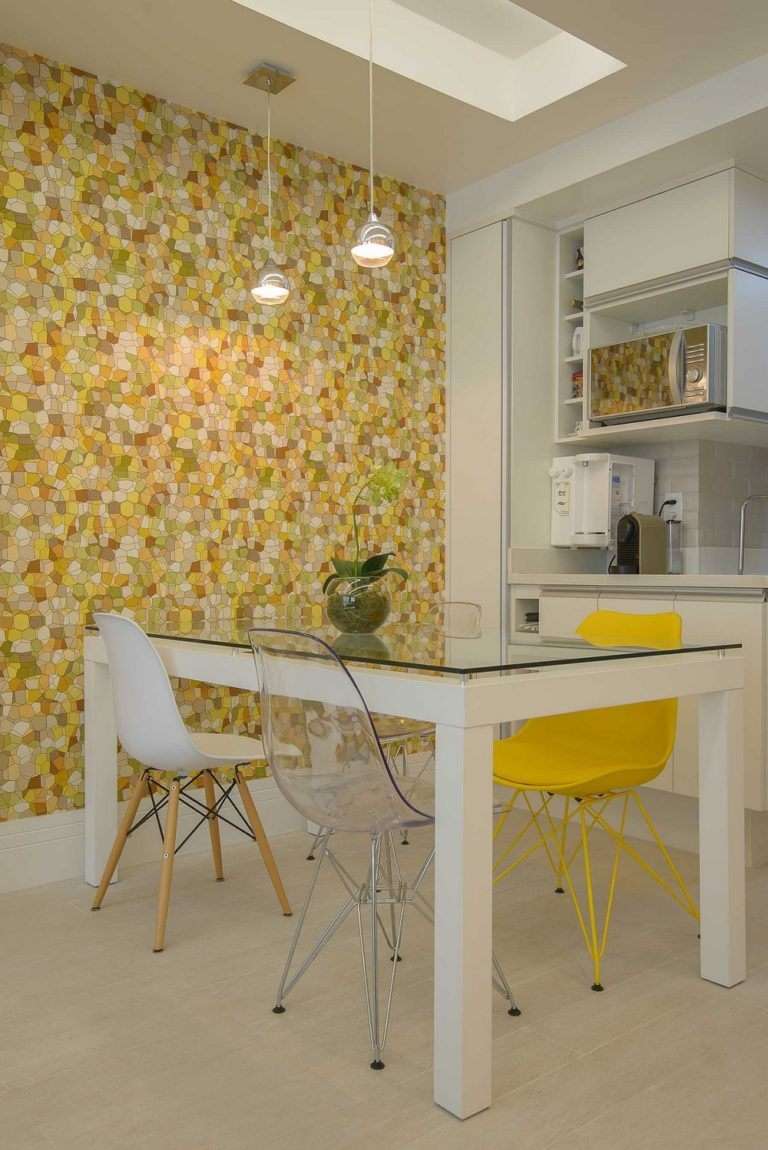 Na área de jantar, você pode usar materiais à prova d'água, como papel de parede à prova d'água. Se o espaço permitir, essa zona poderá ser diferenciada por papéis de parede fotográficos.