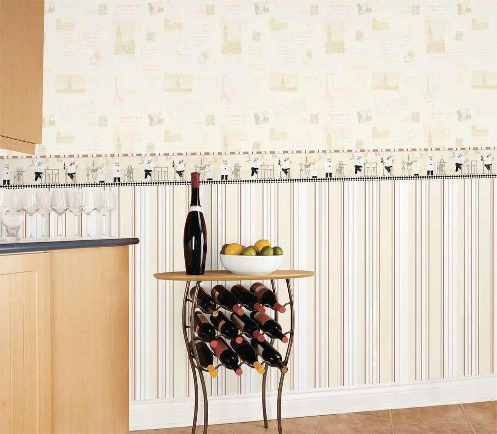 Se você não gosta de motivos florais, você pode usar papel de parede com a imagem de frutas ou legumes, vinhas, decorar a superfície com cores xadrez em cores brilhantes. Temas rústicos podem ser destacados com papel de parede imitando mate, pedra ou madeira.