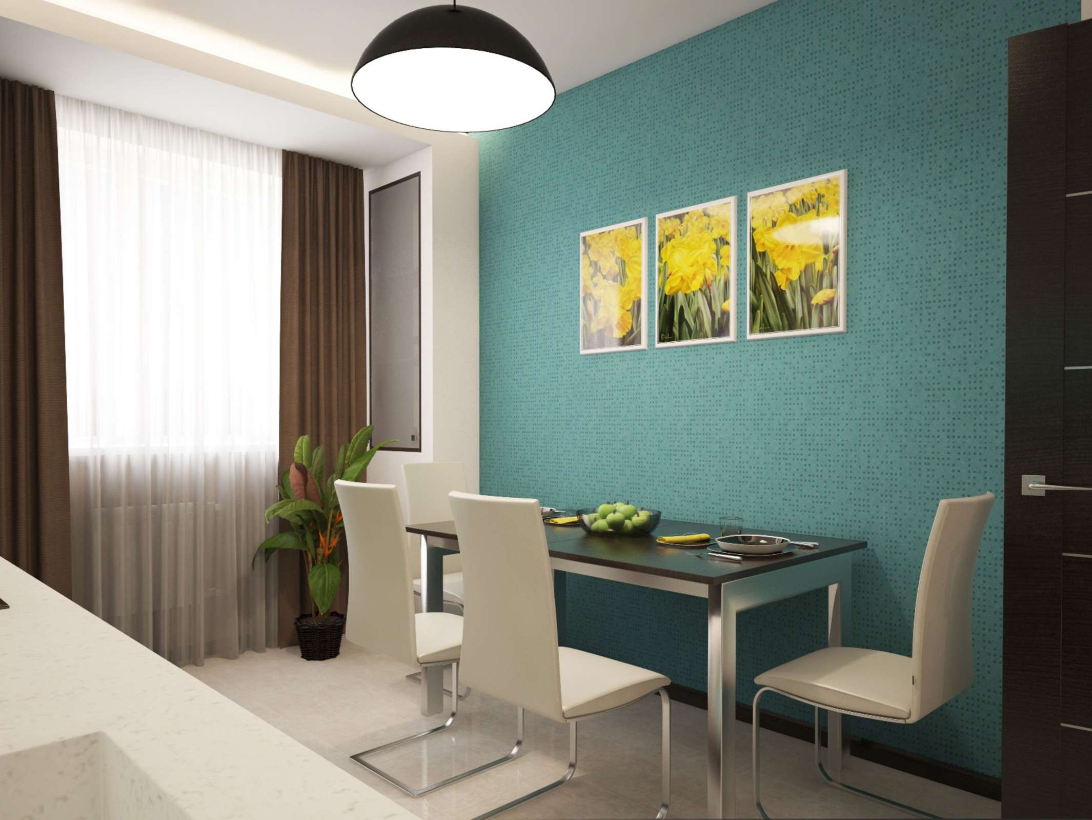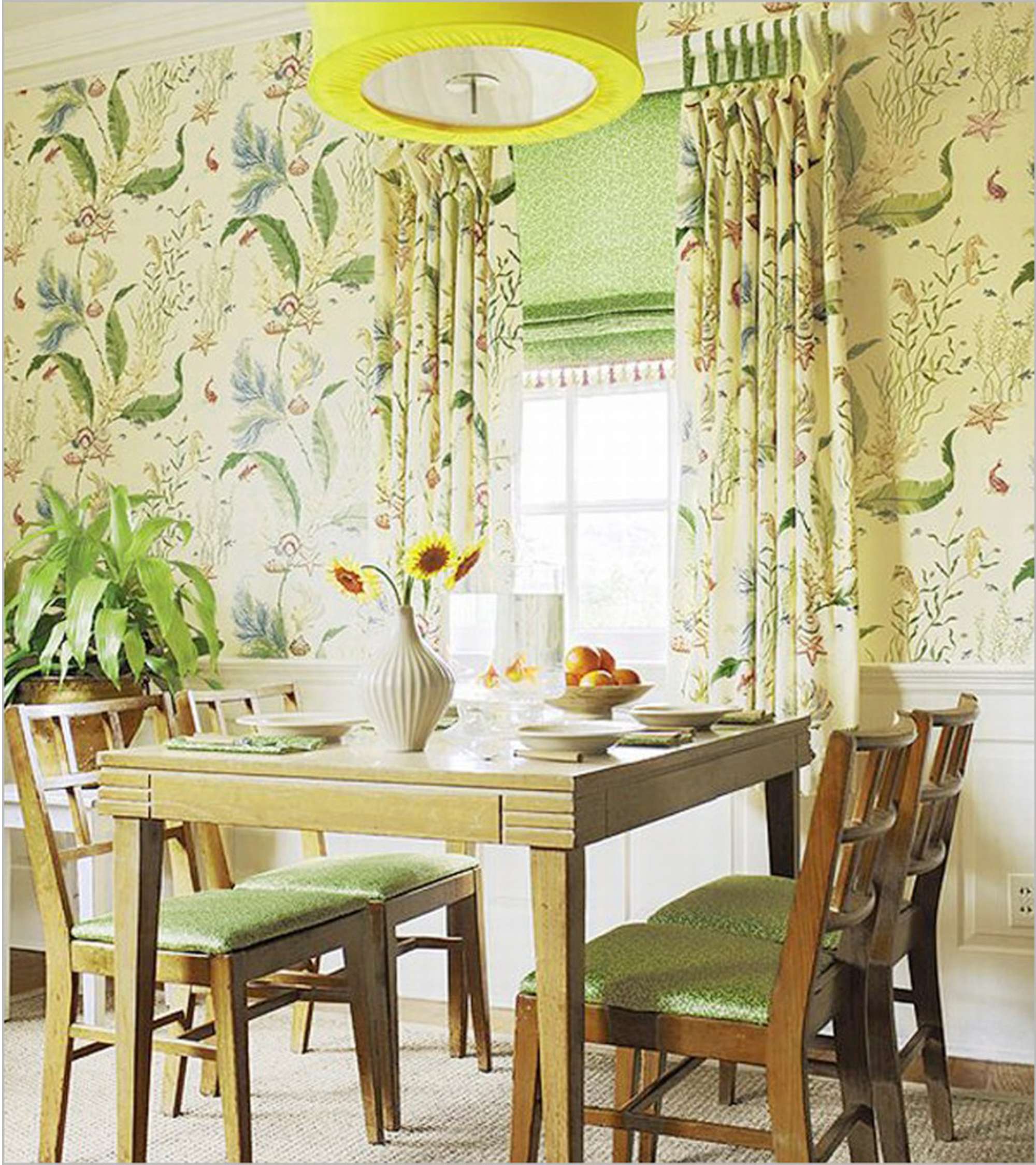 Muitas vezes, a sala da cozinha tem grandes janelas que permitem a entrada de muita luz. Neste caso, a resistência do tecido ao desbotamento não será supérflua. Esta propriedade do material permite, se necessário, reorganizar os móveis sem medo de que haja marcas feias e desbotadas nas paredes.