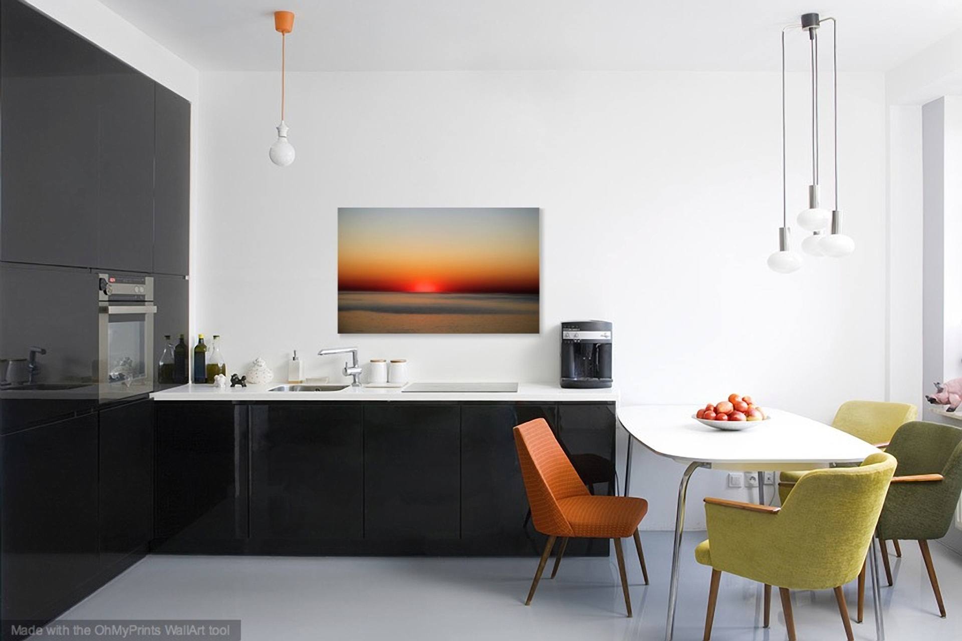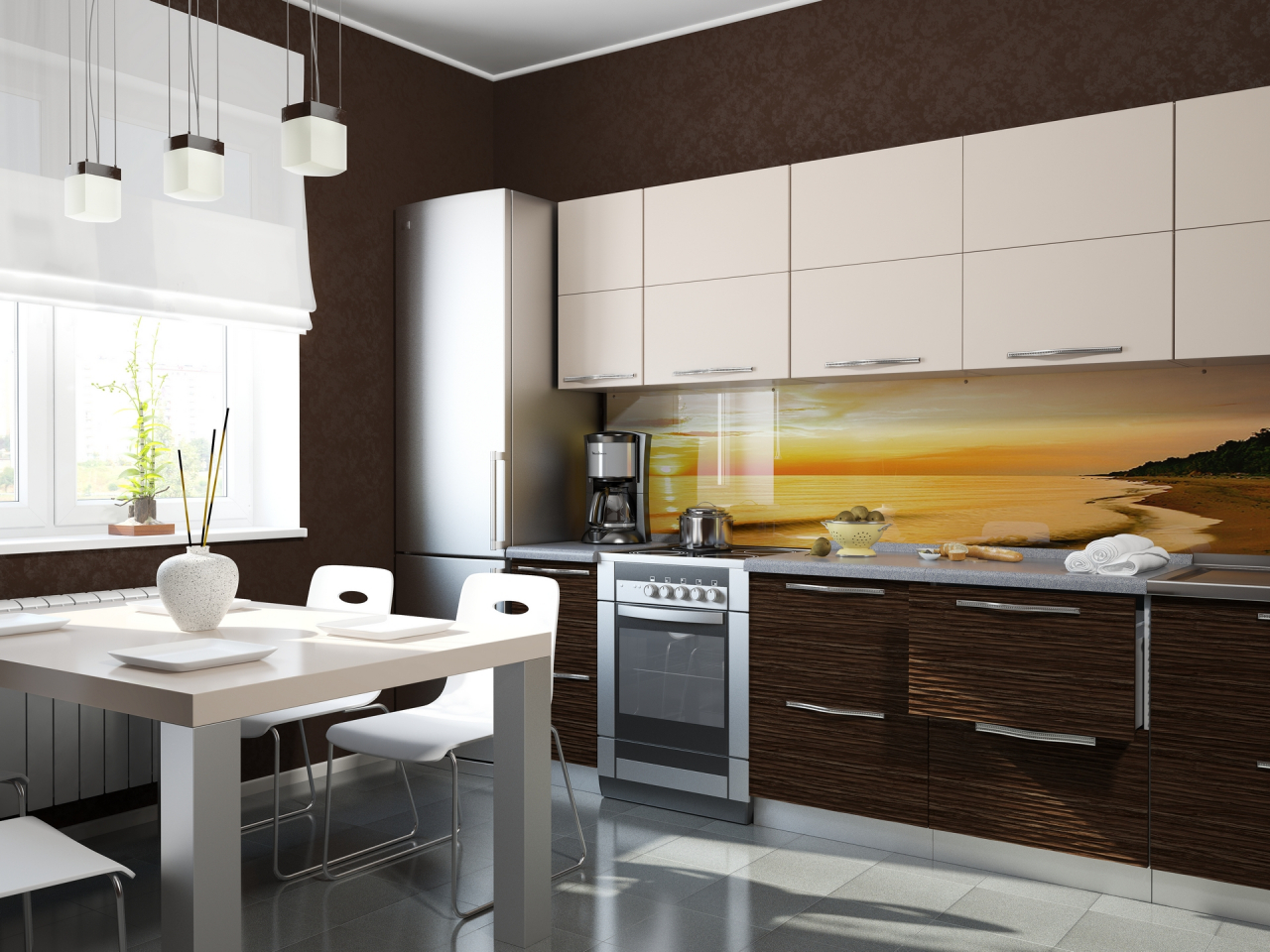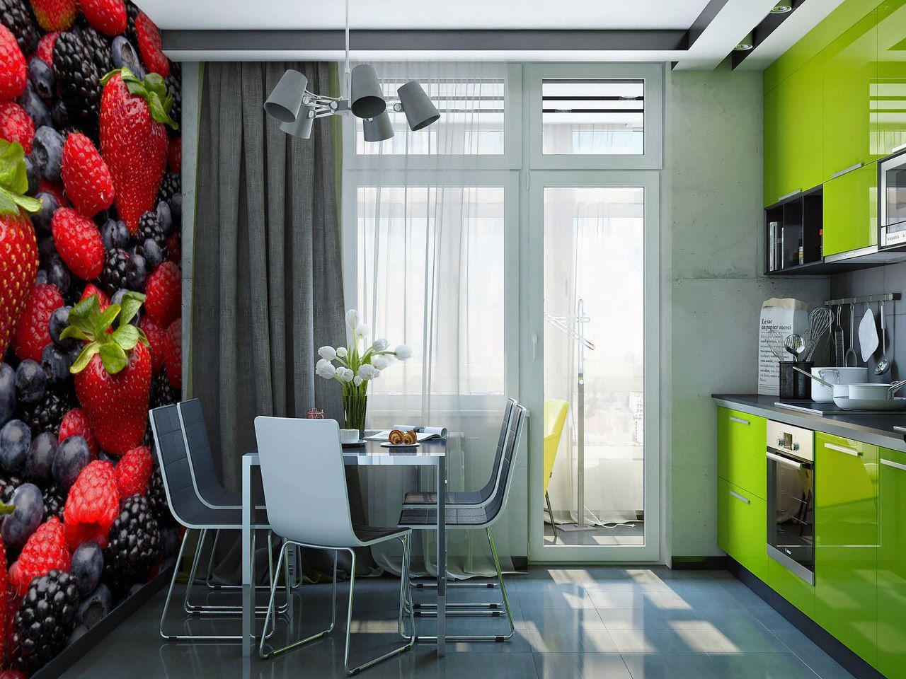 Para a cozinha em que você não tem muito tempo, você pode escolher uma opção de design simples. Realce uma parede com uma impressão incomum. Um sotaque brilhante irá criar um clima especial.