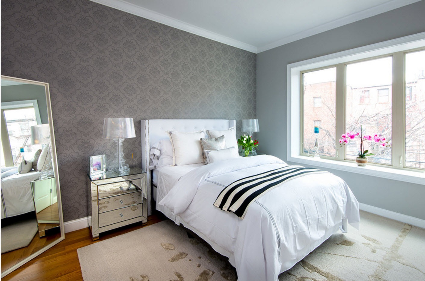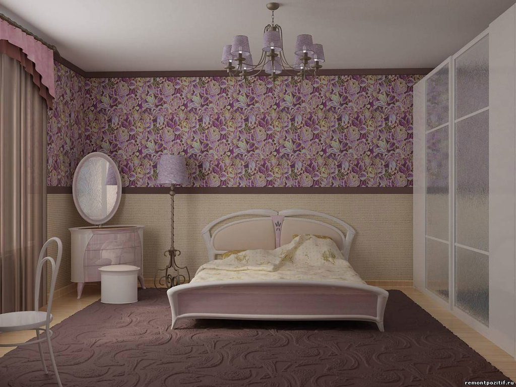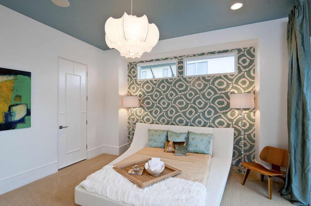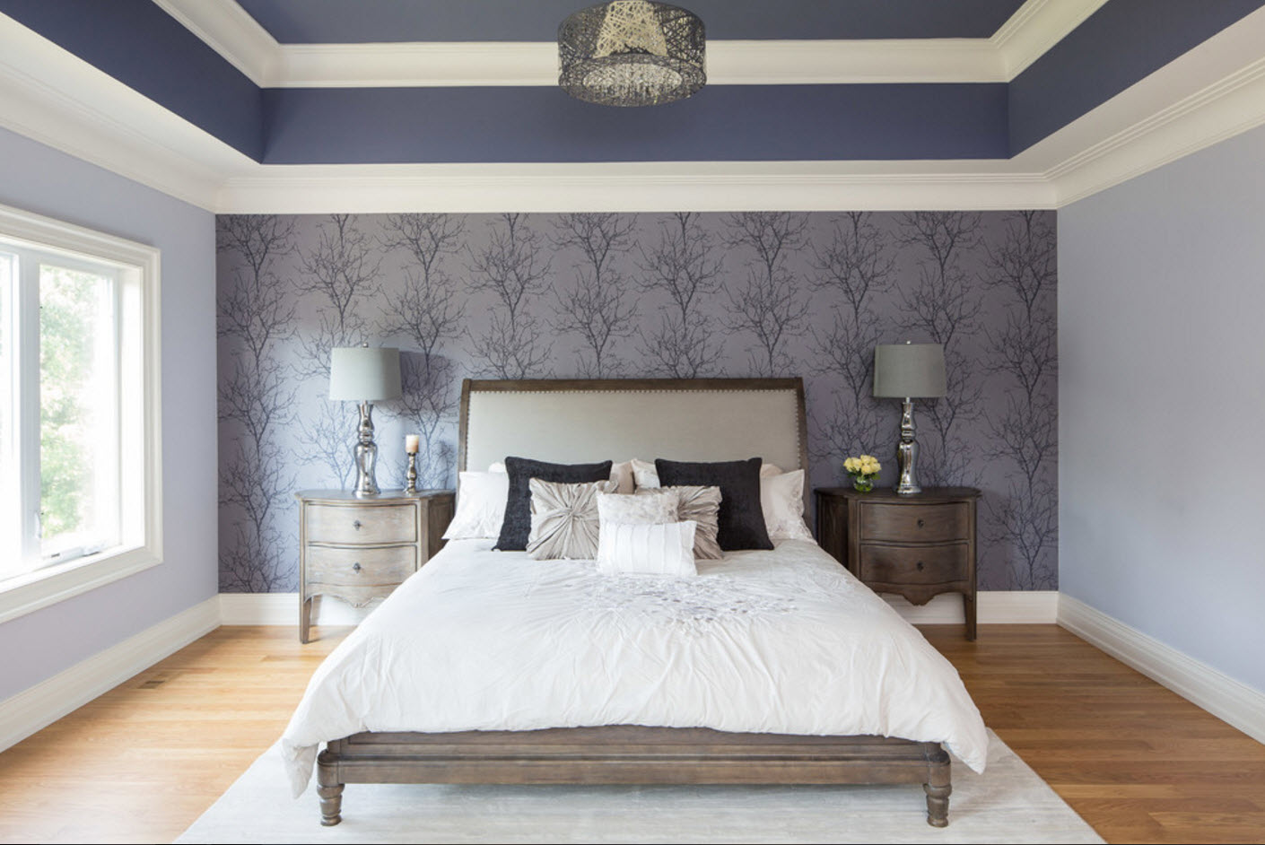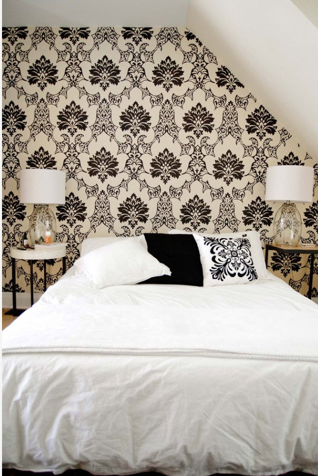 Para um quarto com um teto baixo, uma combinação de uma parede de acento que passa para a superfície do teto é importante. Combinações de padrões tridimensionais, elegantes ornamentos em preto e branco, impressões individuais e papéis de parede fotográficos com imagens em 3 D, inserções de sotaque com uma baguete, tela de uma cor com padrões texturizados são bem-vindas.