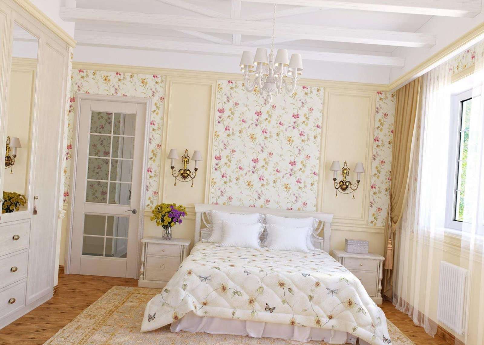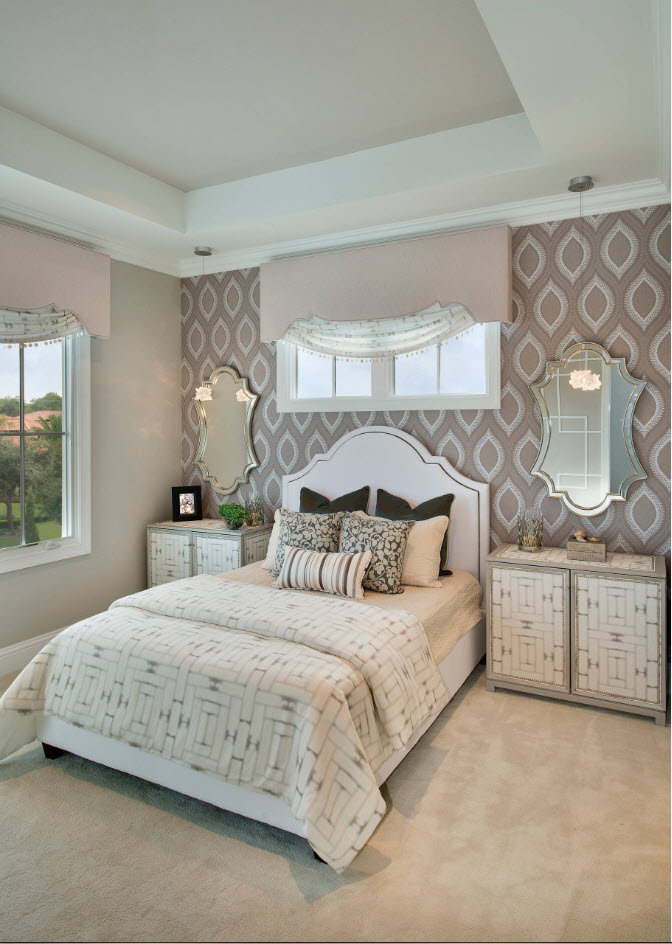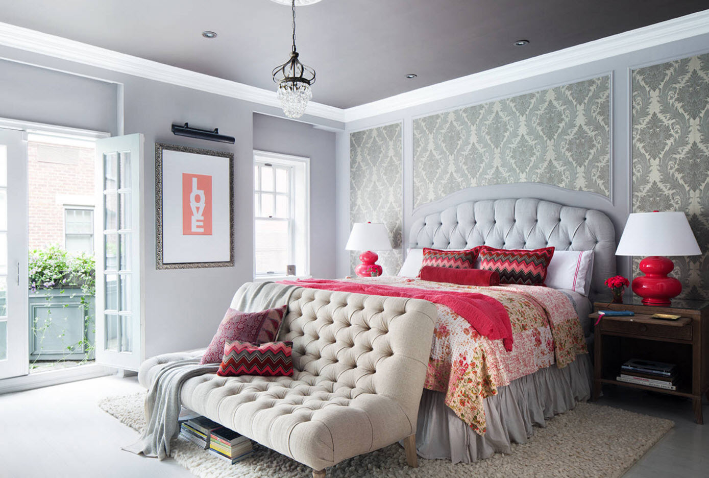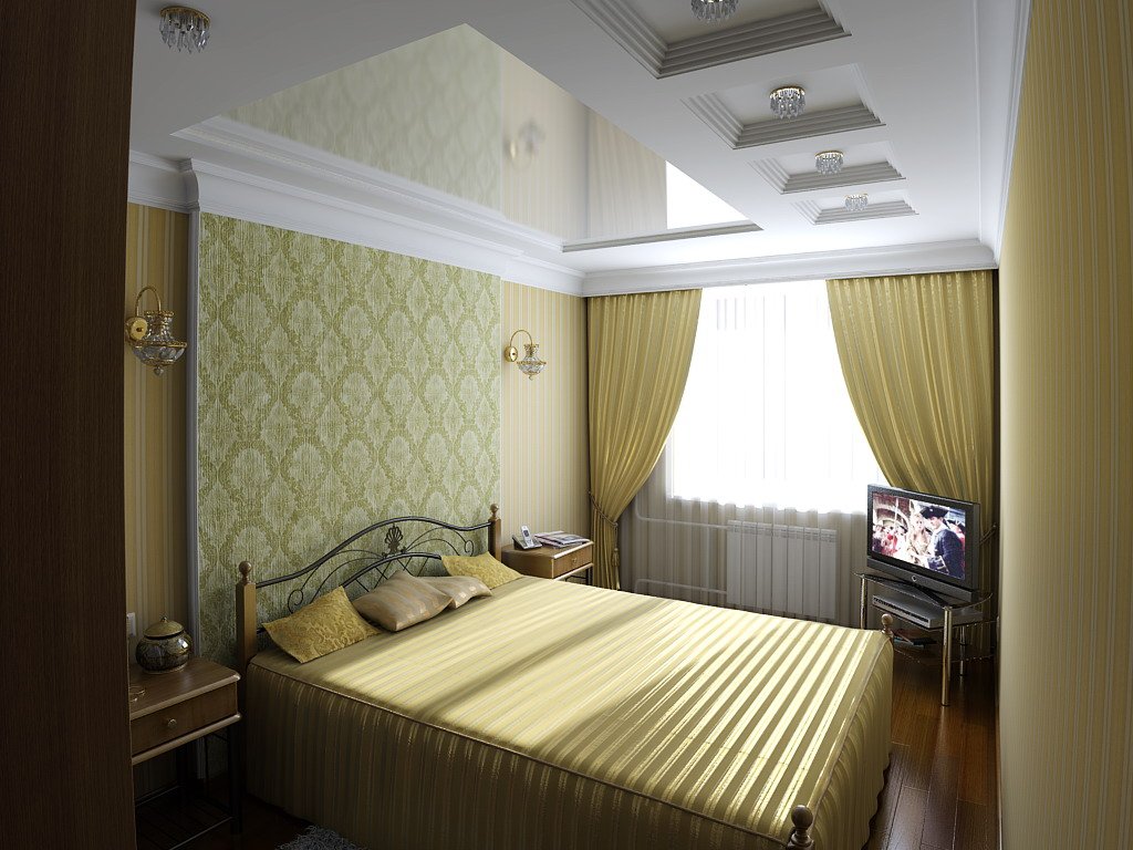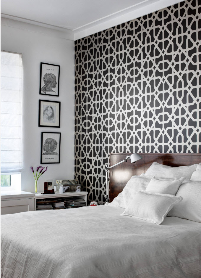 Para um quarto com um teto baixo, uma combinação de uma parede de acento que passa para a superfície do teto é importante. Combinações de padrões tridimensionais, elegantes ornamentos em preto e branco, impressões individuais e papéis de parede fotográficos com imagens em 3 D, inserções de sotaque com uma baguete, tela de uma cor com padrões texturizados são bem-vindas.