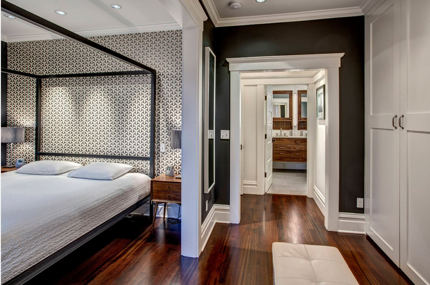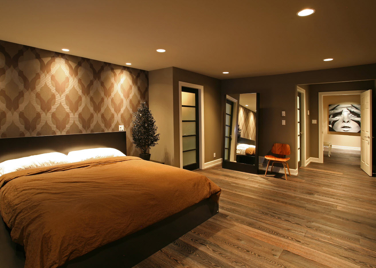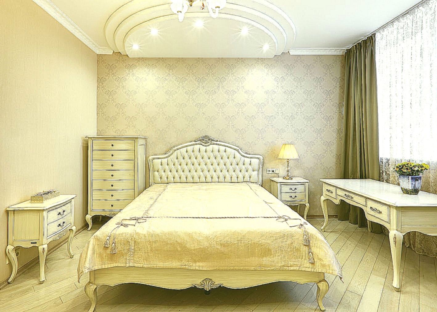 Para um quarto com um teto baixo, uma combinação de uma parede de acento que passa para a superfície do teto é importante. Combinações de padrões tridimensionais, elegantes ornamentos em preto e branco, impressões individuais e papéis de parede fotográficos com imagens em 3 D, inserções de sotaque com uma baguete, tela de uma cor com padrões texturizados são bem-vindas.