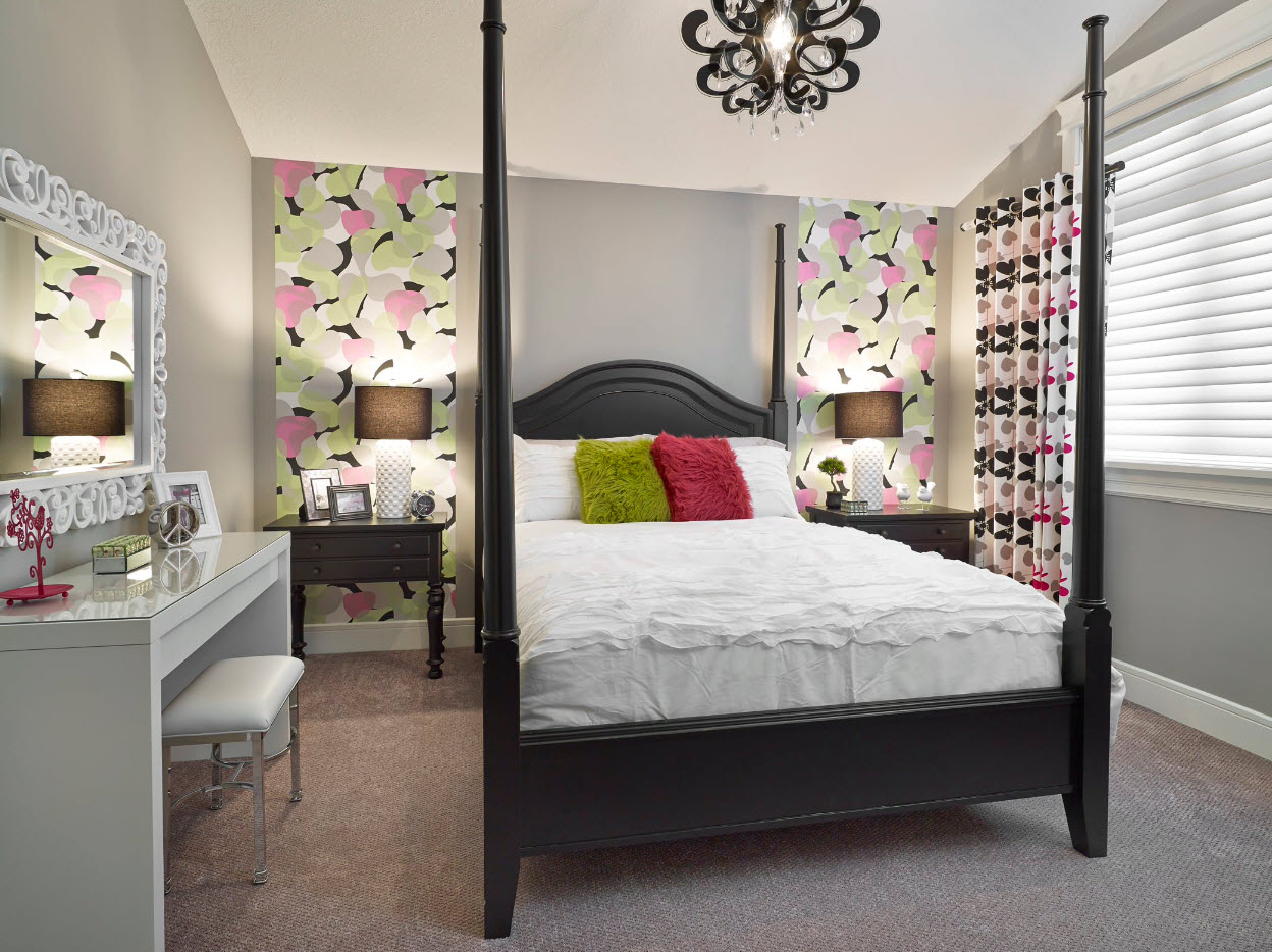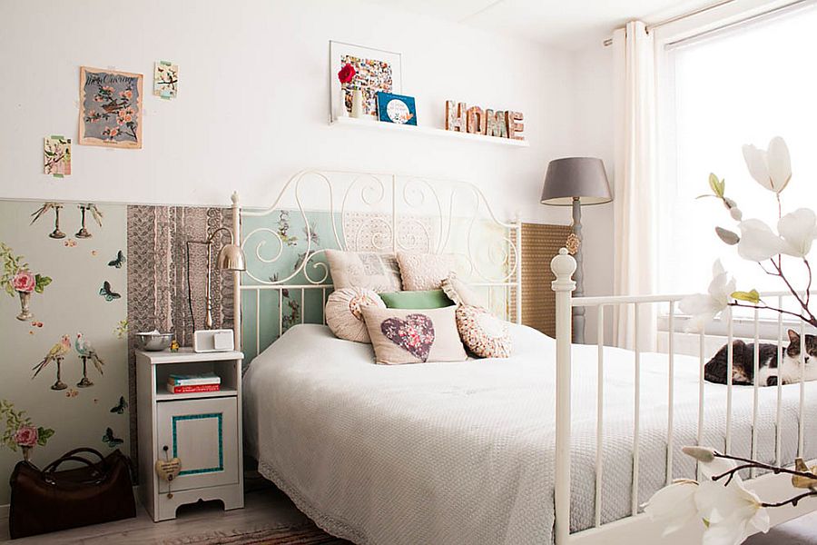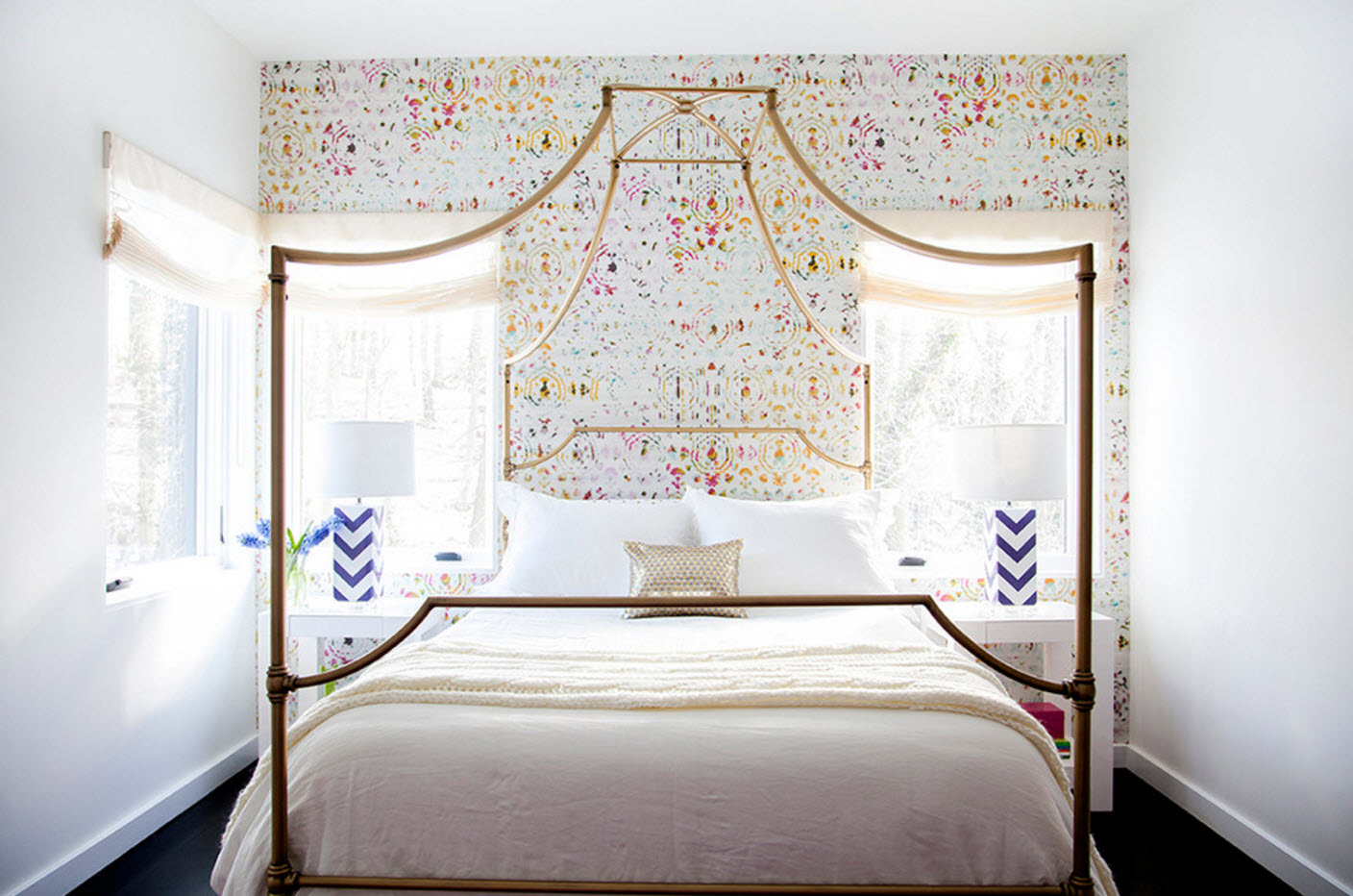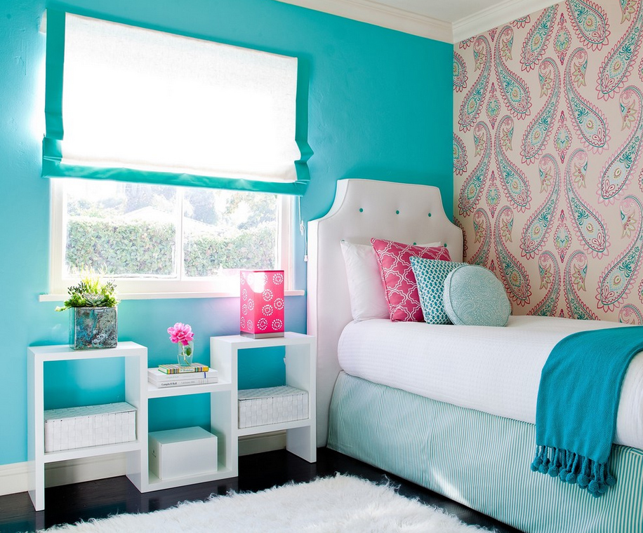 - Uma cor brilhante do papel de parede complementa o suave tom pastel.