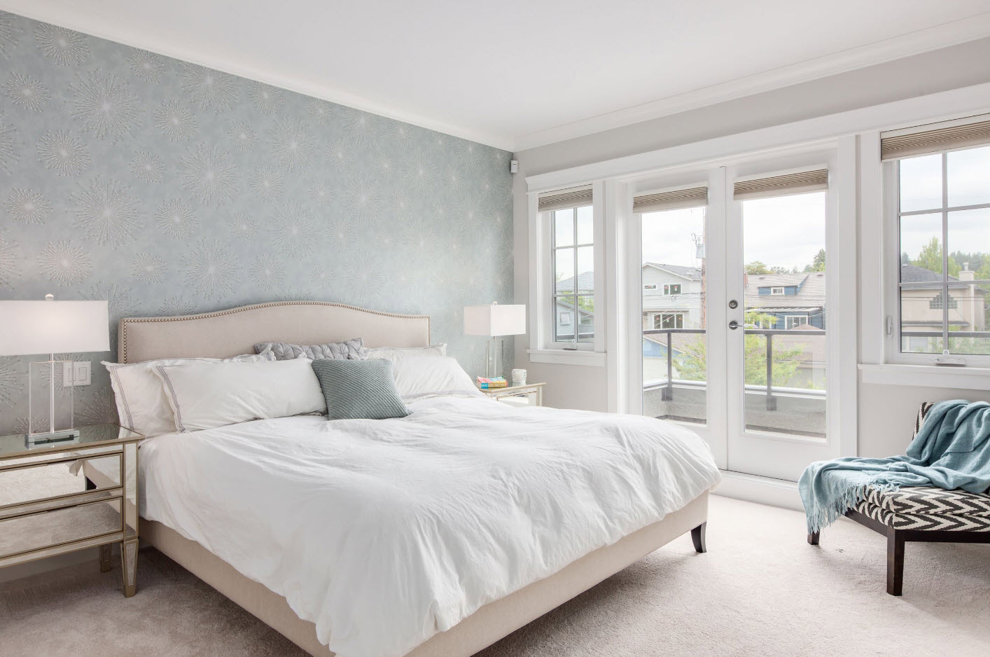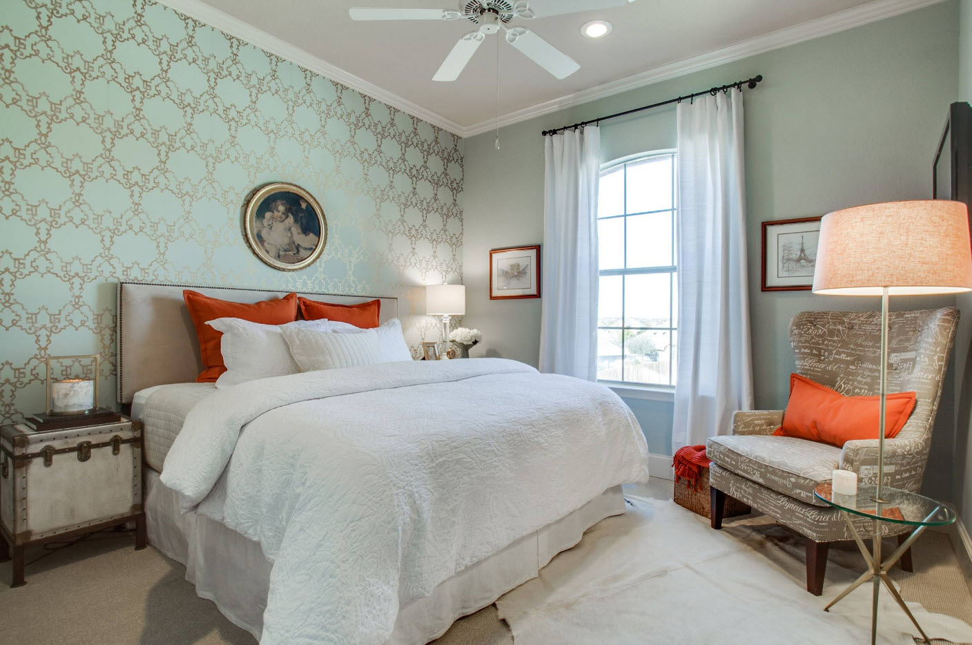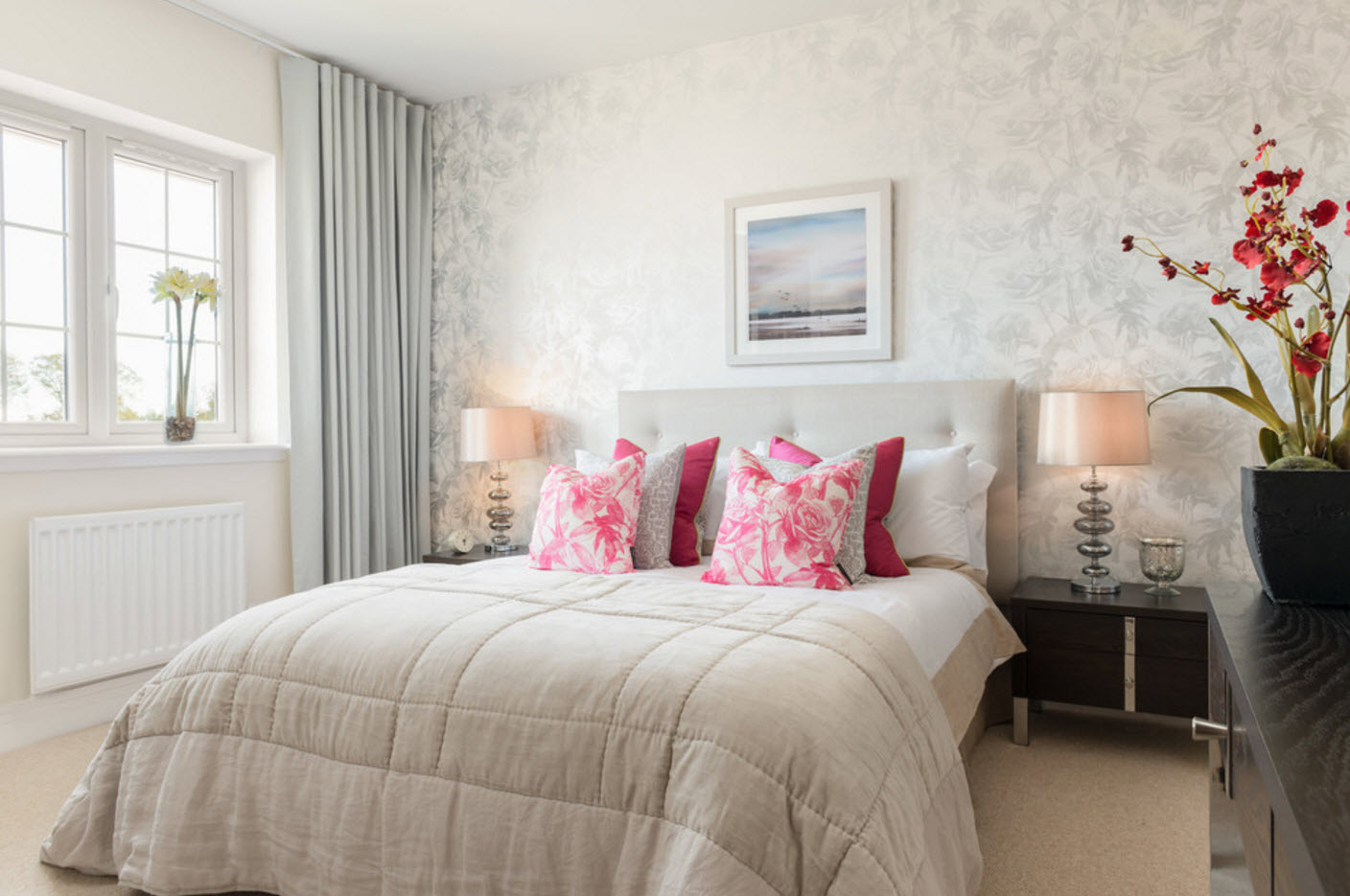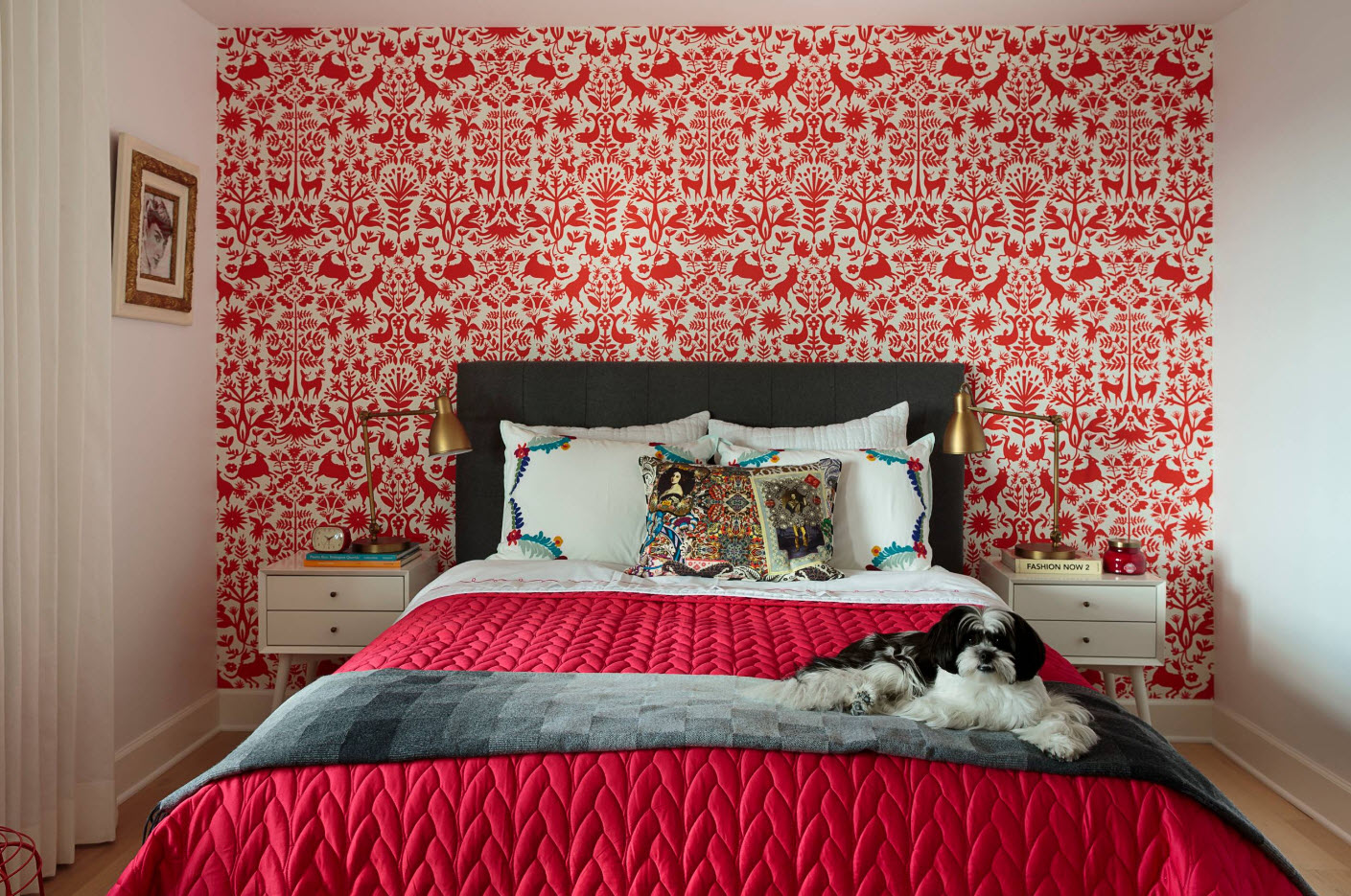 - Uma cor brilhante do papel de parede complementa o suave tom pastel.
