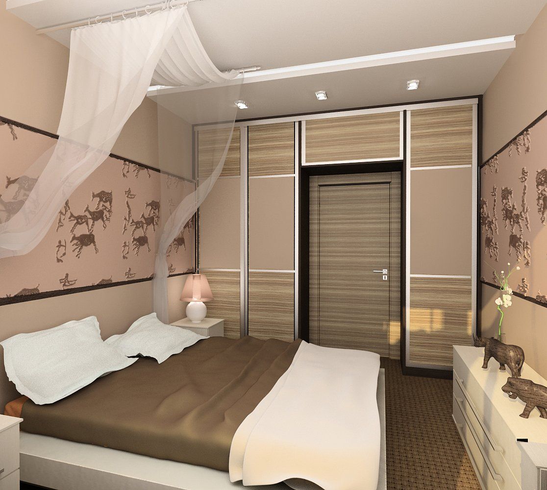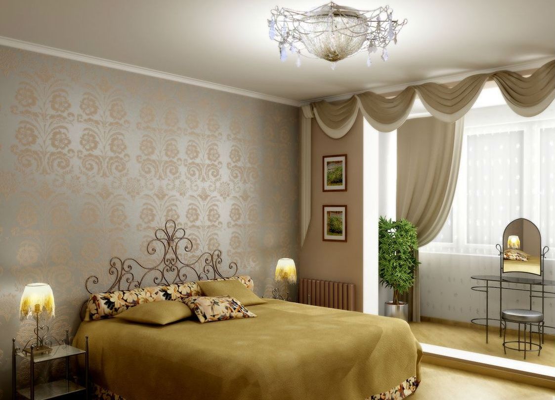 A principal coisa - para escolher uma área de lazer e área de trabalho. Usando cores e texturas, você pode gerenciar o espaço. Panos com um padrão, cores elegantes ajudará em uma sala compacta para expandir visualmente a área utilizável.