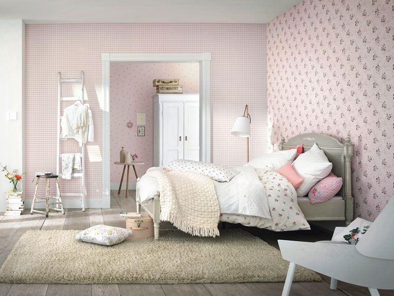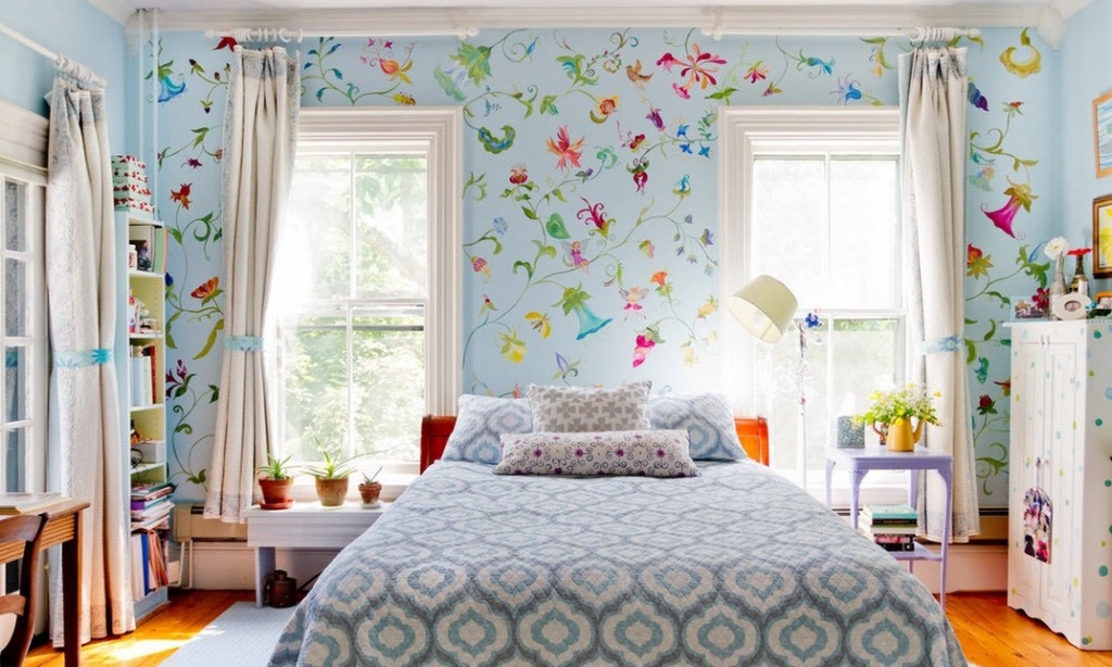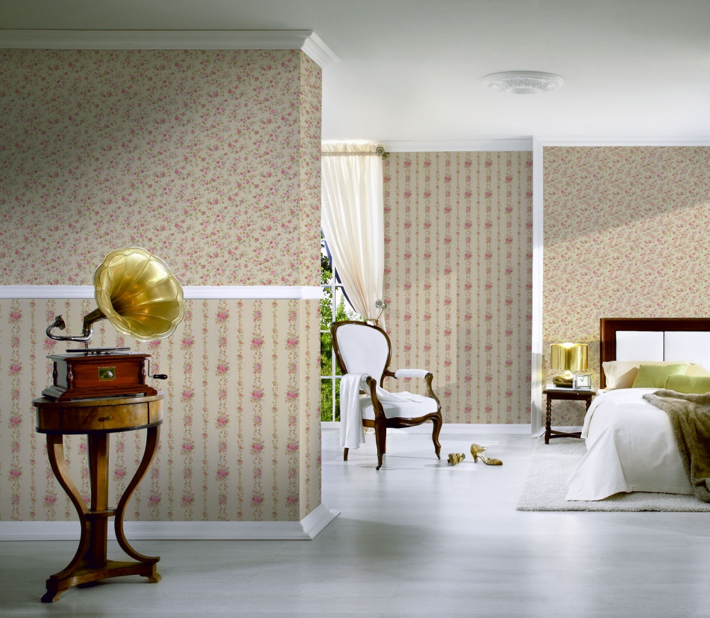 A tendência da moda de combinar é o uso da técnica de patchwork. Baseia-se na colagem de peças de diferentes papéis de parede de formato retangular ou quadrado, levando em consideração a cor e o padrão floral. Uma parede com tal desenho se parece com uma colcha de retalhos. Este método é benéfico do ponto de vista financeiro, porque você pode usar os restos de papel de parede.