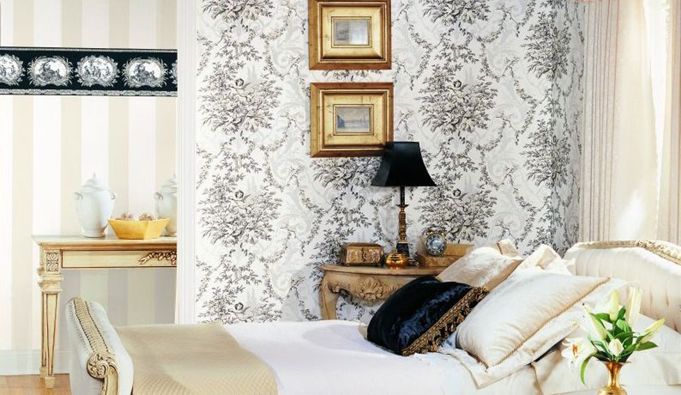 - O equilíbrio do papel de parede complexo com ornamentos intricados e monocromático simples, a cor do que repete a cor do padrão de papel de parede complexo.