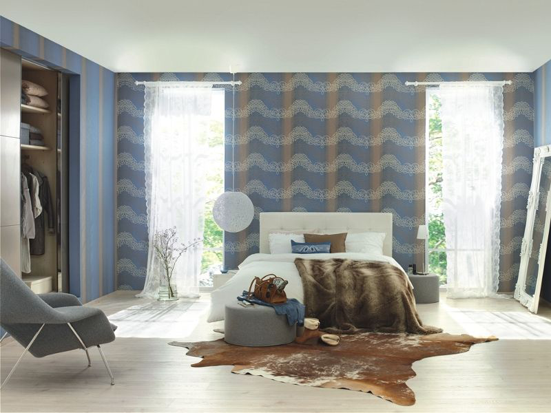 Uma maneira vertical de combinar visualmente o papel de parede "puxa" a parede para cima. A opção mais bem sucedida é uma série de listras monofônicas e padronizadas da mesma largura, quebrando o estereótipo do interior.