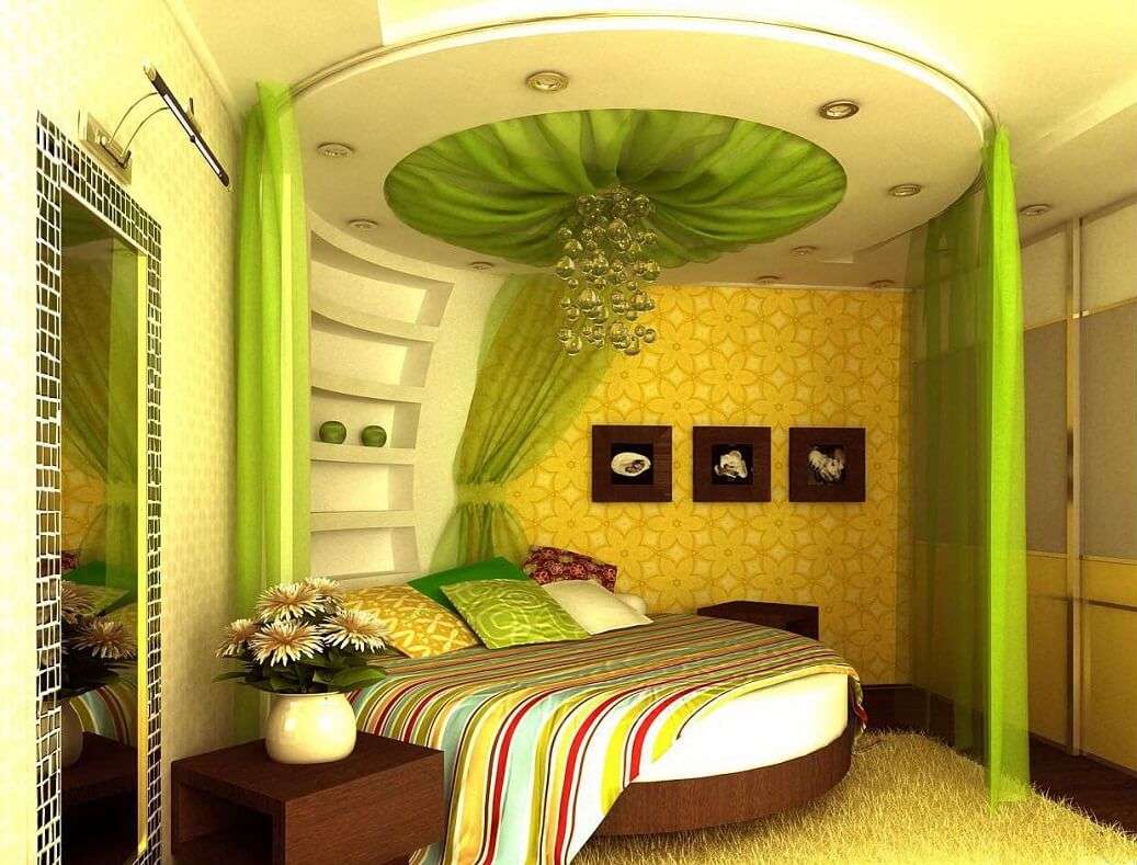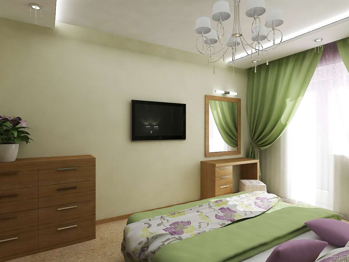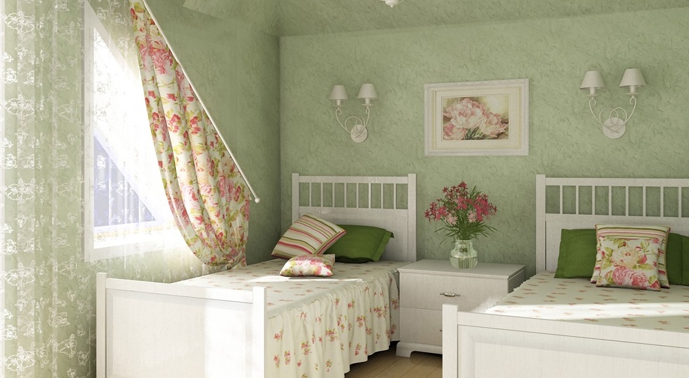 O interior causa uma variedade de sentimentos em uma pessoa. Na sala de descanso, eles devem ser apenas positivos. Portanto, você não pode usar cores brilhantes e agressivas na decoração e no mobiliário.. Você pode optar por um estilo romântico. Enche o espaço com pureza e frescura. É importante para dormir e descansar. Ajuda a relaxar após um dia cansativo e recupera-se rapidamente. A cor verde melhora o humor, alivia a irritabilidade e um efeito positivo no sistema nervoso.