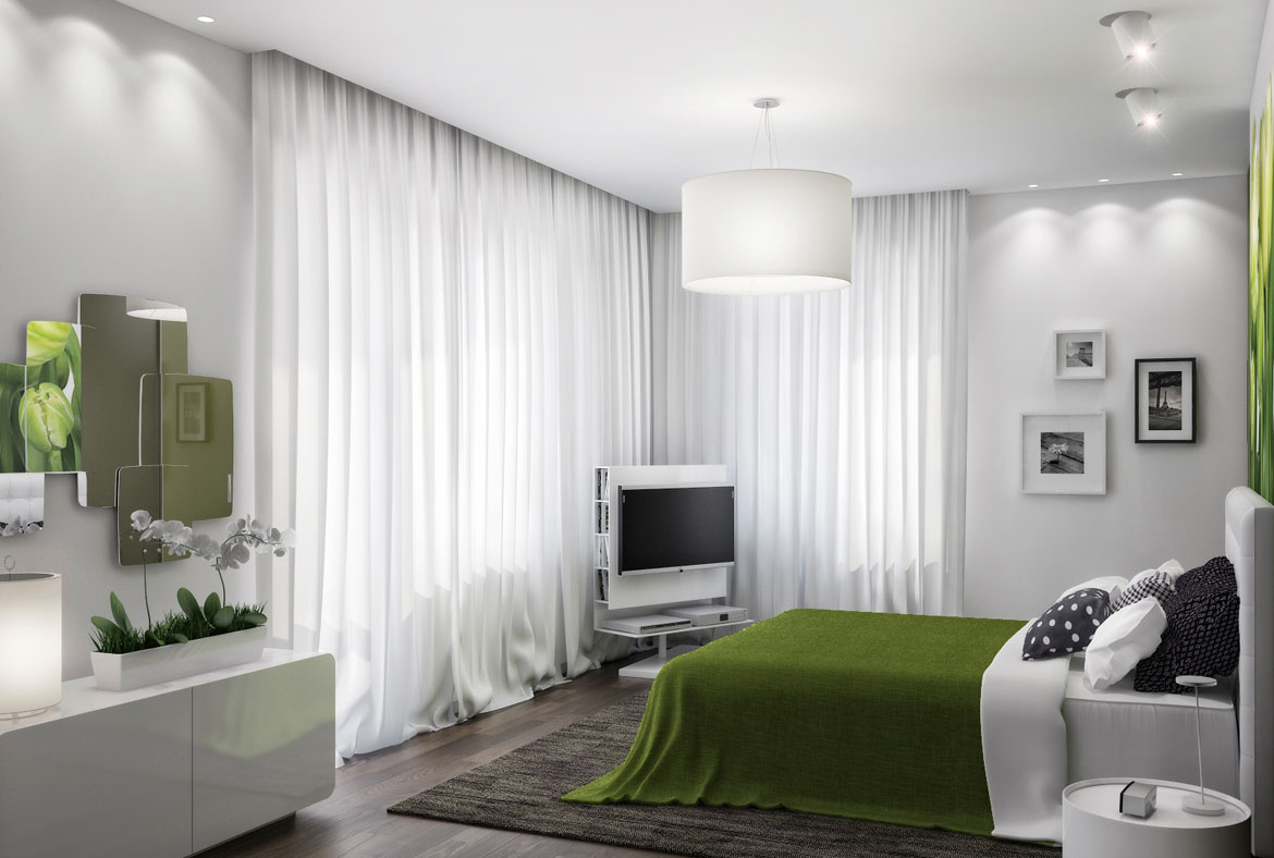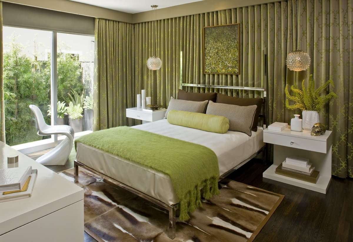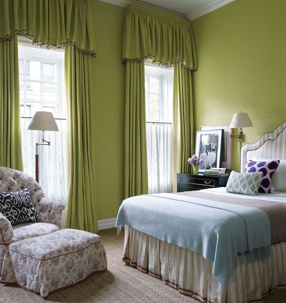 No quarto verde deve estar presente cortinas. Eles criam certo clima na sala. Se você escolher têxteis desarmônicos, isso pode mudar drasticamente a aparência da sala em uma direção negativa.