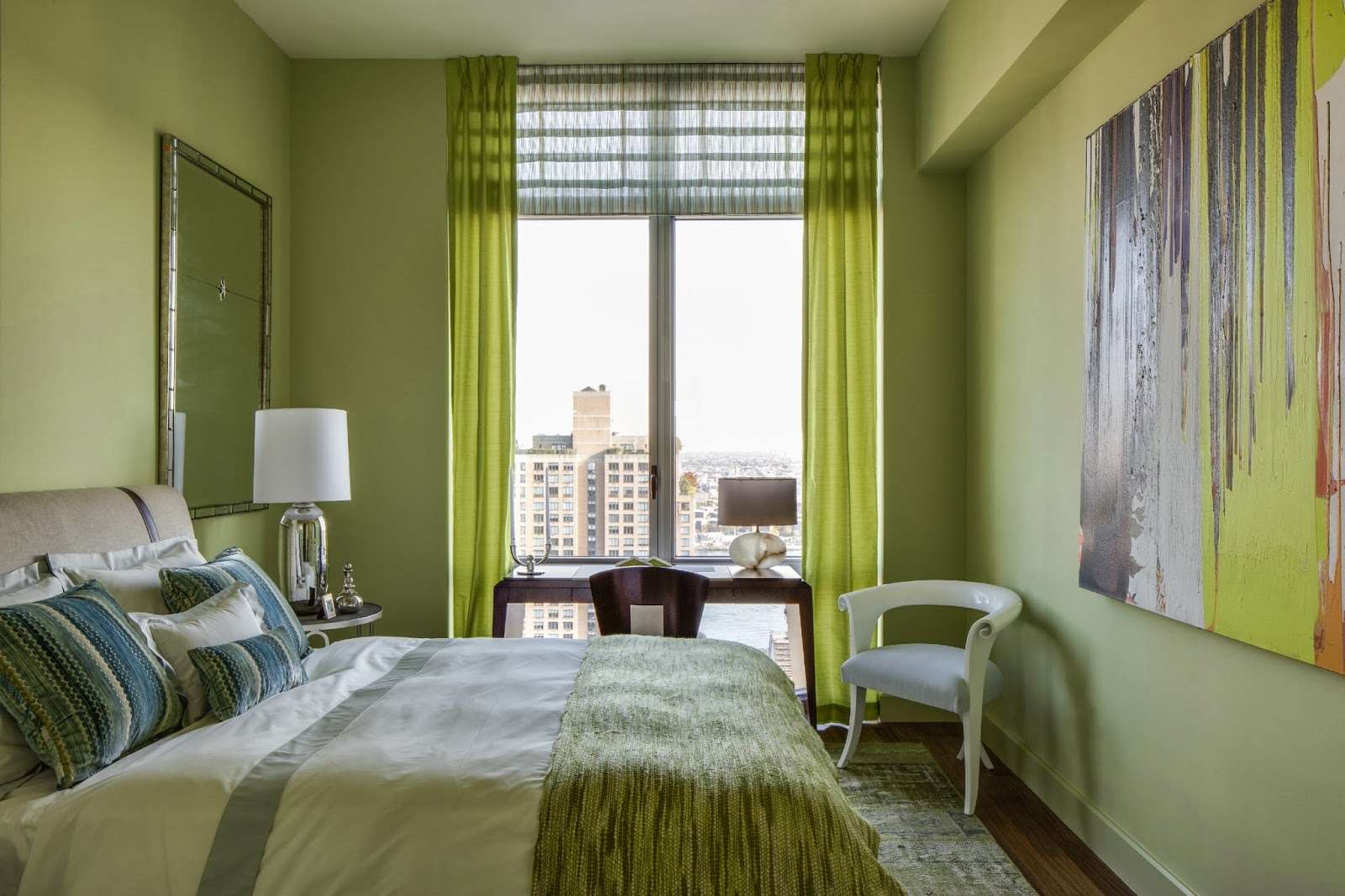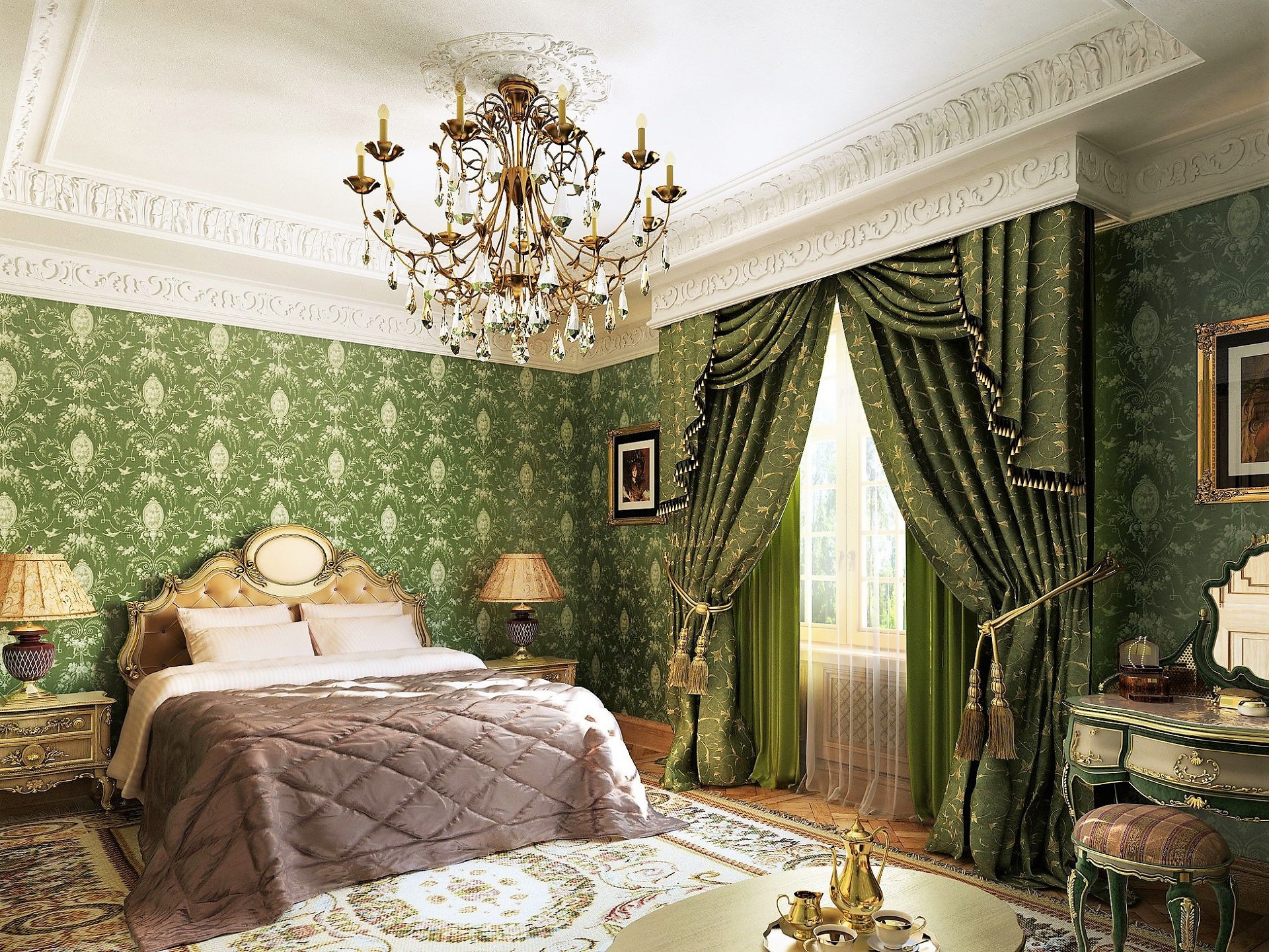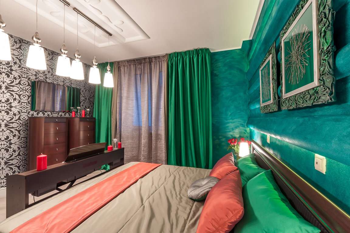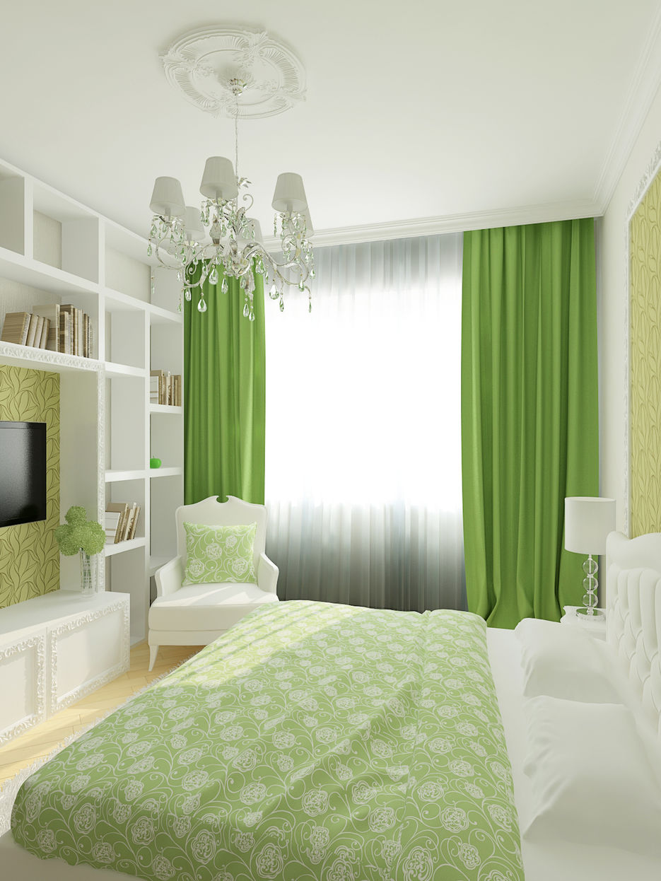 - Quarto para dormir. Você pode usar tons de verde claro ou pistache. Para interior em verde escuro, esmeralda ou malaquita cortinas.