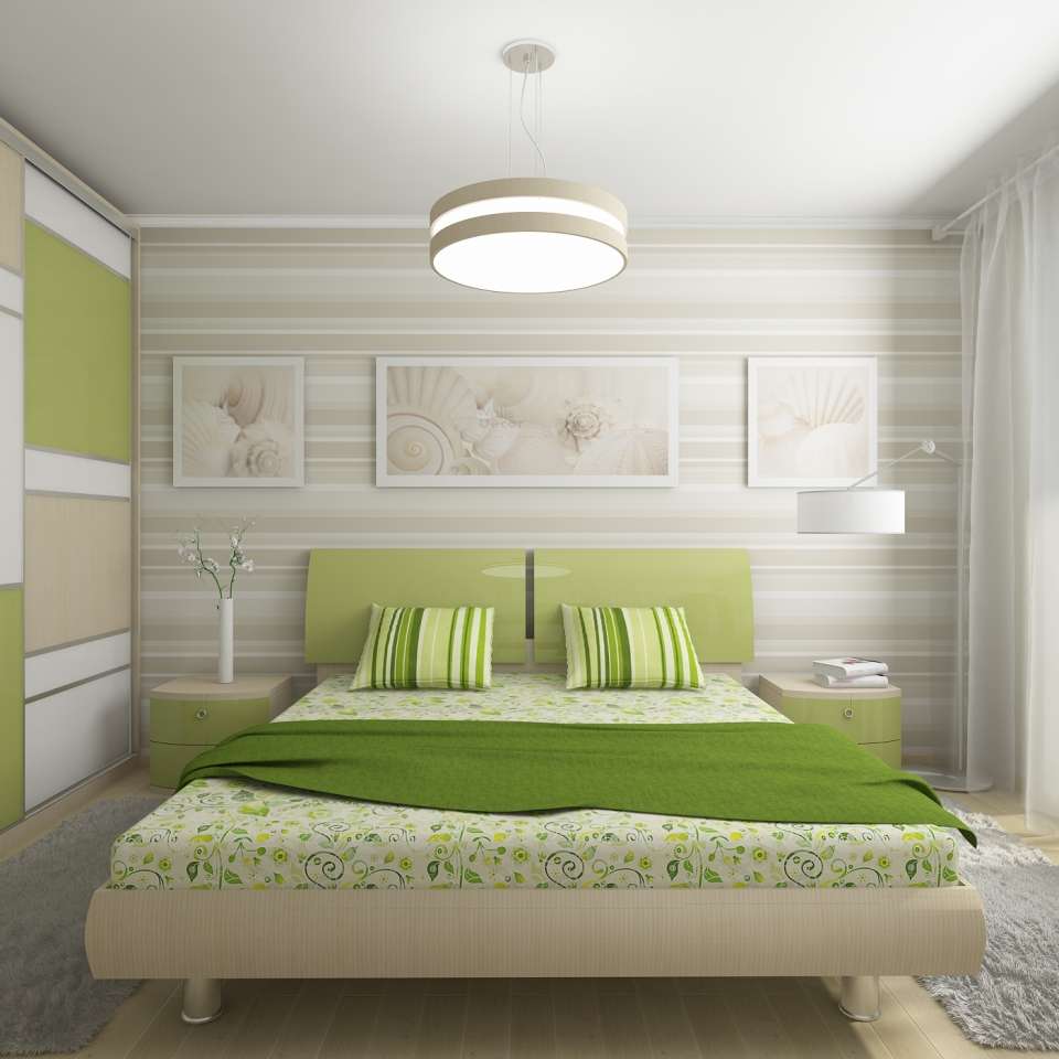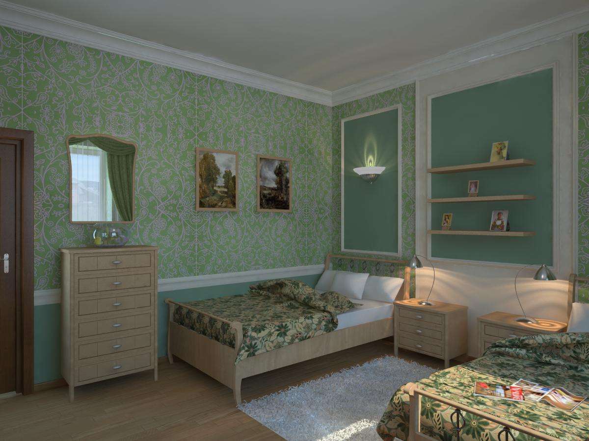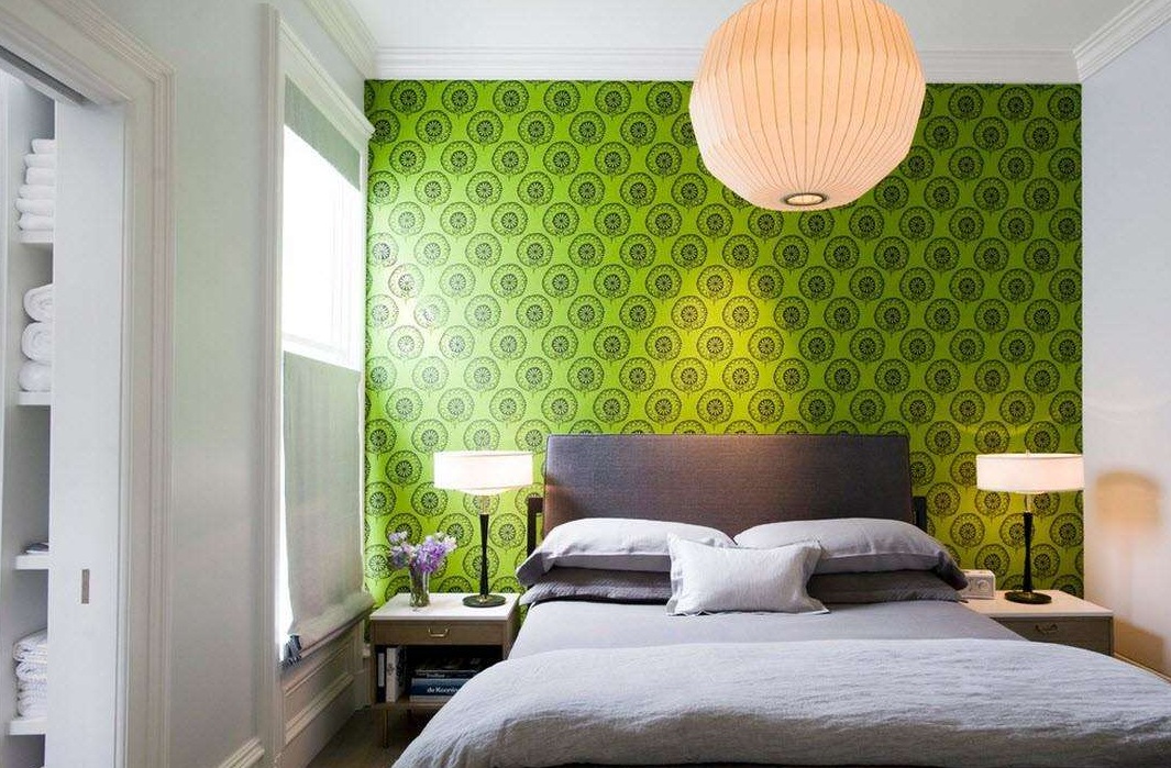 É um destino popular para a decoração do quarto. A cor verde representa a grama fresca, folhas das árvores. Se você adicionar interior de madeira ou castanho elementos, dá a impressão de recreação ao ar livre. Para melhorar o efeito, você pode pegar papel de parede, que retrata ornamentos com uma inclinação floral. No momento do registro do quarto é possível usar só materiais naturais. Entre eles estão: