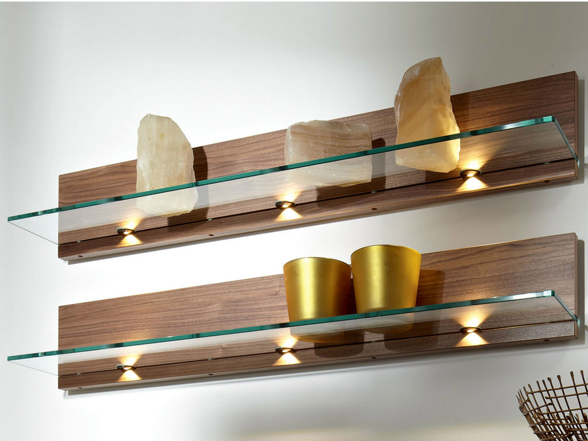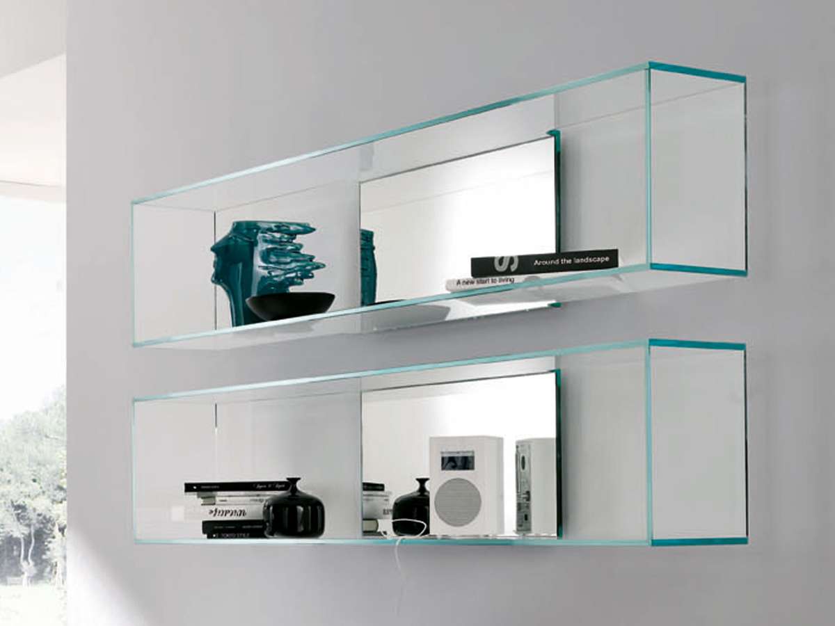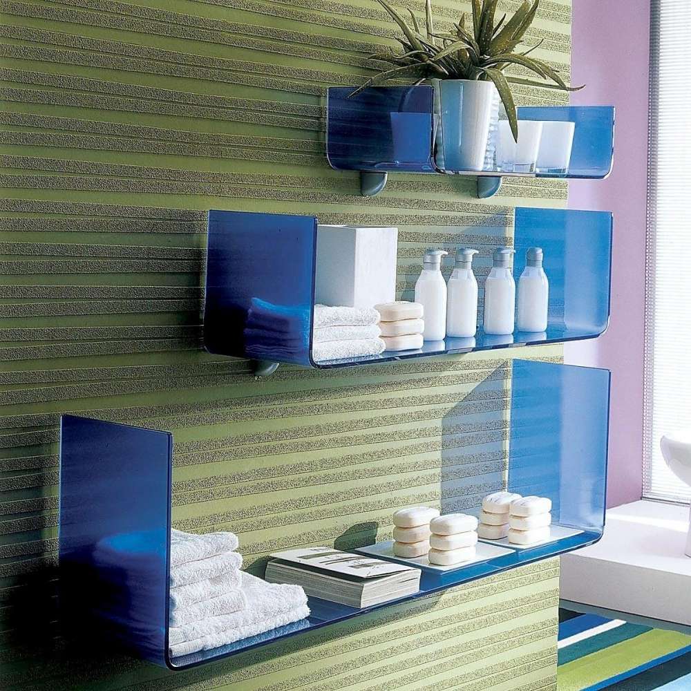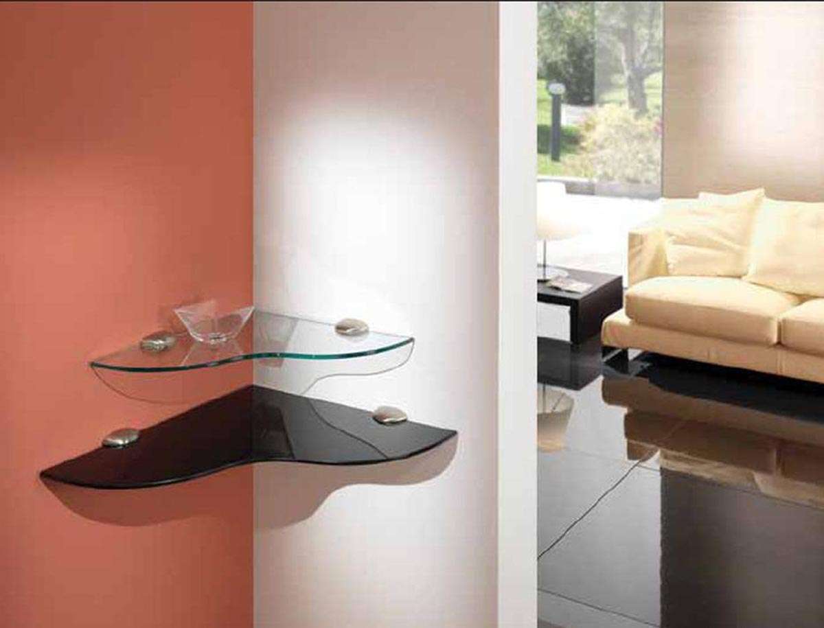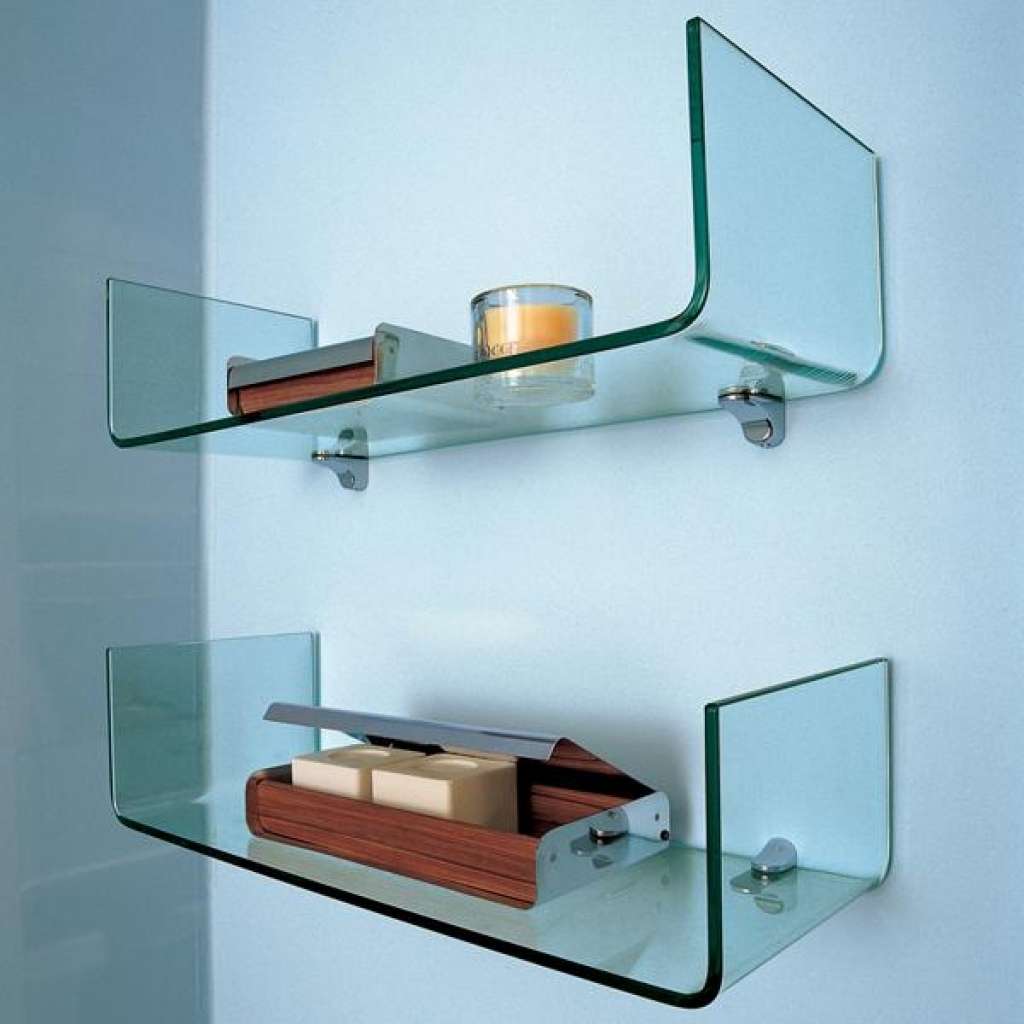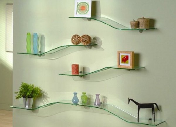 Prateleiras de vidro na parede podem ser penduradas em qualquer cômodo da sua casa. Na sala de estar flores ou uma TV estão convenientemente localizados na sala, no berçário há brinquedos com livros, no quarto há fotografias de parentes, pequenos acessórios ou uma coleção favorita de figurinhas, no banheiro há panos, sabonete, xampus, géis e na cozinha - temperos ou pratos.