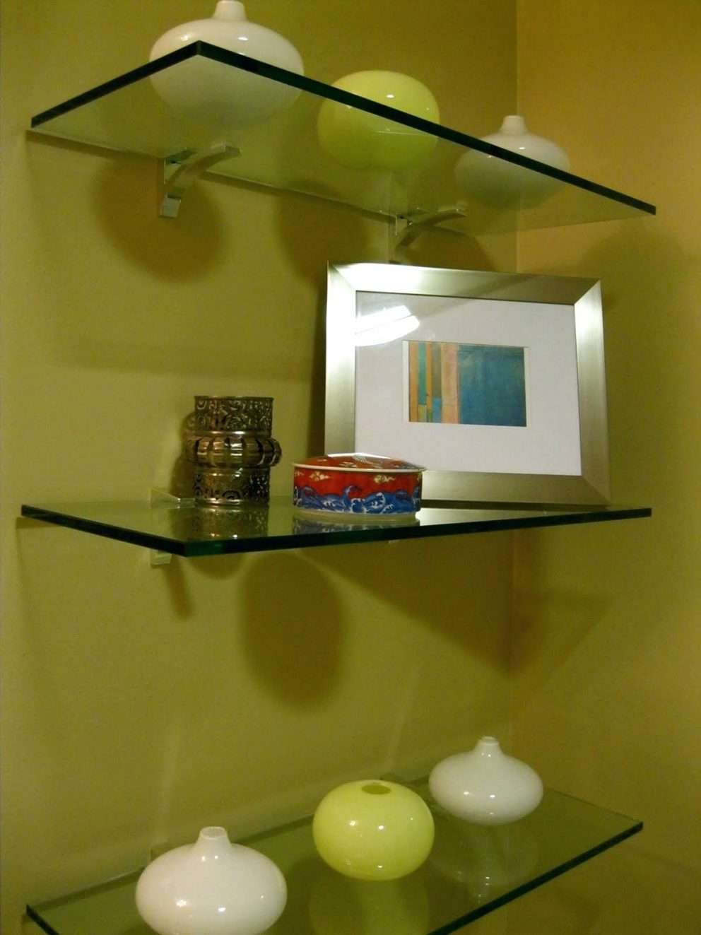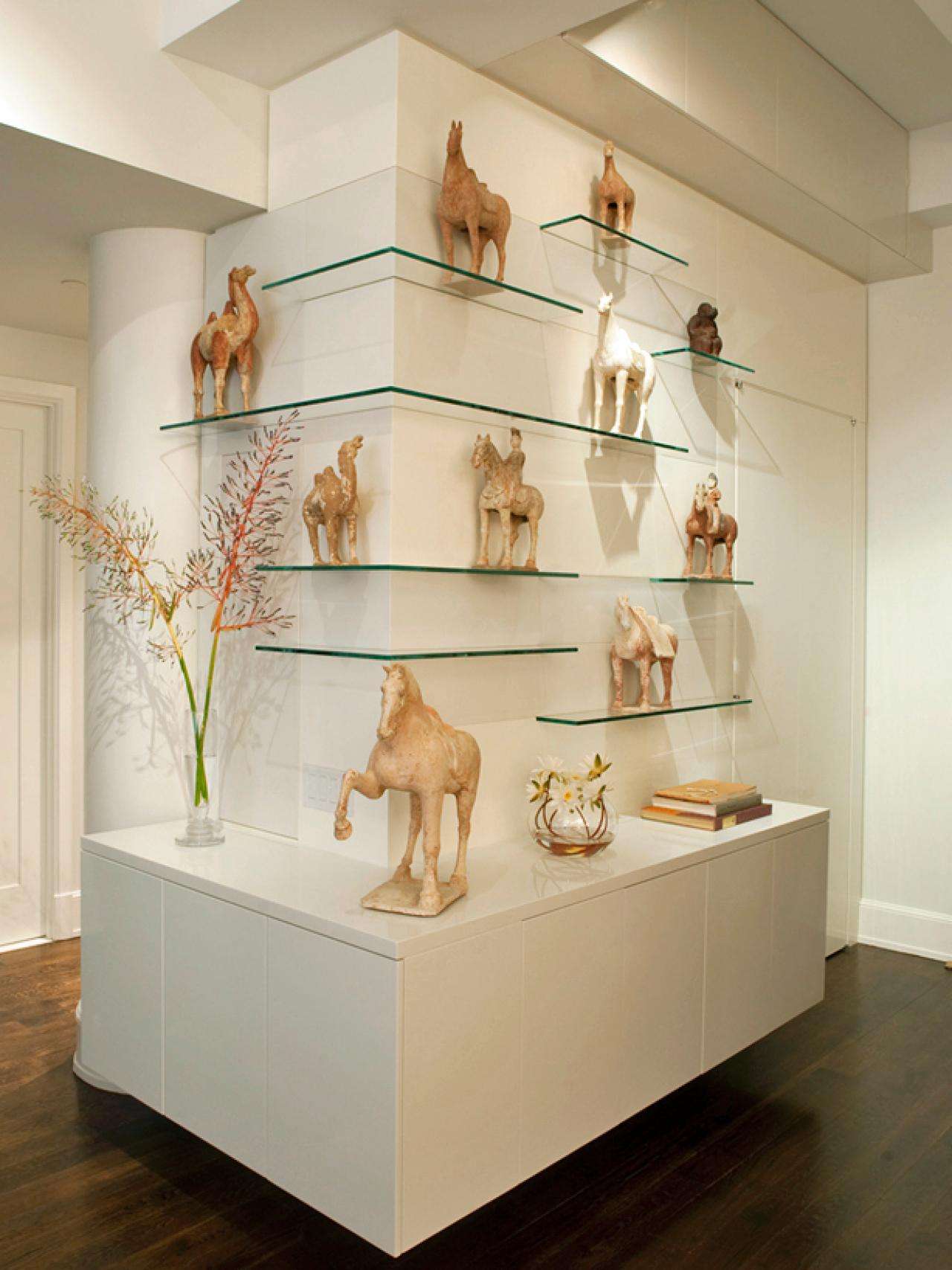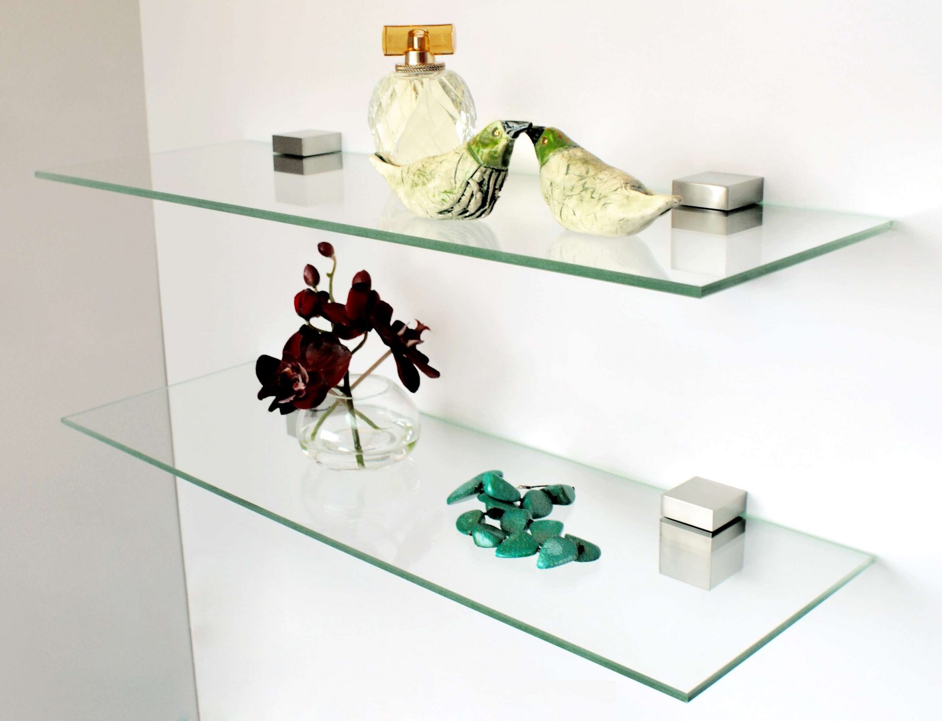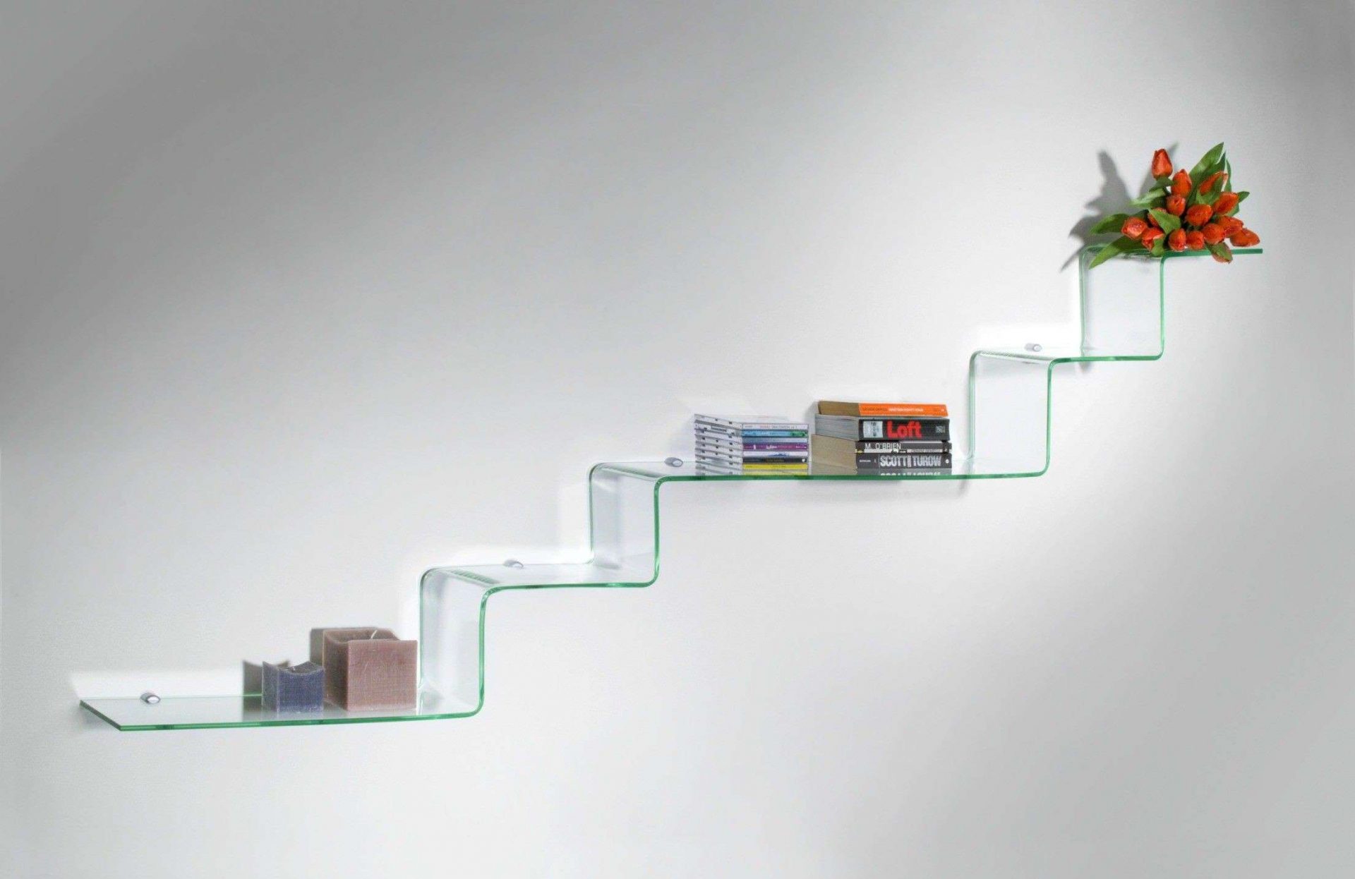 Prateleiras de vidro na parede podem ser penduradas em qualquer cômodo da sua casa. Na sala de estar flores ou uma TV estão convenientemente localizados na sala, no berçário há brinquedos com livros, no quarto há fotografias de parentes, pequenos acessórios ou uma coleção favorita de figurinhas, no banheiro há panos, sabonete, xampus, géis e na cozinha - temperos ou pratos.