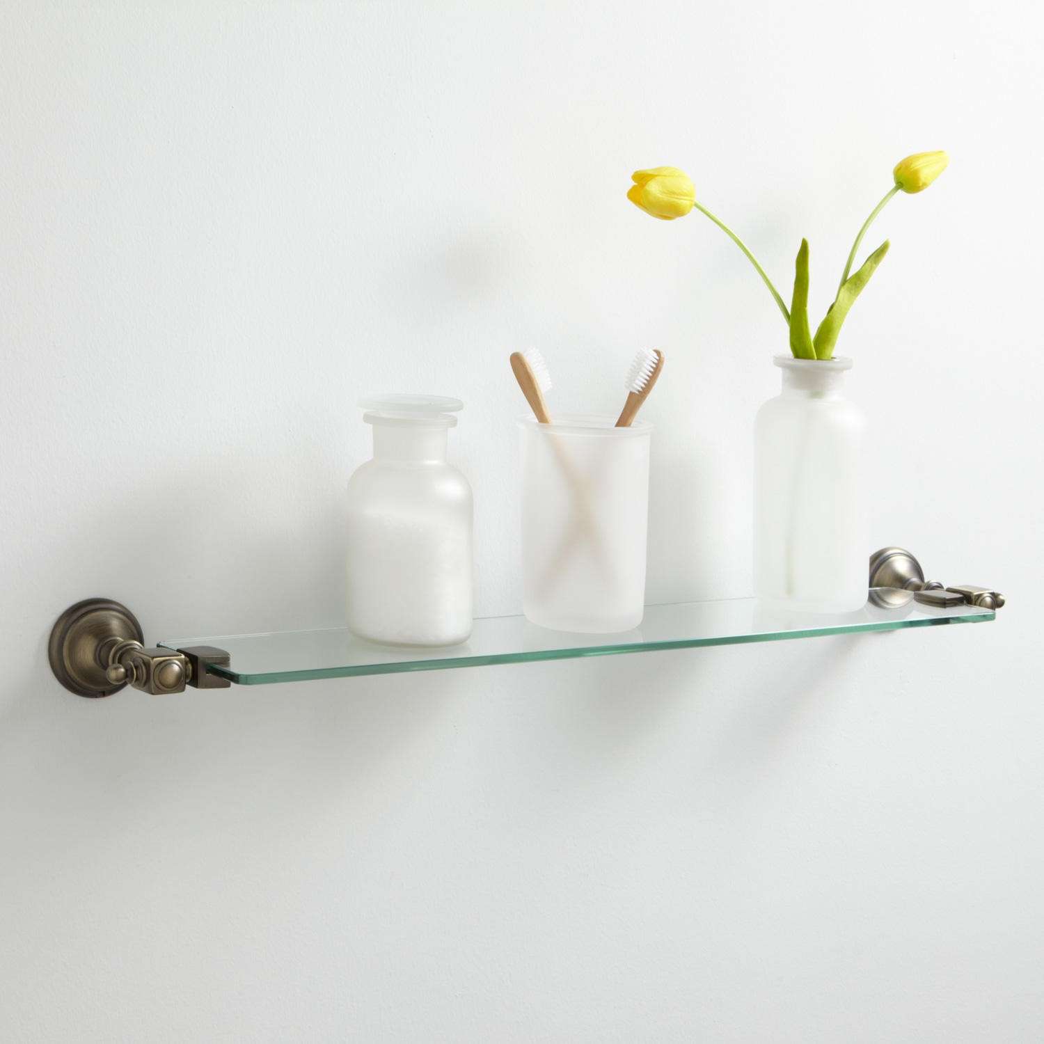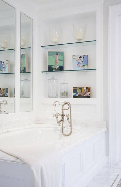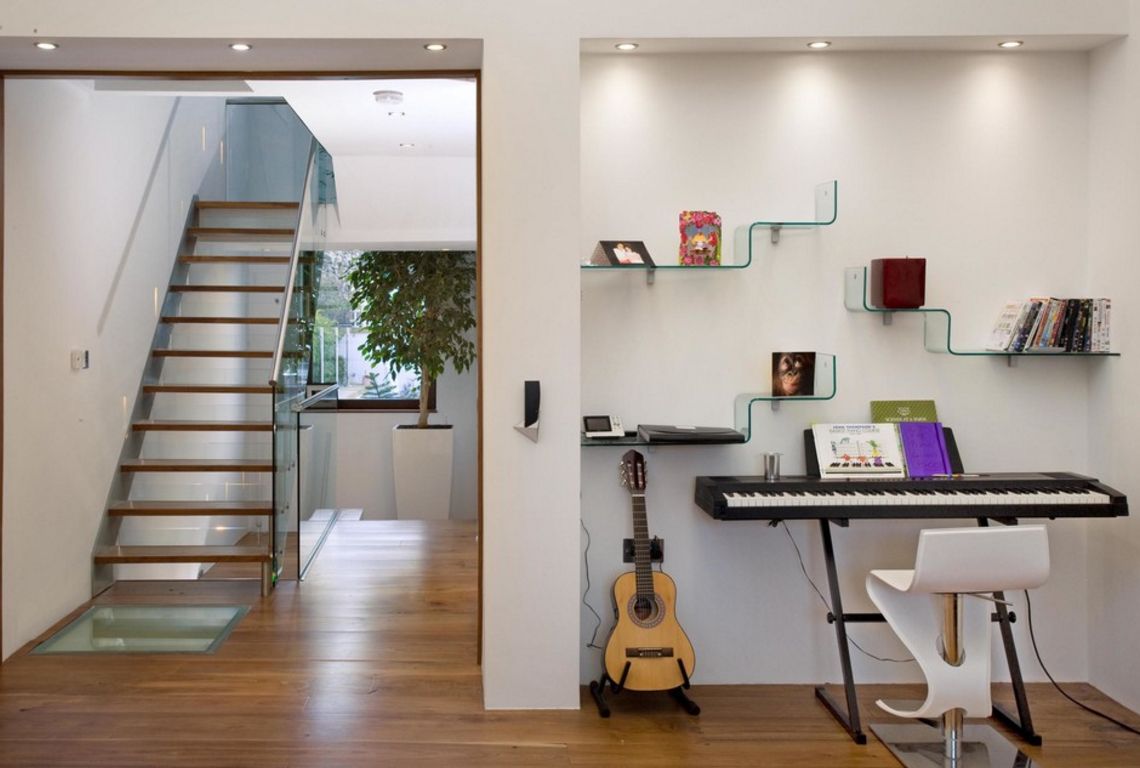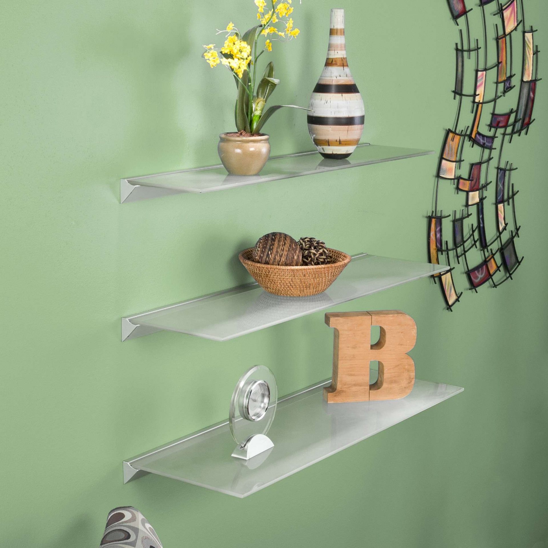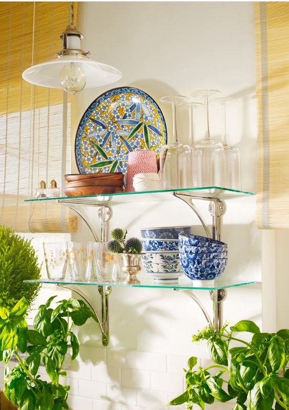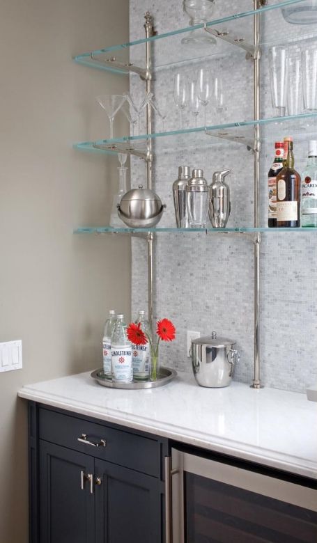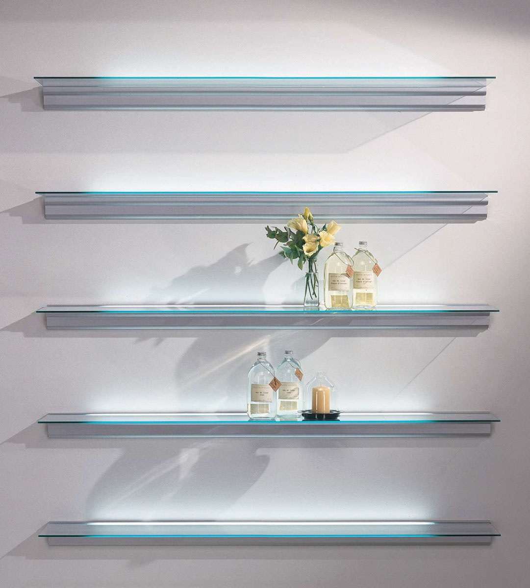 Prateleiras de vidro na parede podem ser penduradas em qualquer cômodo da sua casa. Na sala de estar flores ou uma TV estão convenientemente localizados na sala, no berçário há brinquedos com livros, no quarto há fotografias de parentes, pequenos acessórios ou uma coleção favorita de figurinhas, no banheiro há panos, sabonete, xampus, géis e na cozinha - temperos ou pratos.