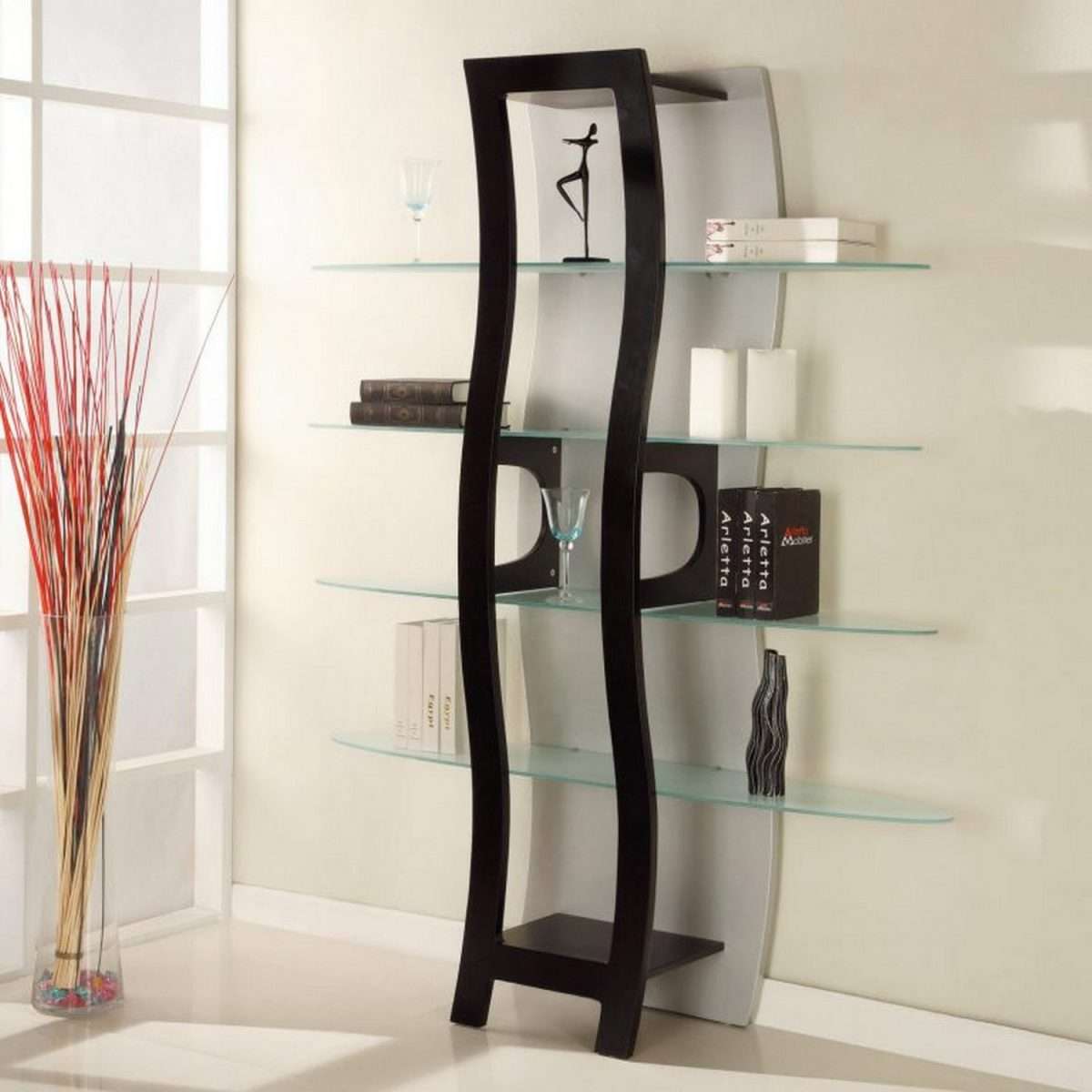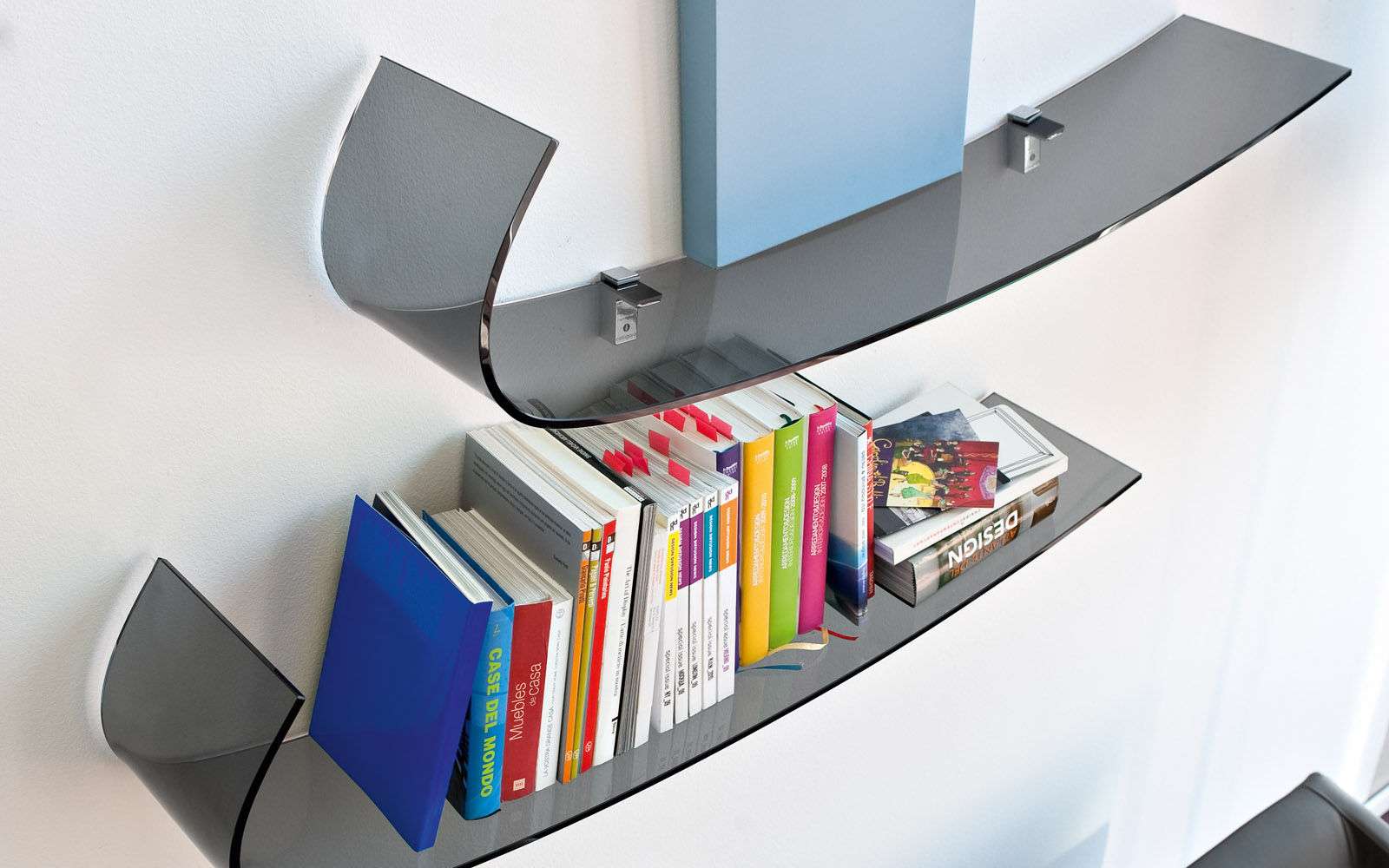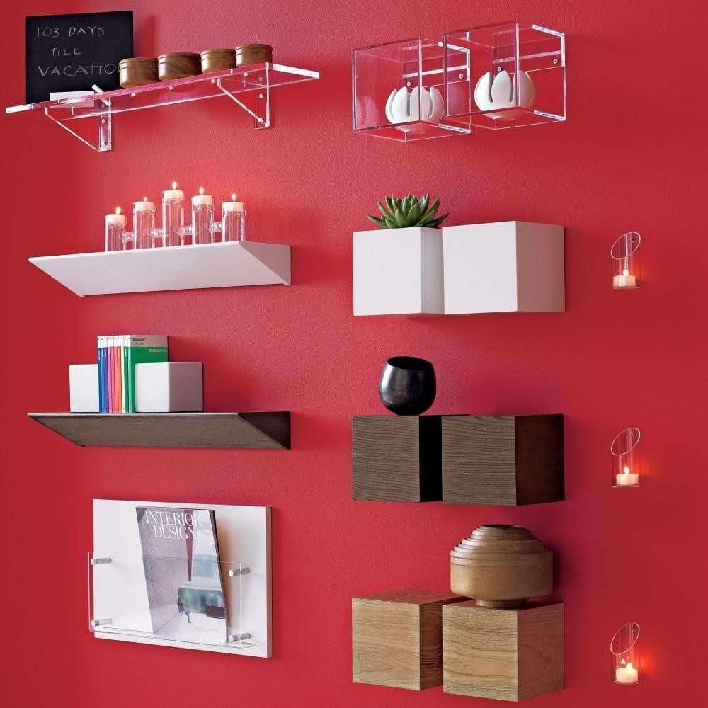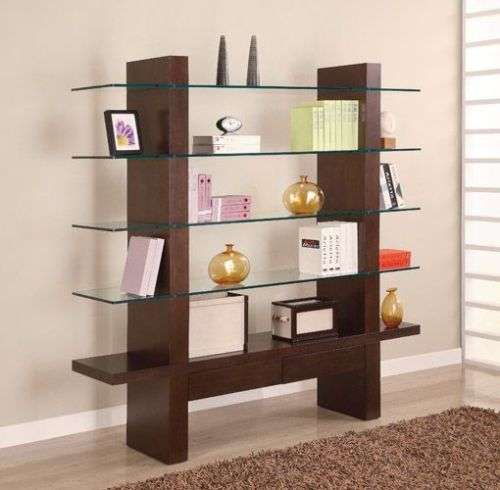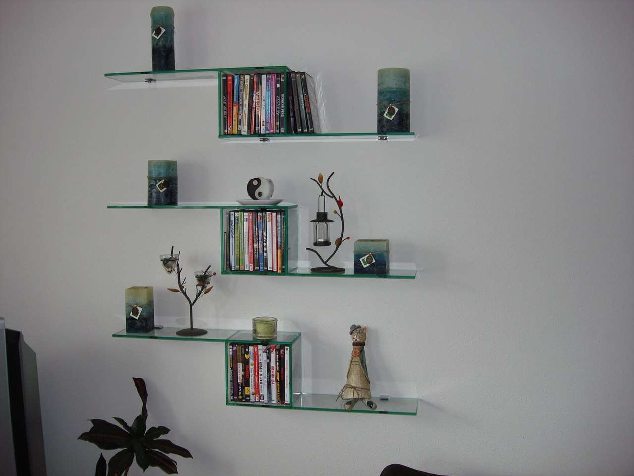 Prateleiras de vidro na parede podem ser penduradas em qualquer cômodo da sua casa. Na sala de estar flores ou uma TV estão convenientemente localizados na sala, no berçário há brinquedos com livros, no quarto há fotografias de parentes, pequenos acessórios ou uma coleção favorita de figurinhas, no banheiro há panos, sabonete, xampus, géis e na cozinha - temperos ou pratos.