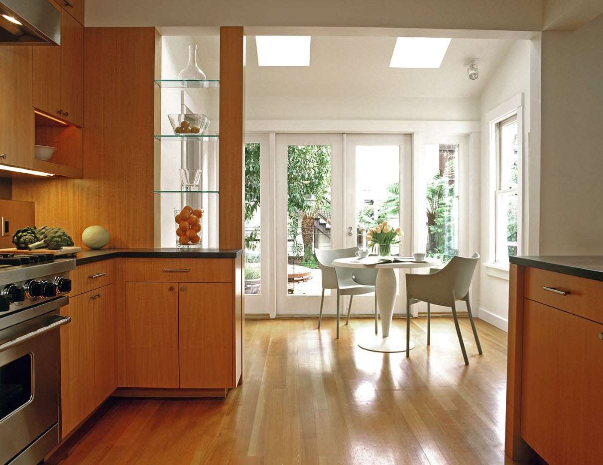 - Árvore. Por toda sua transparência, o vidro parece um material um pouco frio. A árvore ajudará a equilibrar essa impressão, tornando a impressão geral mais confortável, quente. No entanto, não é tão confiável - tem medo de umidade, não tolera queda de temperatura, pode ser destruído por fungos ou parasitas. Lave com mais força, os produtos químicos agressivos não podem ser processados. A combinação é adequada para sala de estarmas não para casa de banho ou cozinhas.