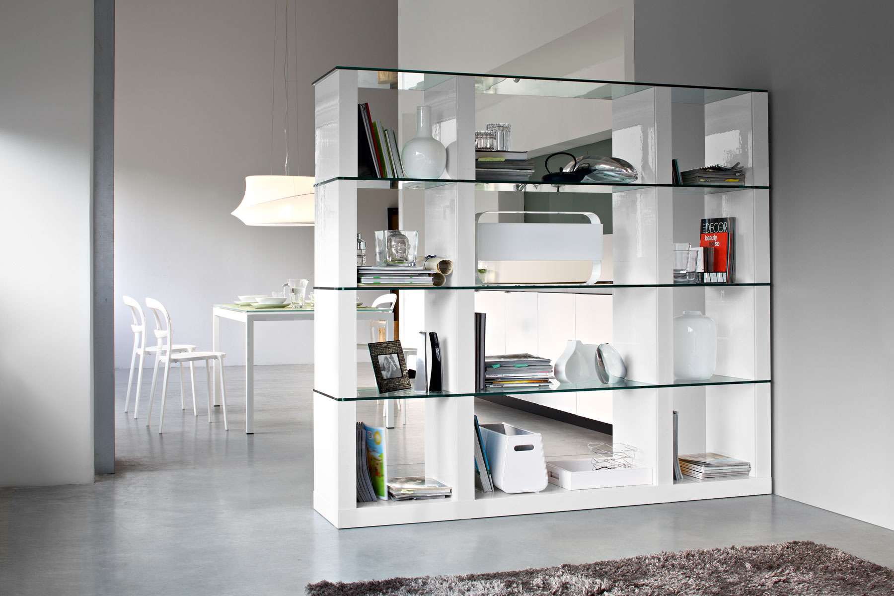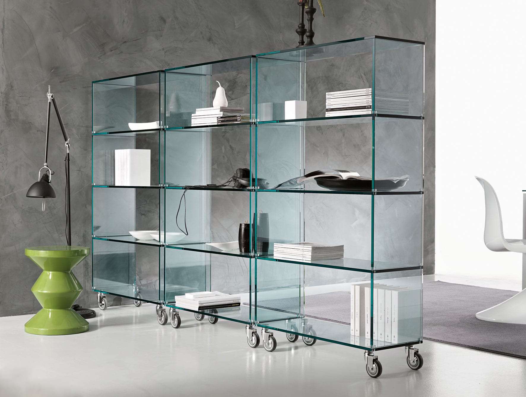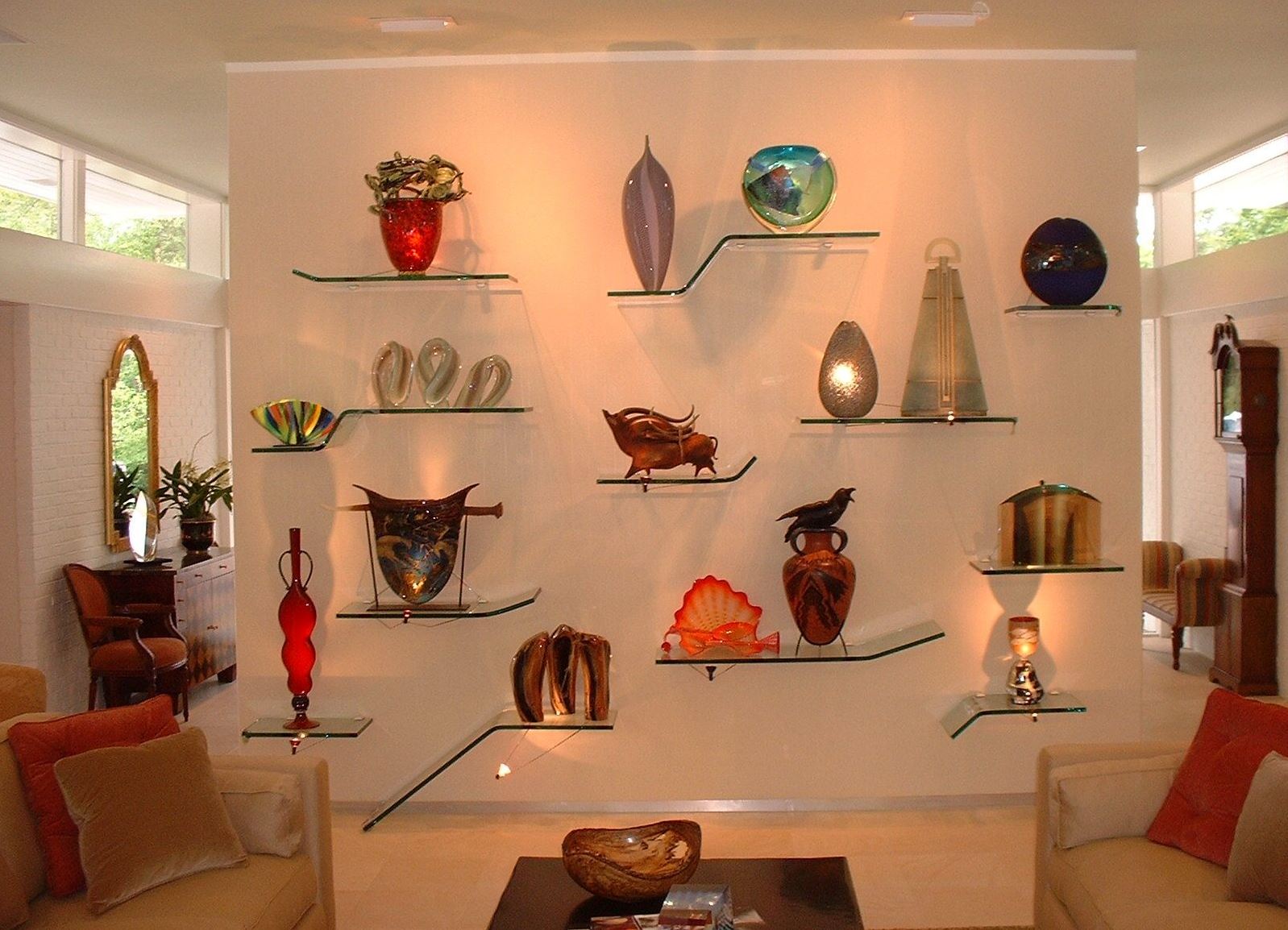 Prateleiras de vidro no interior dos quartos