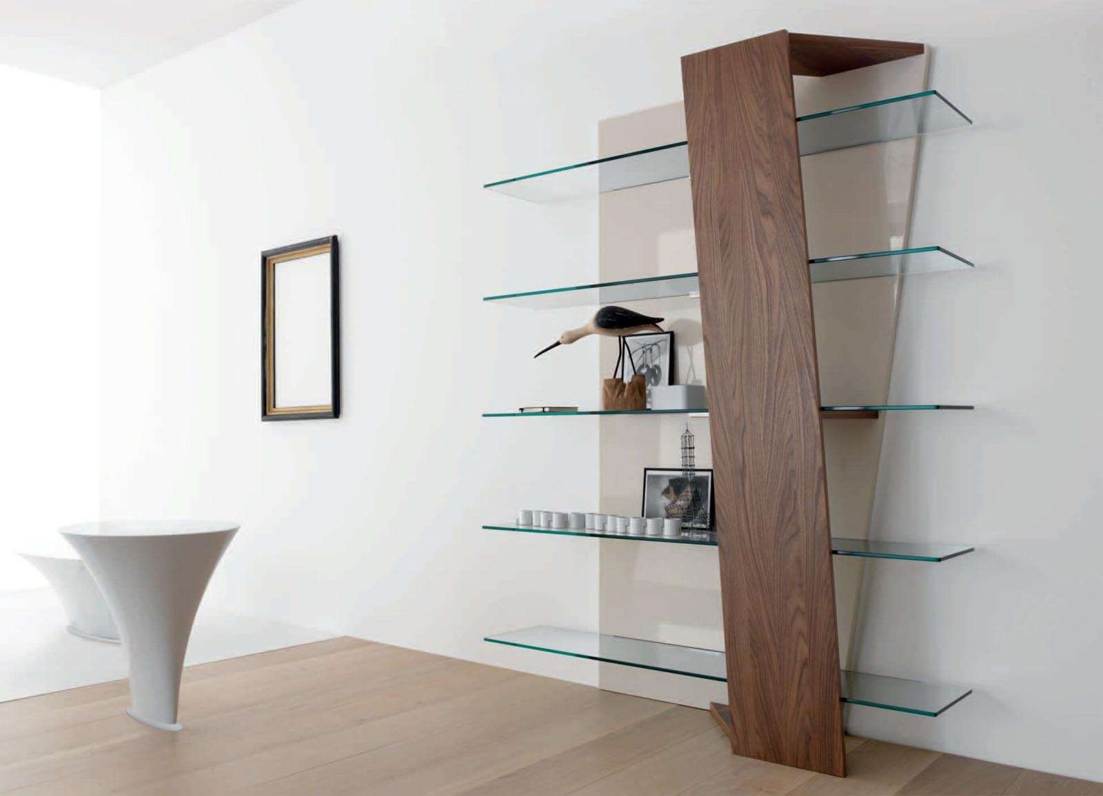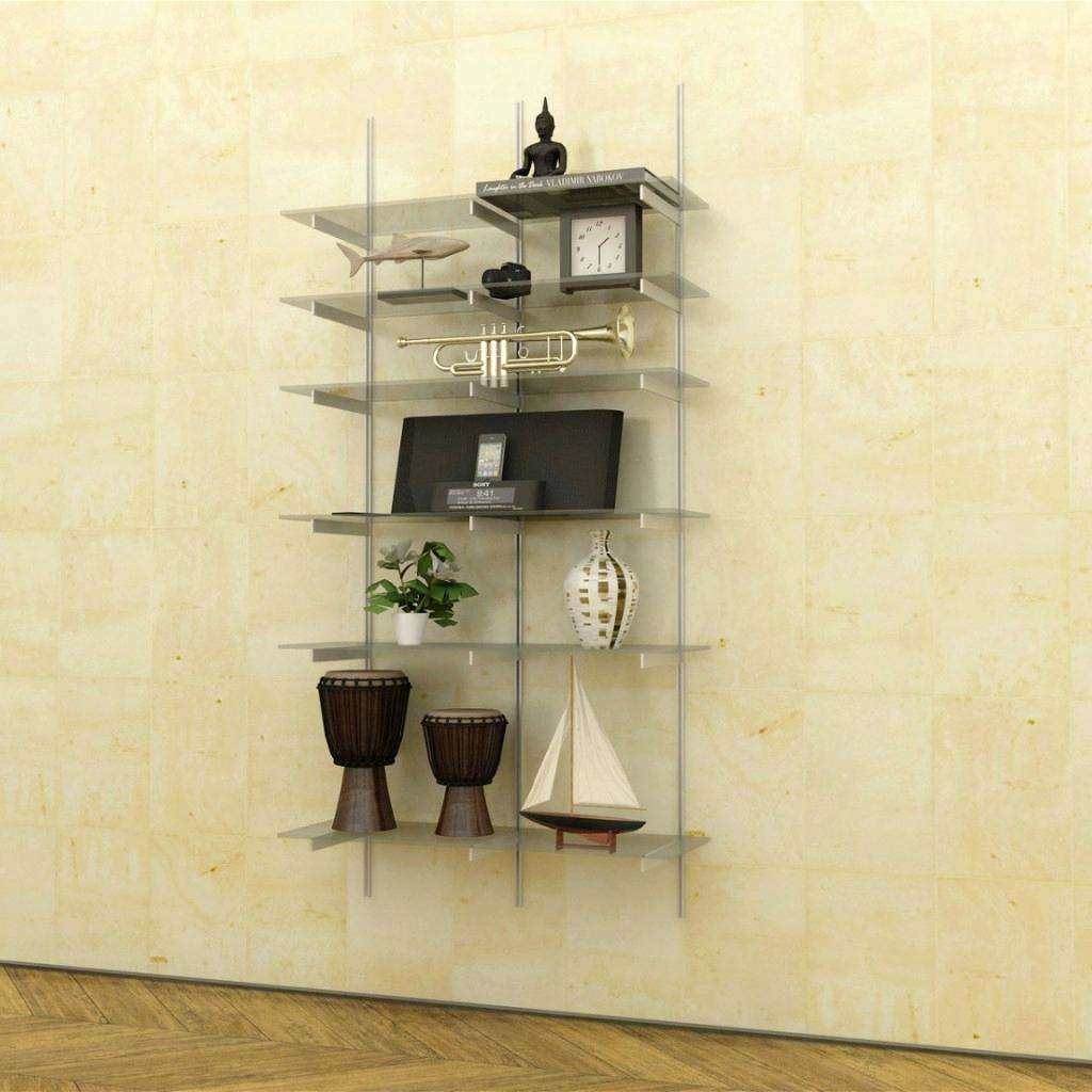 O quadro está pendurado na parede, as prateleiras estão presas a ele - isso é compreensível. Mas também há prateleiras puramente de parede, que são fixadas imediatamente na parede com a ajuda de fixações especiais, entre as quais o vidro é fixado.