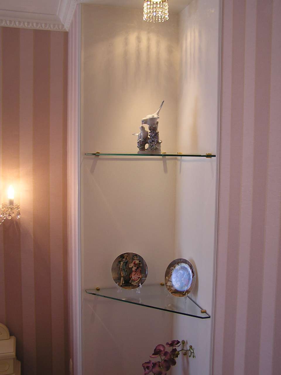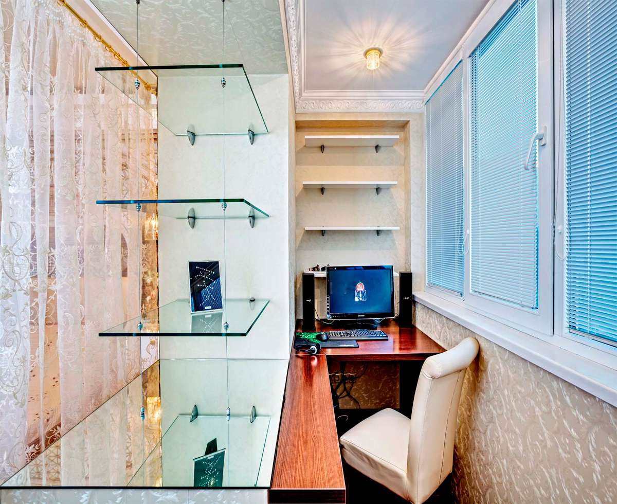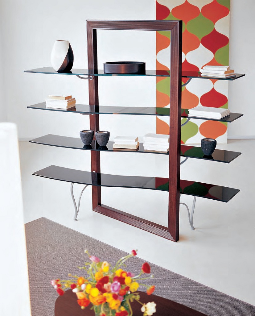 - Glass. Se o interior exigir leveza, leveza, transparência e você ainda quiser fazer prateleiras no quadro, essa opção é a mais adequada. Todas as vantagens do quadro e das prateleiras são as mesmas, a impressão geral é harmoniosa e agradável. Além disso, se você estiver pronto para gastar dinheiro, poderá solicitar um quadro de uma cor diferente ou processado de outra forma. O mais interessante é a combinação de prateleiras transparentes e moldura de vitral.