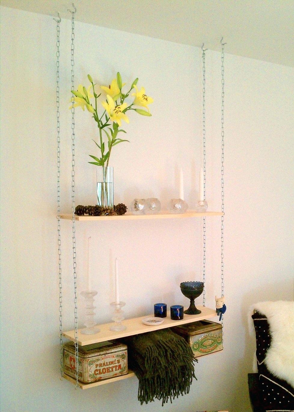 - Articulada. Parafusos são anexados à parede, uma prateleira é pendurada neles com a ajuda de uma corrente, rendas ou até mesmo uma linha de pesca. Para tamanhos grandes e pesos grandes não são adequados, porque a montagem será muito forte e, portanto, espessa - tanto que parecerá inestética.