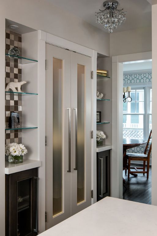 Você pode completar a imagem geral desenhando uma figura ou fazendo um vitral não nas próprias prateleiras, mas na moldura de vidro sobre a qual fixá-las. Então, será melhor visto, a impressão geral será mais sólida. No entanto, nem todos os interiores são adequados.