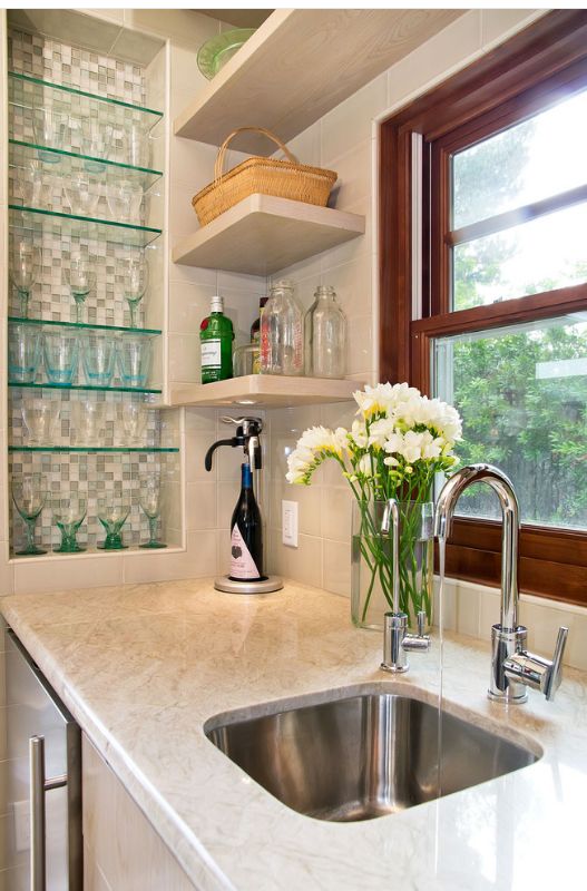 - Facilidade de atendimento. O vidro é resistente a produtos químicos agressivos - mas na maioria dos casos simplesmente não é necessário lavá-lo. Simplesmente limpe as prateleiras com um pano seco ou, se não estiverem empoeiradas, mas sujas com uma solução de sabão neutro - e elas brilham novamente. A limpeza pode ser realizada como poeira.