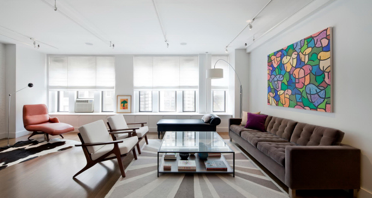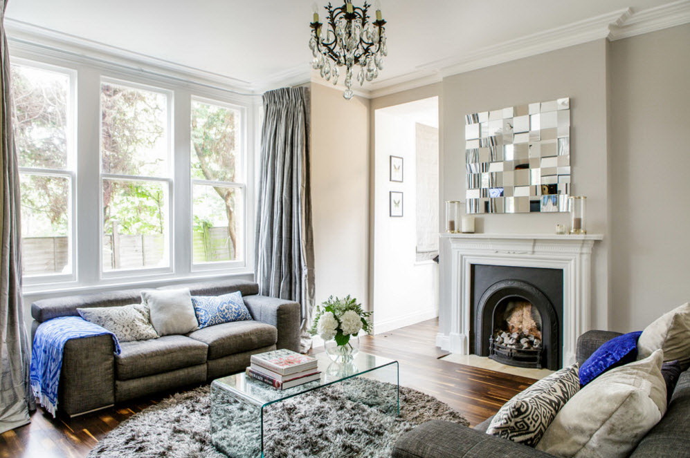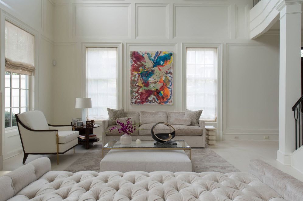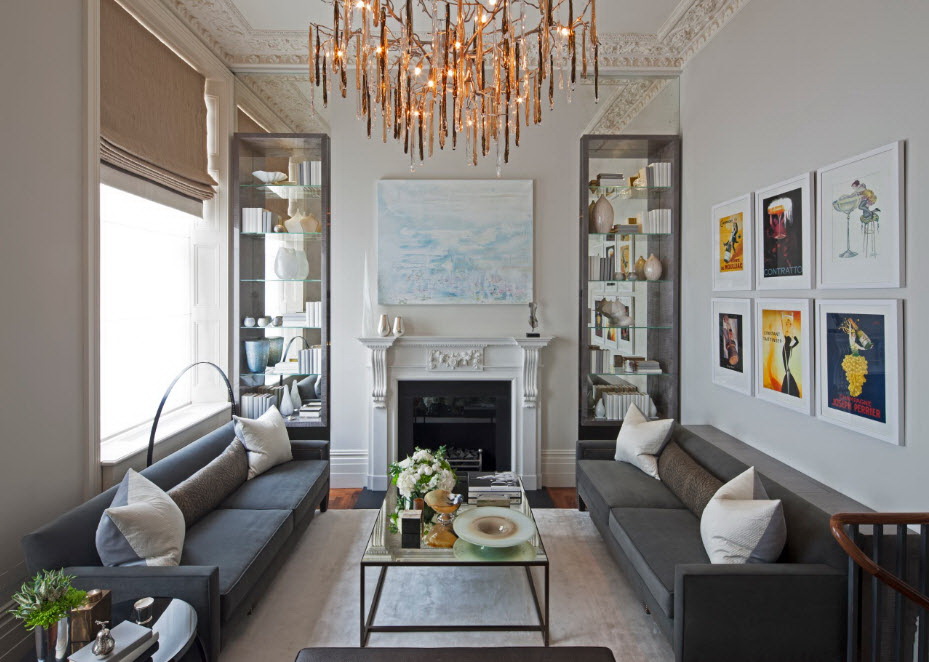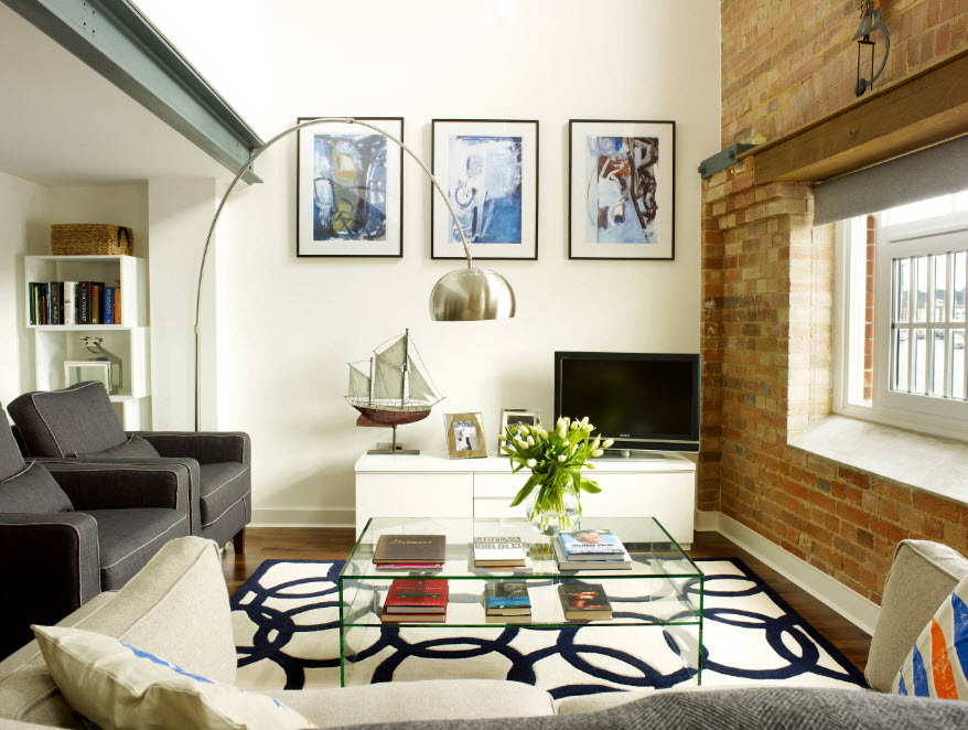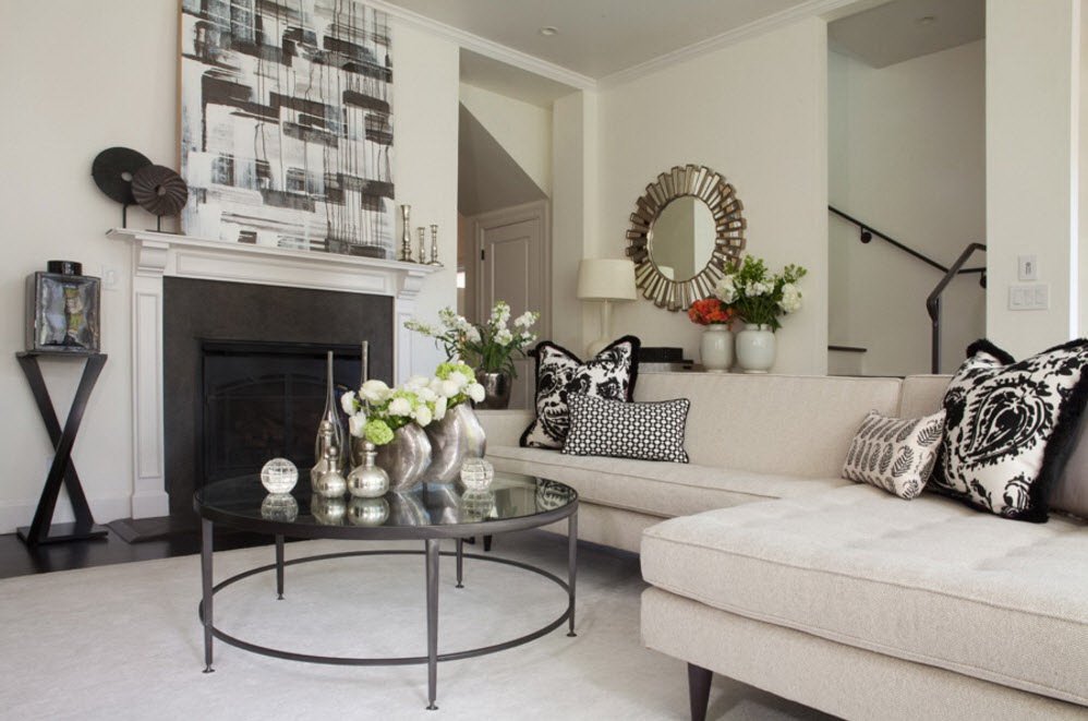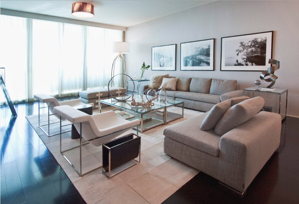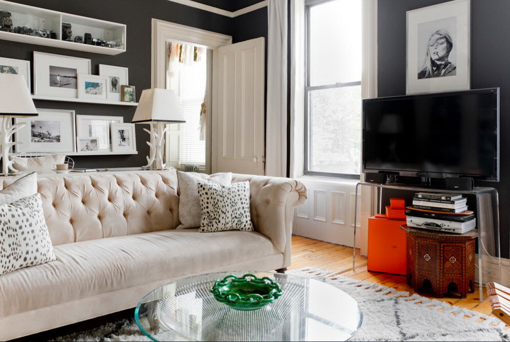 Esse mobiliário é bem complementado pelos slides que estão na moda nesta temporada, prateleiras decorativas, harmonizam bem com móveis macios. Sofás, as cadeiras escolhem com qualquer estofamento: de couro, tapeçaria e outros materiais. Vidro transparente ou fosco não entra em "conflito" com diferentes materiais.