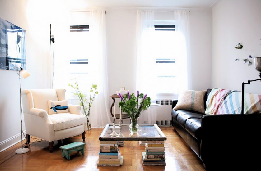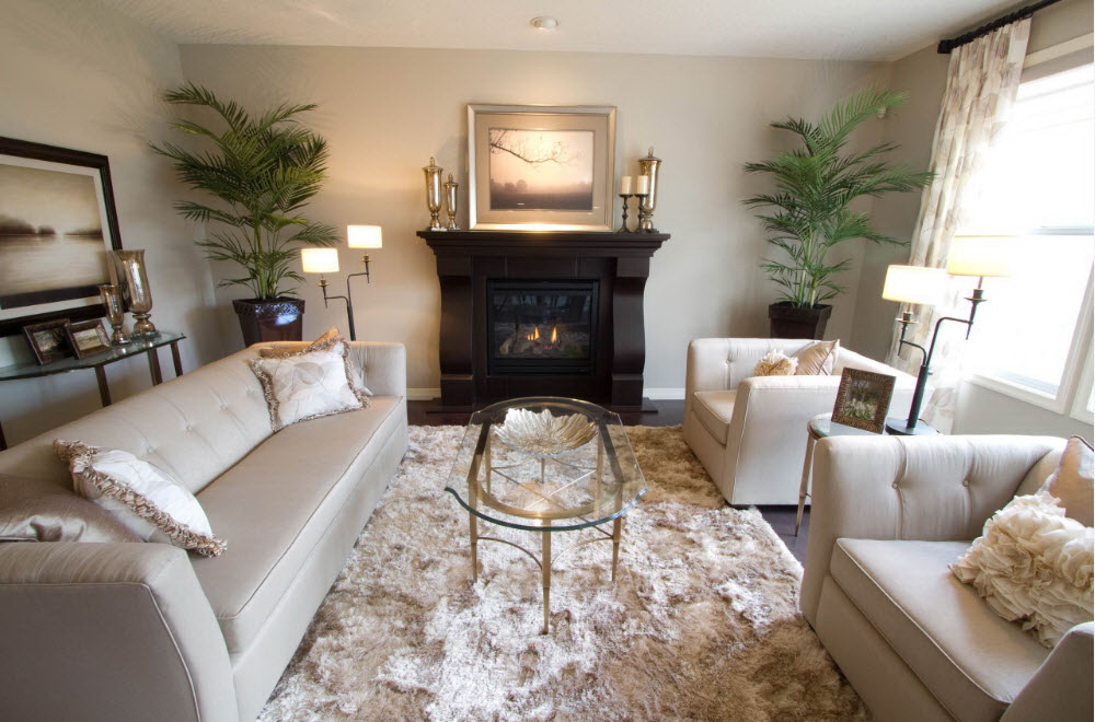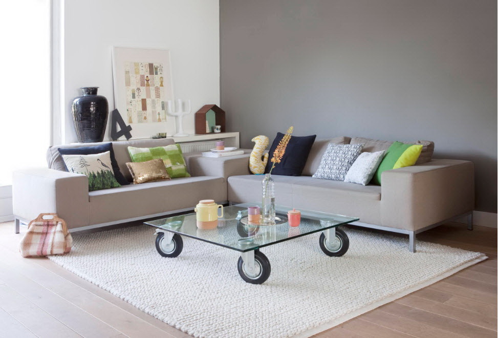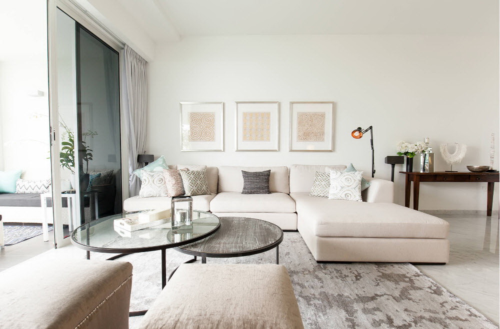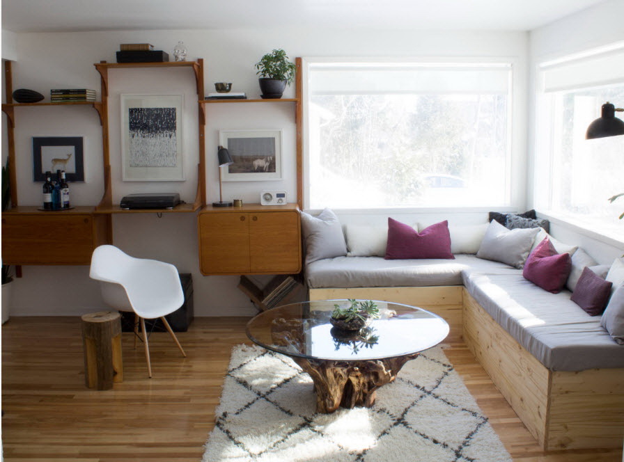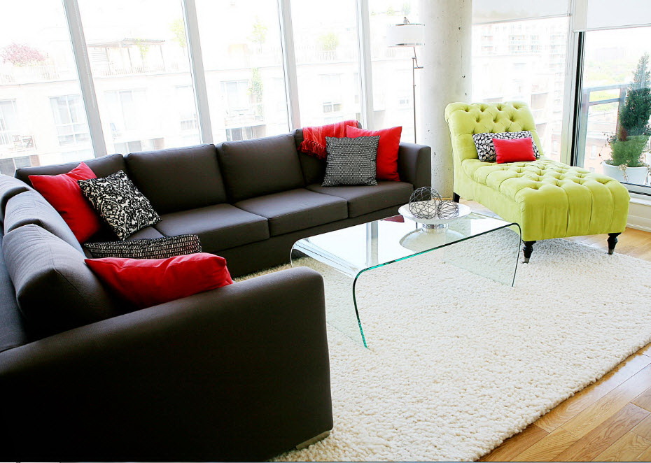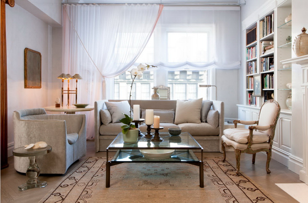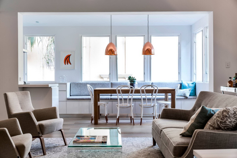 Nos quartos quadrados eles usam modelos redondos e retangulares, que se tornam o centro da área de recreação. Tal mobília não sobrecarrega o espaço, é leve, elegante.