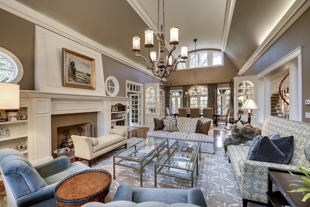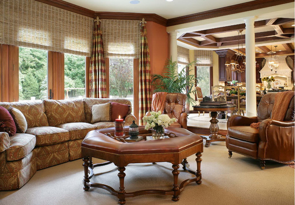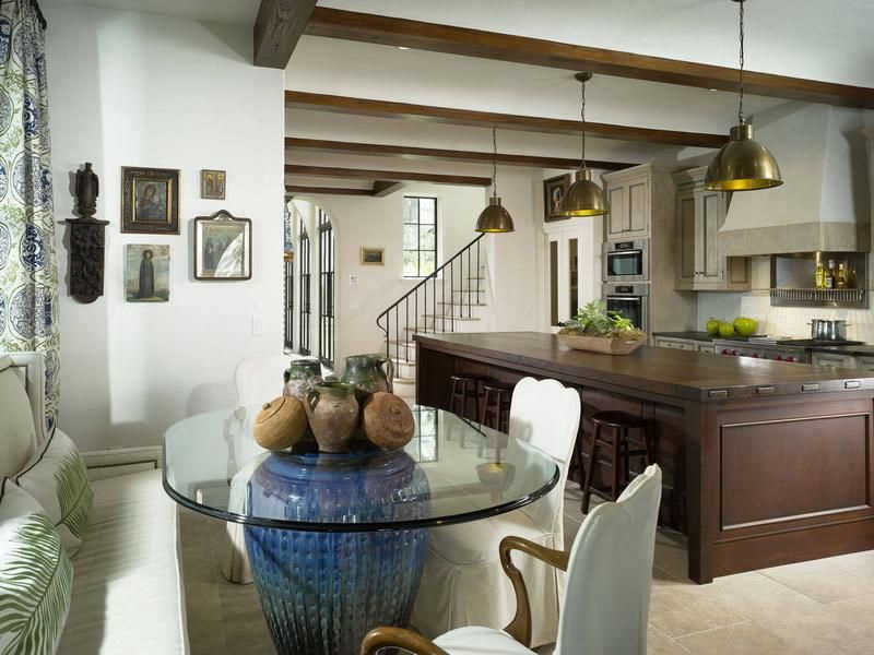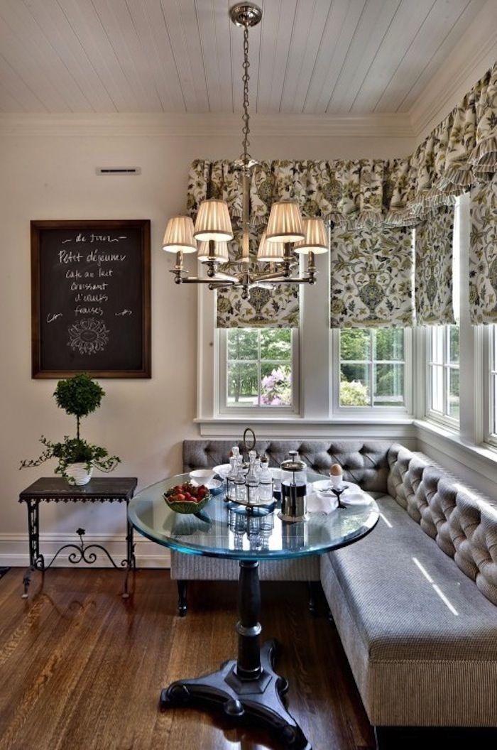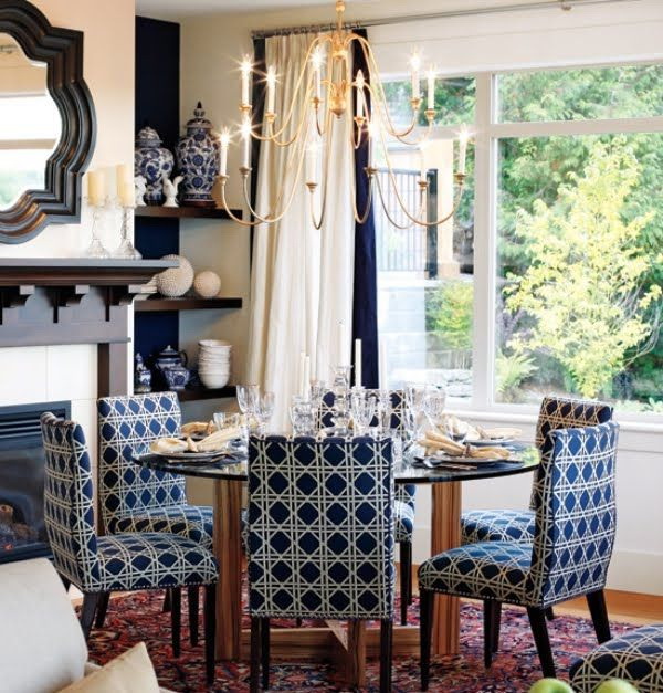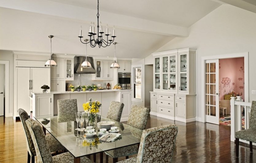 Mesas com pernas de madeira complementam as mesmas cadeiras. Para um interior clássico, encomende capas para cadeiras que estejam em harmonia com os guardanapos e os estofos dos sofás.